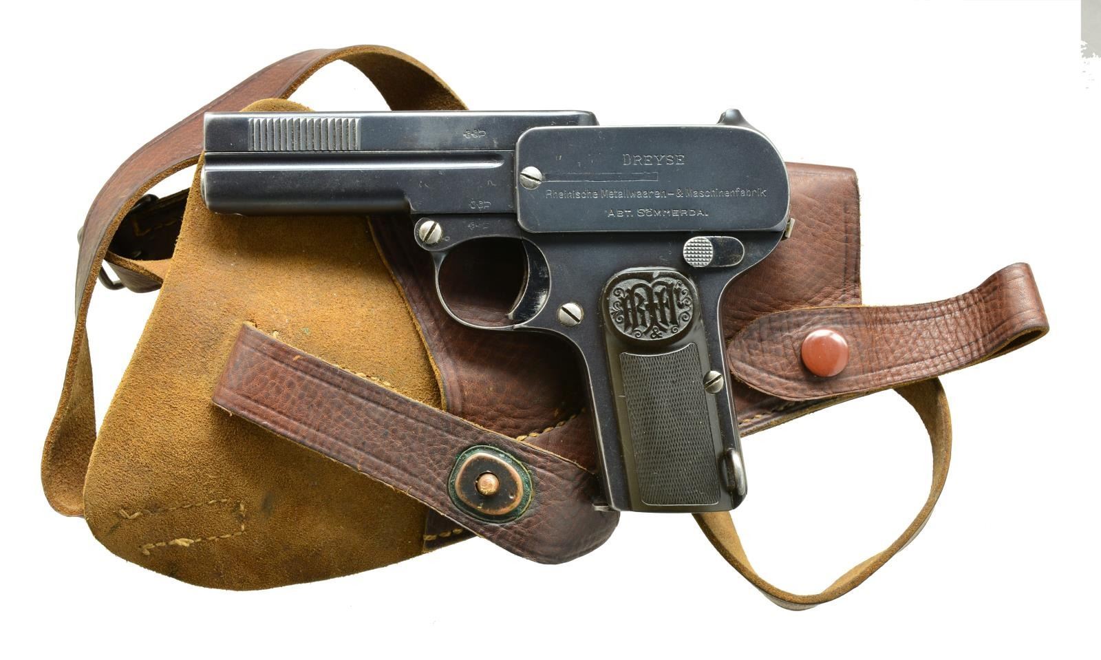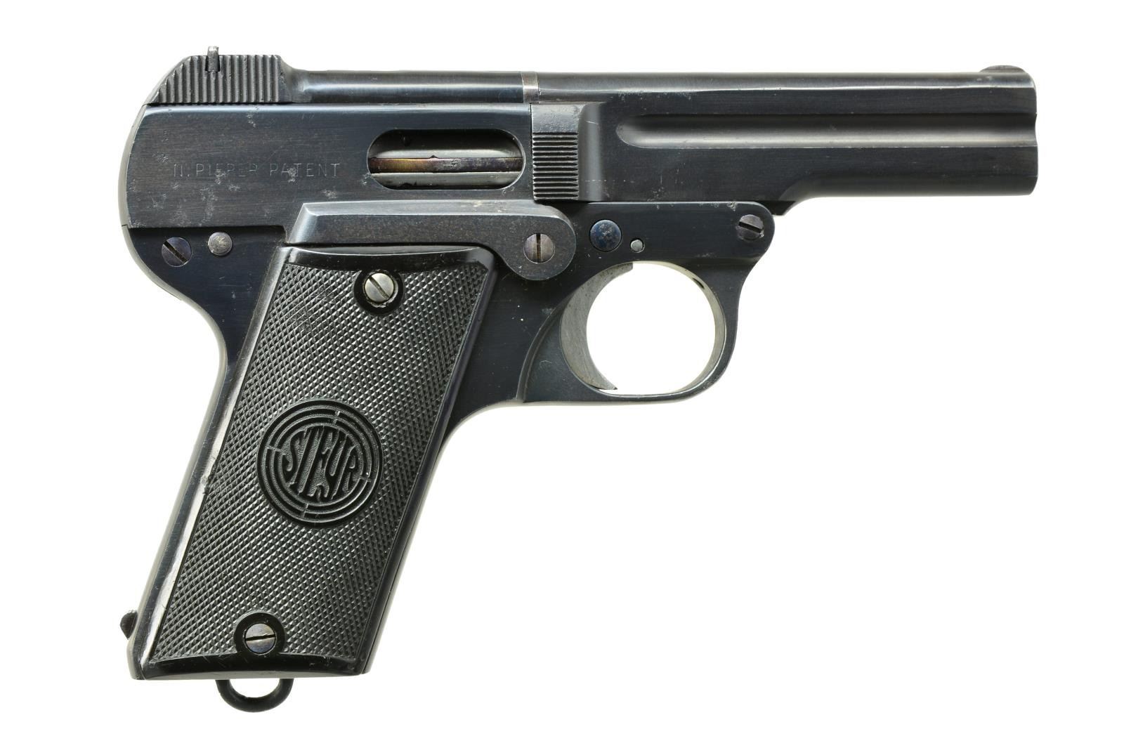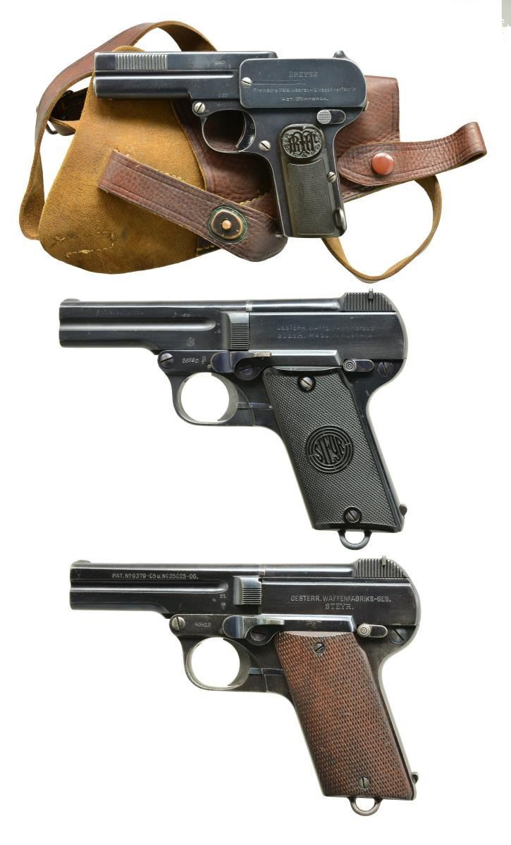 1) DREYSE M1907 SEMI AUTO. Cal. 32 Auto. S# 10624. Bbl. 3 1/2". Pistol marked w/ Dreyse information on left. Fitted w/ black hard rubber grips w/ "R M&M" logos. MAGS: 1-8 shot. UNATTACHED ACCESSORIES: unmarked well made brown leather holster. CONDITION: fine. Retaining approx. 80% original blue. Silvering on high edges. Shiny bore. Mechanically good. Holster good w/ rubs to dark brown. (21-1568/MGM). 2) STEYR PIEPER M1908 SEMI AUTO PISTOL. Cal. 32 ACP. S# 56890. Bbl. 3 1/2". Bottom mag. release at rear of grip. Bbl. tips down for cleaning. Black hard rubber grips marked "Steyr". MAGS: 1. CONDITION: fine as refurbished. Retaining nearly all factory type reblue. Markings very thin from repolishing. Grips w/ a few minor dings & marks. Bore w/ good rifling, frosted throughout. Mechanically good. Magazine # matches pistol. (21-1570/MGM). 3) STEYR PIEPER M1908 SEMI- AUTO PISTOL. Cal. 7.65mm. S# 43413. Bbl. 3 1/2". Magazine release at rear grip strap. Checkered wooden grips. Temper blued sm. parts. MAGS: 1 numbered. CONDITION: fine. Retaining 70-80% original blue. Fading overall. Fine bore. Mechanically fine. (21-1572/MGM). ALL CURIO. $600-900.