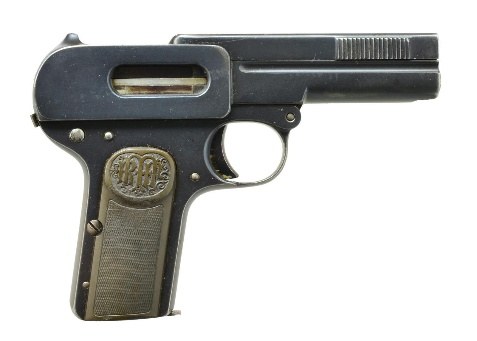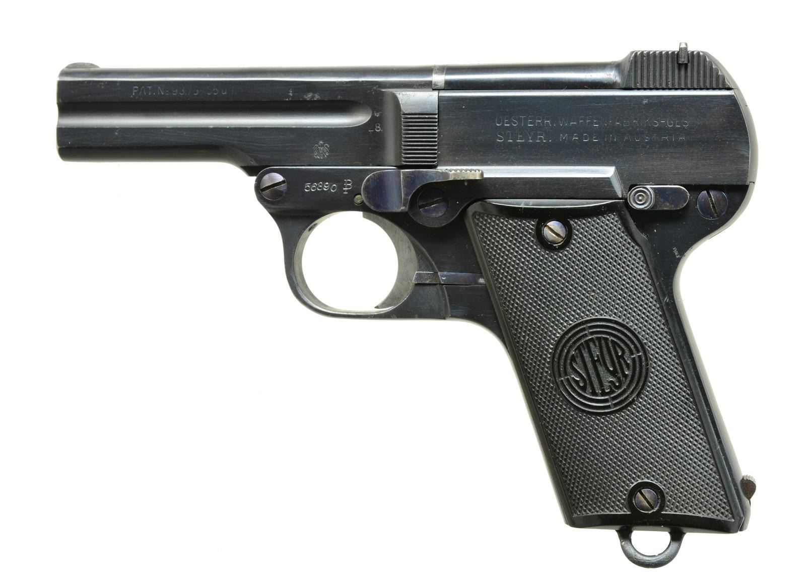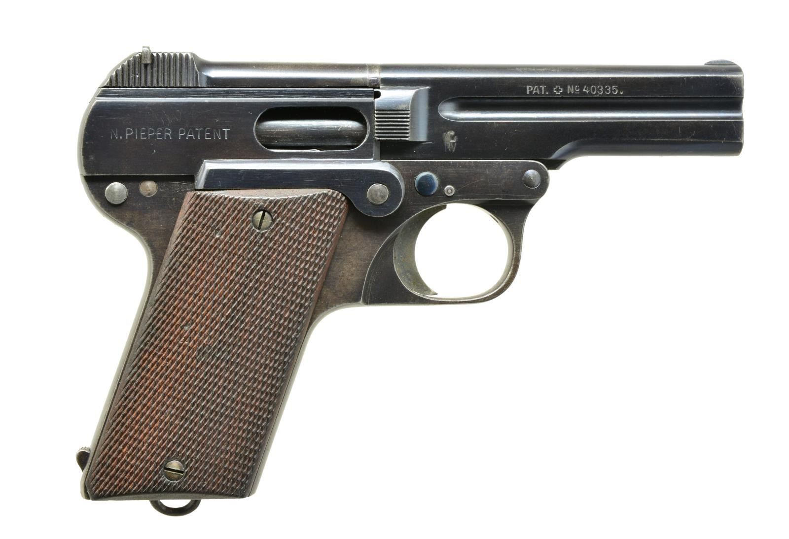1) DREYSE M1907 SEMI AUTO. Cal. 32 Auto. S# 10624. Bbl. 3 1/2". Pistol marked w/ Dreyse information on left. Fitted w/ black hard rubber grips w/ "R M&M" logos. MAGS: 1-8 shot. UNATTACHED ACCESSORIES: unmarked well made brown leather holster. CONDITION: fine. Retaining approx. 80% original blue. Silvering on high edges. Shiny bore. Mechanically good. Holster good w/ rubs to dark brown. (21-1568/MGM). 2) STEYR PIEPER M1908 SEMI AUTO PISTOL. Cal. 32 ACP. S# 56890. Bbl. 3 1/2". Bottom mag. release at rear of grip. Bbl. tips down for cleaning. Black hard rubber grips marked "Steyr". MAGS: 1. CONDITION: fine as refurbished. Retaining nearly all factory type reblue. Markings very thin from repolishing. Grips w/ a few minor dings & marks. Bore w/ good rifling, frosted throughout. Mechanically good. Magazine # matches pistol. (21-1570/MGM). 3) STEYR PIEPER M1908 SEMI- AUTO PISTOL. Cal. 7.65mm. S# 43413. Bbl. 3 1/2". Magazine release at rear grip strap. Checkered wooden grips. Temper blued sm. parts. MAGS: 1 numbered. CONDITION: fine. Retaining 70-80% original blue. Fading overall. Fine bore. Mechanically fine. (21-1572/MGM). ALL CURIO. $600-900.