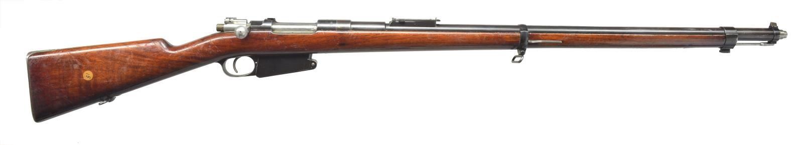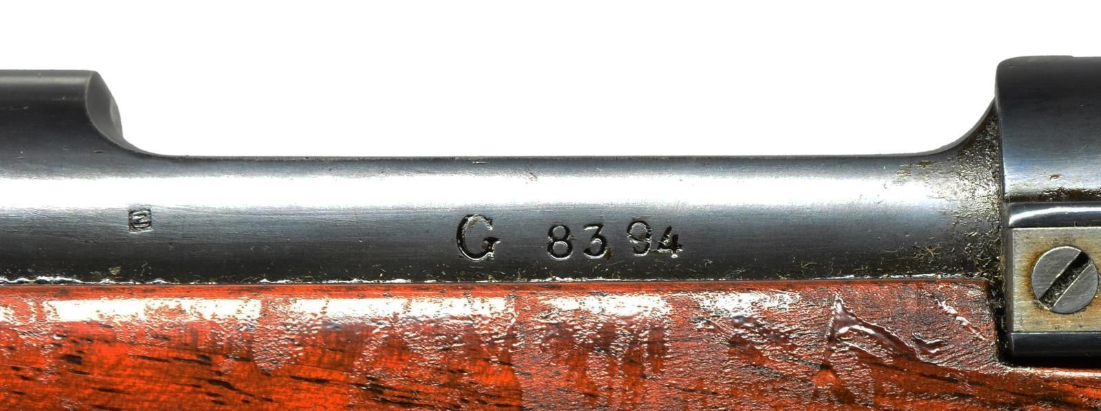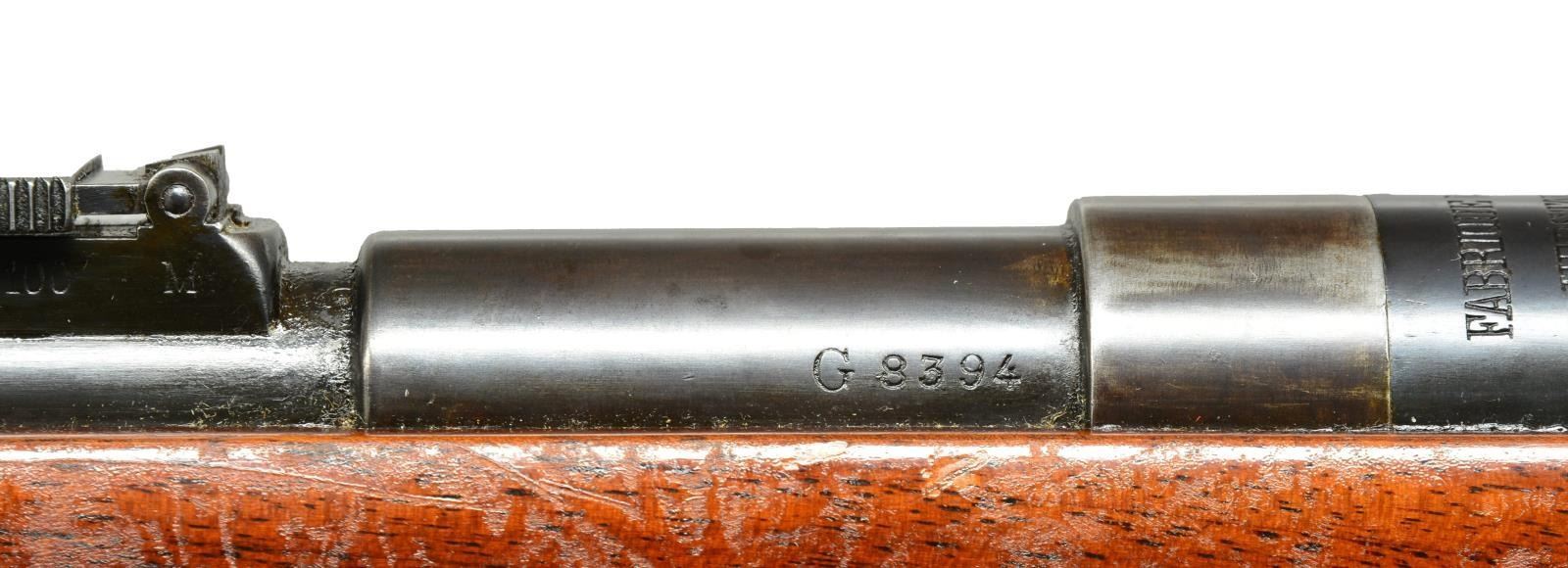RIFLE. Cal. 7.65 Belgian Mauser. S# G8394. Bbl. 30 3/4". All visible numbers match except cleaning rod. Receiver ring marked "FABRIQUE NATIONALE HERSTAL-LIEGE". Straight bolt handle. Ladder rear sight graduated to 1900m. Inverted "V" front sight. Cleaning rod & bayonet lug are present. Walnut stock marked only w/ S#. Buttplate marked on tang w/ "M" & "5264" in addition to matching S# at rear. CONDITION: stock set has added lacquer finish as a preservative over professional restoration which has obscured marking roundel on right side of butt. Finish has wear, flaking & scratches. Metal has 70% original blue finish w/ thinning & wear, turning gray. Bbl. jacket has several notable sm. dents on top between bbl. bands. Good bore w/ lightly worn lands. (01-19364/RW). ANTIQUE. $1,500-2,000.