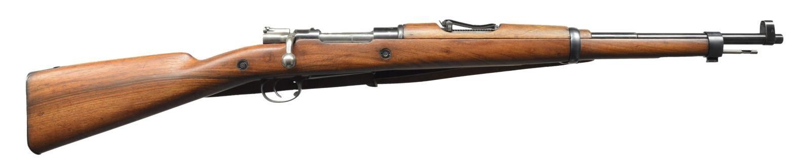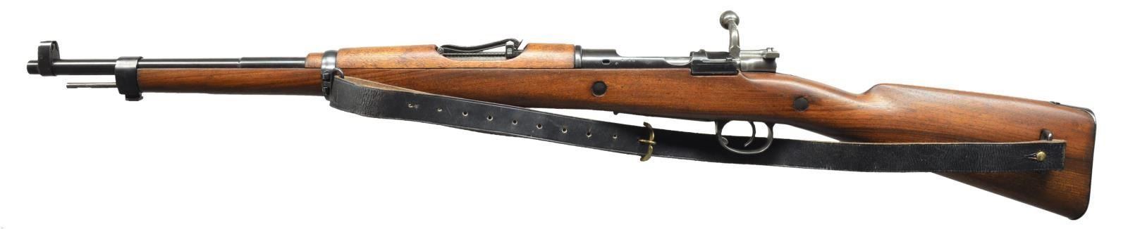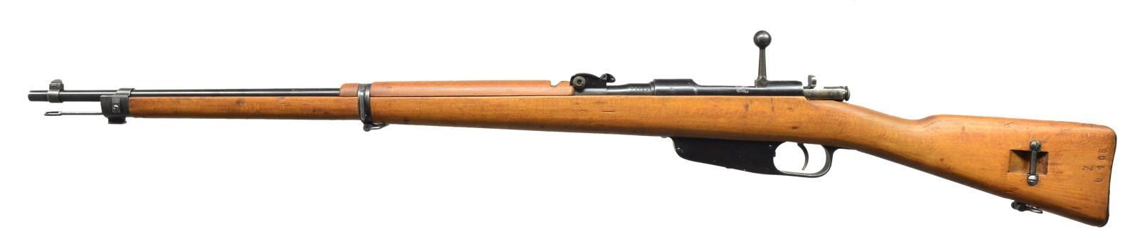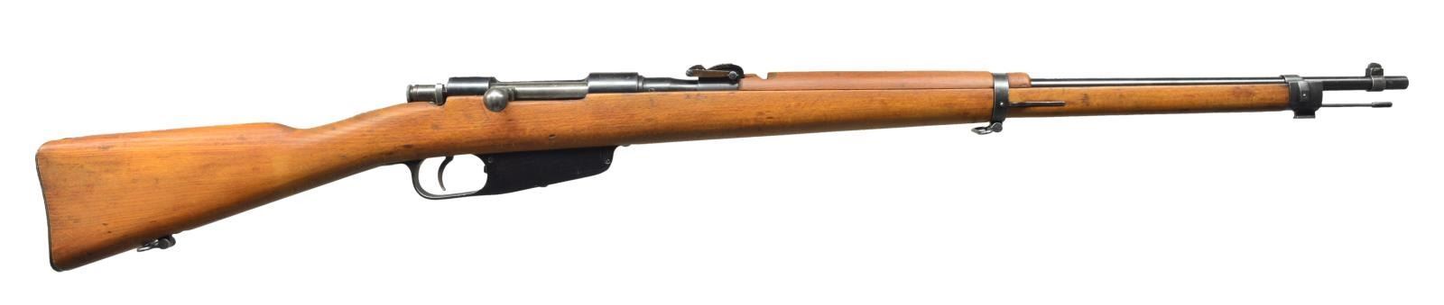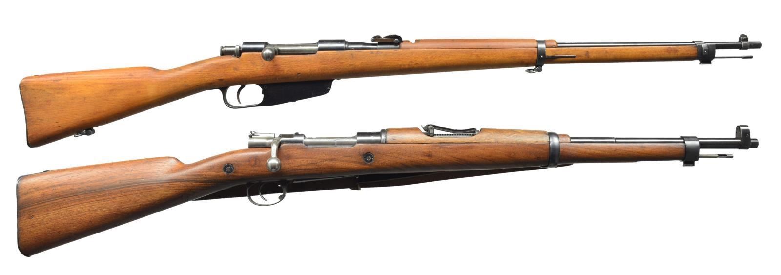 1) Cal. 6.5mm Italian. S# Z6105. Bbl. 27 1/4". Number matches on bbl. & buttstock. Straight bolt handle. Open rear sight adj. to 1000m. Inverted "V" front sight. Bbl. marked on top over chamber w/ boxed "FAT" "(royal crown)" & "42". Cleaning rod is present. Provision for side & bottom slings. Hardwood stock set. Buttstock is marked on left side w/ faint circular Terni marking. CONDITION: stock set has large degree of original finish w/ thinning, staining & light wear. Small crack behind receiver tang. Metal has 75% original thinning blue w/ light wear & notable small area of pitting on left receiver rail. Very good shiny bore. (21-997/RW). 2) Cal. 7x57 Mauser. S# A268. Bbl. 22". Numbers match on receiver, bolt & trigger guard. Scarce early version of Spanish Model 1916 short rifle w/ "Lange Vizier" rear sight. Receiver is marked on top w/ partially obscured Fabrica De Armas Oviedo & dated 1??9. Rear sight graduated to 2000m. Inverted "V" front sight w/ protective ears. Cleaning rod & bayonet lug are present. Side swivels w/ period leather sling. Milled trigger guard w/ hinged floorplate. Nonmatching walnut stock set. CONDITION: wood & metal have high percentage of arsenal rework type finish w/ very light wear & scattered handling marks. Lower band is insecure. Fair, worn bore retains a degree of shine. (21-1000/RW). BOTH CURIO. $600-900.