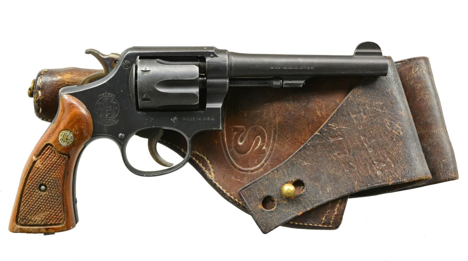 Cal. 38 S&W. S# V515353. Bbl. 5" pinned. Variation of US Victory model that was originally for US military use in 38 Spl. cal. Mfg. for British use chambered for their 38-200 cartridge which was 38 S&W w/ 200 gr. bullet. Also called Model K-200. Mfg. w/in US Victory S# range for Lend Lease program. Frame has US "P" proof. Top strap has flaming bomb followed by "U. S. PROPERTY G.H.D."; GHD is US inspector. Matching numbered cyl. & extractor; unnumbered bbl. Sand blast black magic finish. Lanyard swivel in butt. Early 5 Screw frame having standard case colored trigger & hammer. Originally w/ smooth oiled grips; presently w/ late production unnumbered checkered walnut Magna grips. Top of backstrap stamped "K90"; likely service inventory#. UNATTACHED ACCESSORIES: "G.&K. /1917 / A.G." marked US flap holster w/ "I.A.4. / 182" stamped into flap portion w/ lg. characters. Standard US in oval on front. Intended for different revolver, so added hole in strap to secure over brass stud. Capped bottom of holster w/ brass stud & lanyard ring. Good general appearance w/ typical scuffs & verdigris around brass. CONDITION: good general appearance w/ typical high point wear & occasional peppery oxidation showing mostly on trigger & backstrap. Good left grip, fair right w/ numerous marks in checkering area. Near excellent bore. (20-1849/NW). CURIO. $300-450.