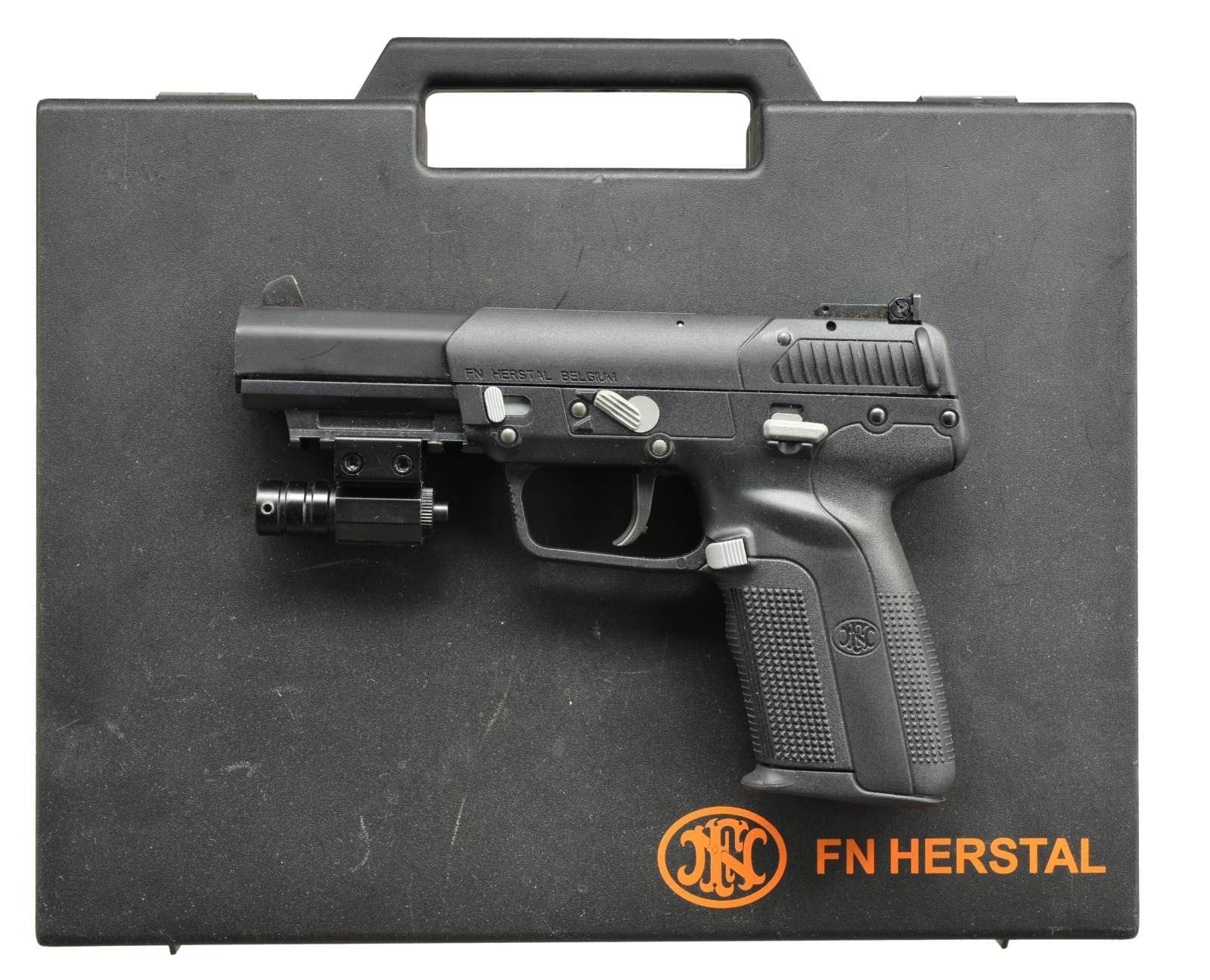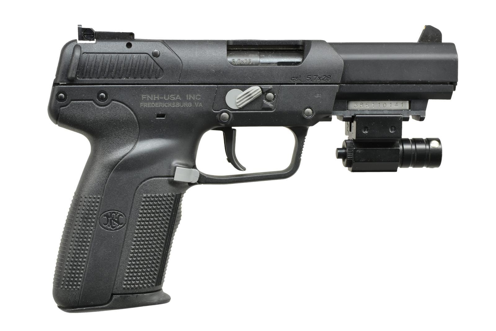 Cal. 5.7x28. S# 386110141. Bbl. 4 3/4". of cold hammer forged stainless steel w/ chrome lined chamber & bore. Polymer encased steel slide. 3 Dot night sights. Black polymer frame w/ integral grips. Red dot laser mounted on bottom accessory rail. MAGS: 7 detachable 20 rd. UNATTACHED ACCESSORIES: original black molded box containing cleaning kit, trigger lock, owner's manual & fired cartridge. CONDITION: near excellent w/ no visible finish wear. Near excellent bore. (21-616/DS). MODERN. $700-1,100.