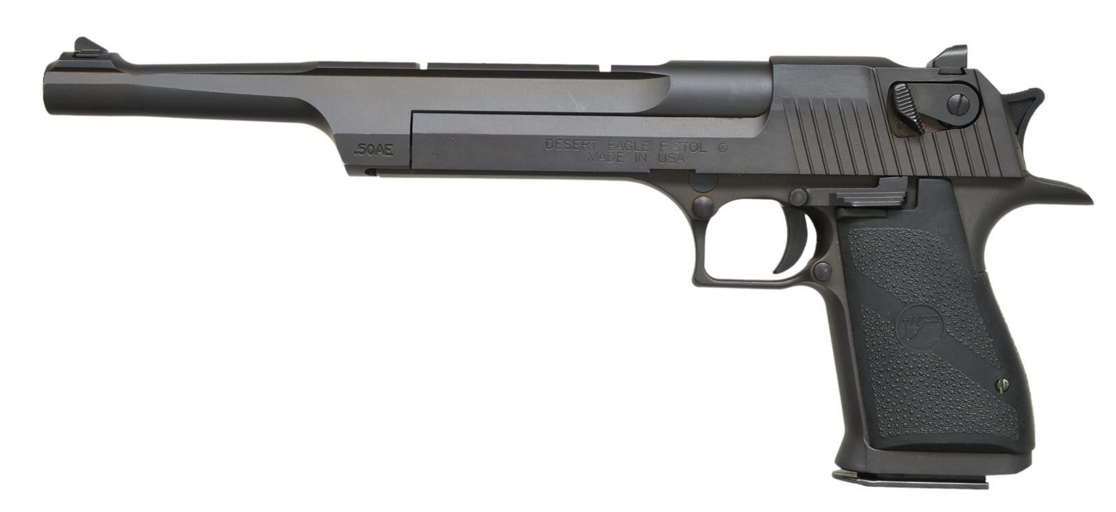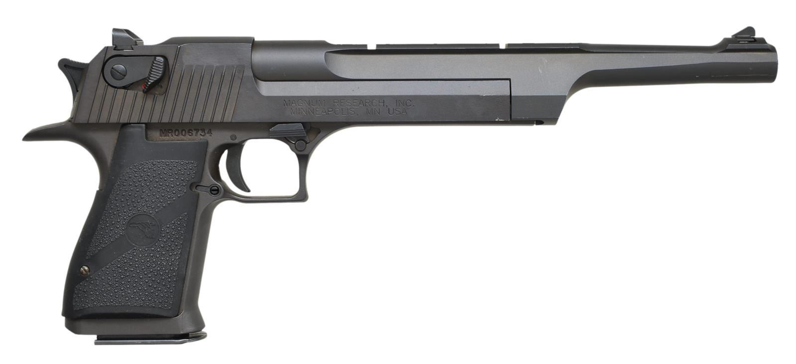 PISTOL. Cal. 50 AE. S# MR006734. Bbl. 10" w/ picatinny top rail. Serrated ramp front sight w/ fixed square notch rear sight. Matte black finish. Wrap around rubber grips. MAGS: 1 detachable 7 rd. mag. CONDITION: near excellent retaining over 98% finish showing light edge wear on slide & bbl. Bright near excellent bore. (21-614/DS). MODERN. $1,000-1,350.