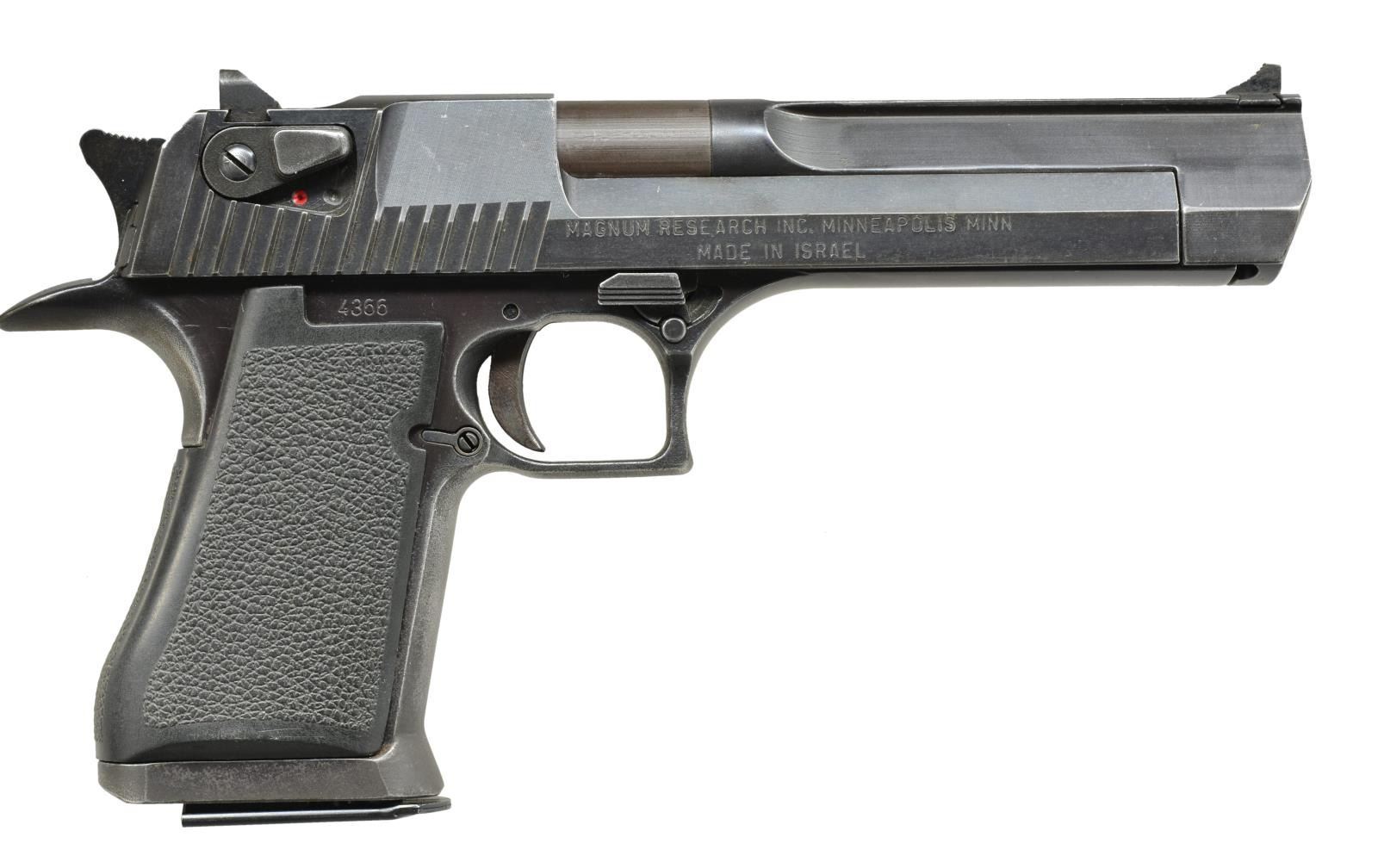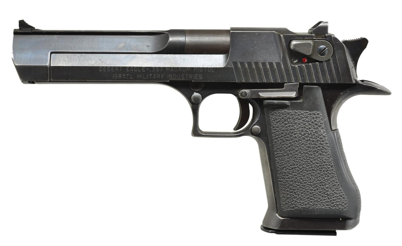Cal. 357 Mag. S# 4366. Bbl. 6". The classic Desert Eagle branded long ago by Hollywood & the alternative music community as the "Deagle", this example chambered in the powerful 357 Mag. loading. Matte blued frame. Fixed blade front sight. Drift adj. rear sight. Traditional single action, gas operated mechanism w/ rotating bolt. Ambidextrous safety on rear serrated slide. Factory plastic wrap around pistol grips. Front beveled mag. well. MAGS: 2-9 rd. factory. CONDITION: finish coverage is uniform w/ noticeable thinning at areas of mechanical intervention such as between the slide & frame. While the finish is a matte bluing on most external components, the immediate chamber area is either finished different or has worn at a different pace. While finish wear is apparent from normal use & holstering, the bore is shiny w/ land & groove rifling rather than polygonal as seen in all later Desert Eagles. Fire control mechanism appears to function correctly when cycled by hand. (21-679/JZ). MODERN. $500-800.