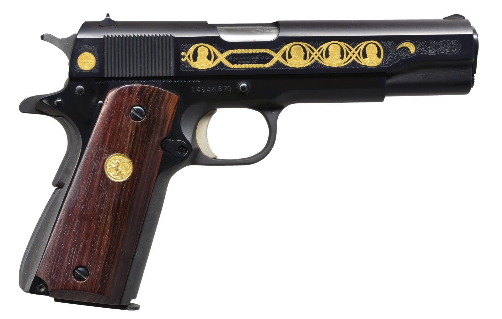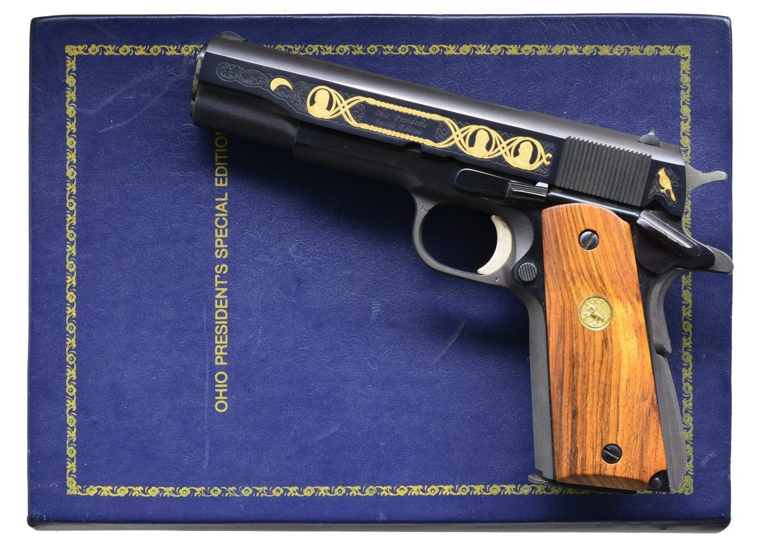 AUTO PISTOL. Cal. 45 ACP. S# 14546B70. Limited edition of 250 produced by the Colt Custom Shop in 1979 as a tribute to the 7 Presidents from the State of Ohio. Bbl. 5". Blue finish w/ special gold plated slide markings. Right side of slide has portraits of Presidents Harrison, McKinley, Taft & Harding w/ Ohio state seal behind serrations. Left side of slide has gold plated portraits of Presidents Grant, Hayes & Garfield w/ gold plated state bird behind the serrations. Portraits are bordered by vine type foliate scroll ornamentation w/ gold "1 of 250" marking on both sides of slide. Rosewood grips w/ gold Rampant Colt medallions. Right grip panel has deep reddish color, left panel is light colored w/ dark streaks. UNATTACHED ACCESSORIES: book style storage case w/ blue cover having gold markings "OHIO PRESIDENTS SPECIAL EDITION". Fitted interior has white cloth lining w/ brass plaque showing portraits of all 7 Ohio Presidents. CONDITION: appears to be unfired retaining over 99% finish. Polished sides of hammer have acquired spots of corrosion from storage. (21-586/DS). MODERN. $1,200-1,800.