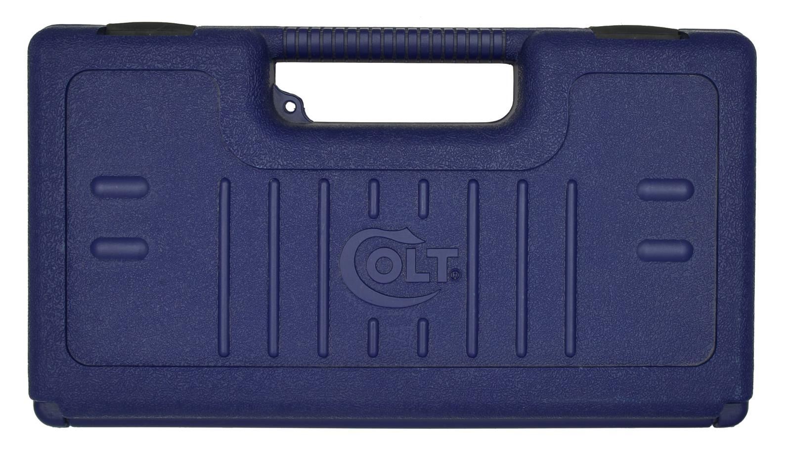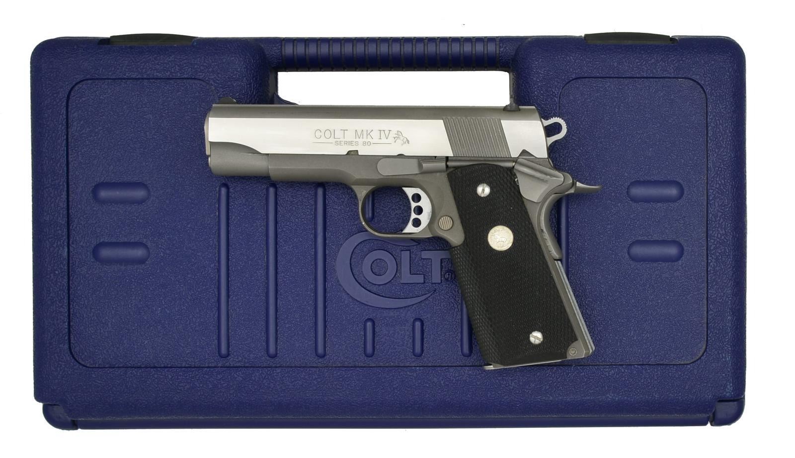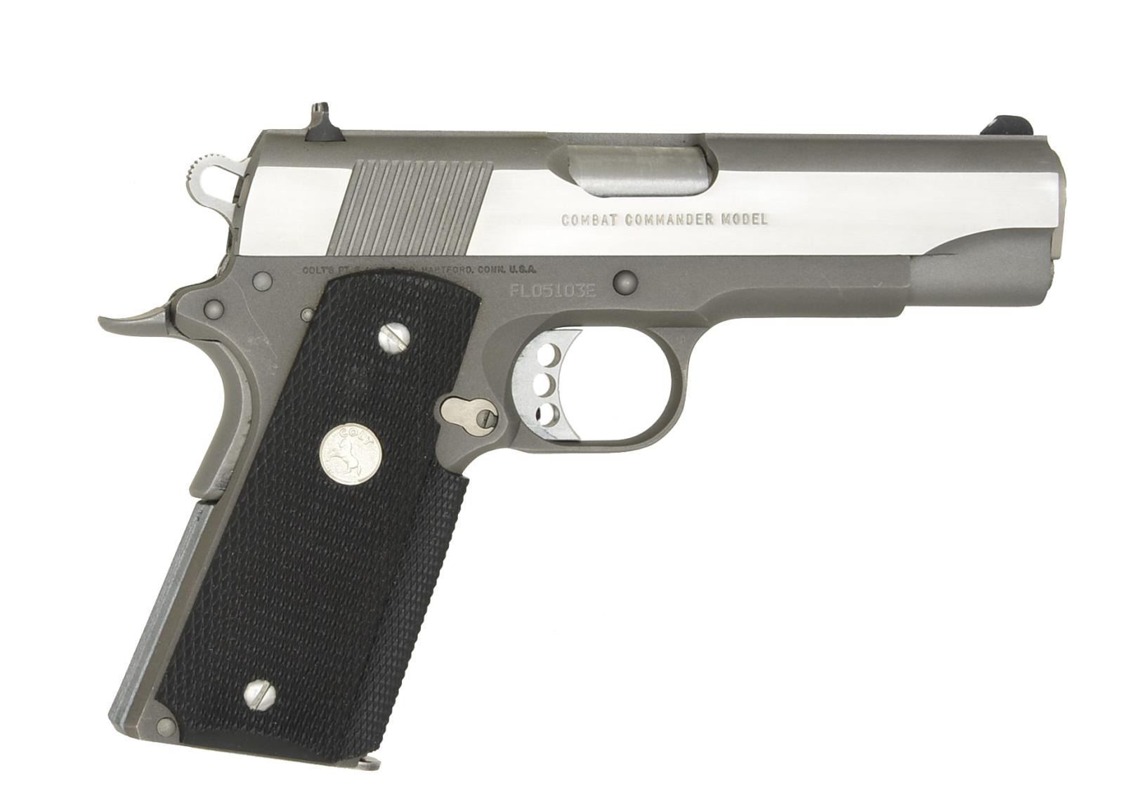 Cal. 45 ACP. S# FL05103E . Bbl. 4". Stainless Mark IV Series 80 Combat Commander w/ alloy receiver. Serrated slide w/ 3 dot sights, drift adj. for windage. Colt rubber wrap around grips w/ silver medallion. Skeletonized hammer. Oversized backstrap safety. Adjustable trigger. MAGS: 3 stainless 8 rd. UNATTACHED ACCESSORIES: factory blue plastic transport case & manufacturers paperwork. CONDITION: all outward appearances indicate very low usage w/ only subtle thinning in areas of mechanical intervention & very light top wear typically associated w/ holstering. Shiny bore w/ strong rifling. Fire control mechanism appears to function correctly when cycled by hand. (21-1123/JZ). MODERN. $600-900.