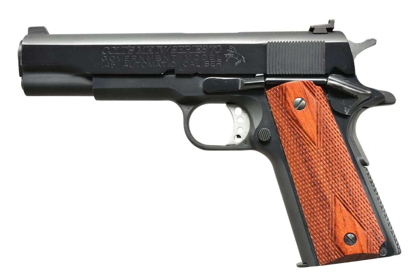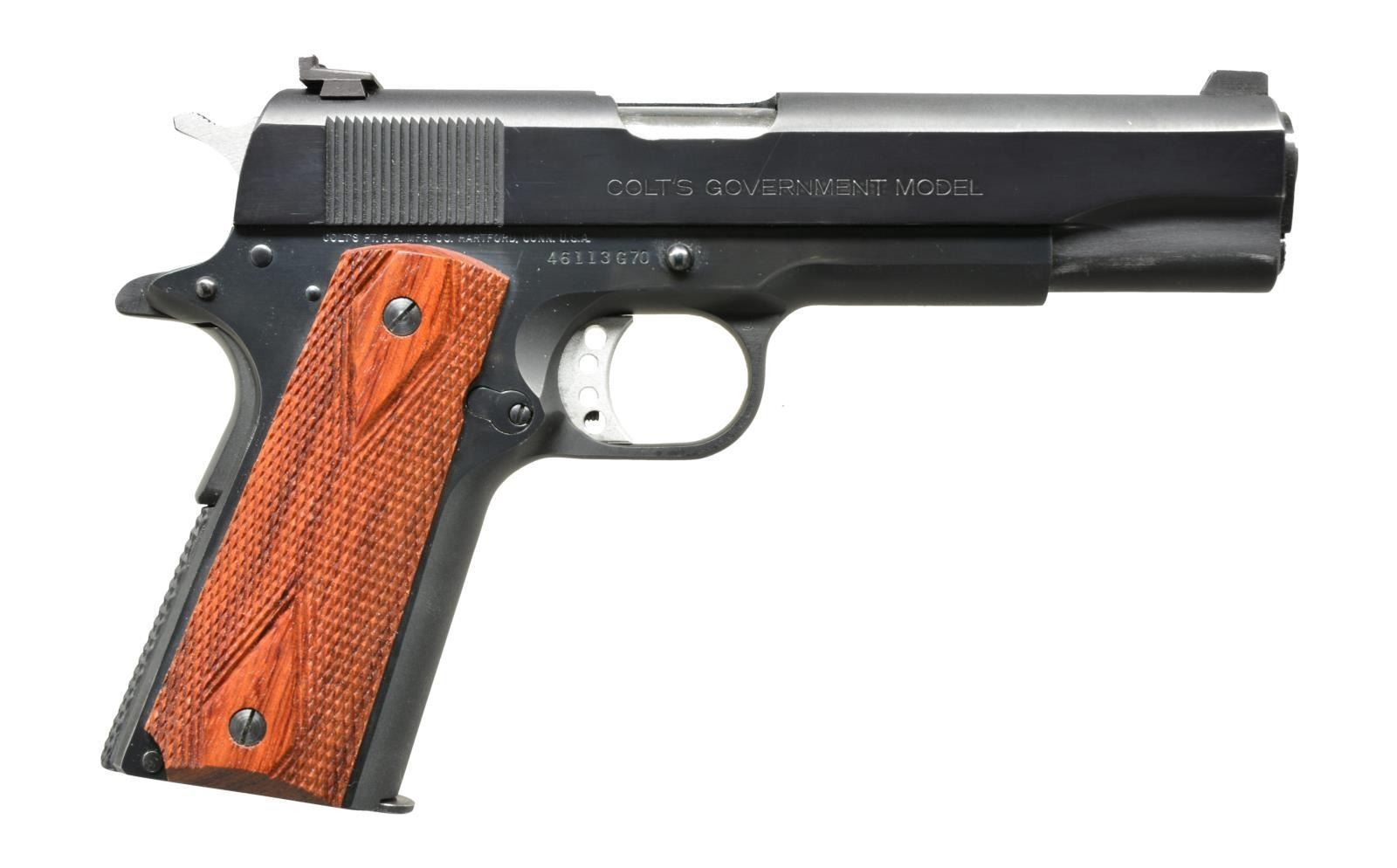 Cal. 45 ACP. S# 46113G70. Bbl. 5". Colt series 70 Gov't. Model 1911 w/ a deep rich blued finish. Serrated slide w/ Wilson Combat 3 dot sight system. Adj. trigger. Checkered diamond pattern wood grips. Top of slide & bottom of frame have normal matte finish. Rubber checkered main spring housing. MAGS: 1 Colt 7 rd. CONDITION: exposed metal surfaces retain complete coverage w/ thinning only in areas of mechanical intervention. Wood grips free of any noticeable blemishes. Bore is bright w/ decent rifling. Fire control mechanism appears to function correctly when cycled by hand. (21-1125/JZ). MODERN. $600-900.