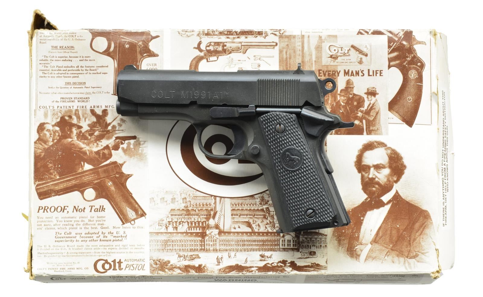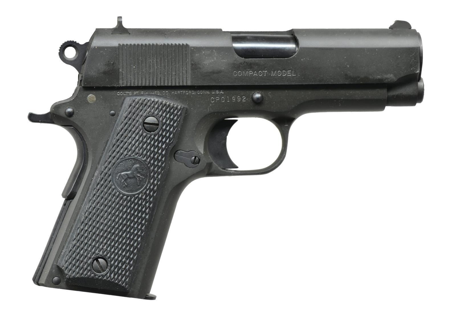 Cal. 45 ACP. S# CP01992. Bbl. 3 1/2". 3 Dot sights. Matte black finish w/ Combat style hammer. 2 Piece checkered rubber Rampant Colt grips. Mfg. 1992. MAGS: 2 detachable 7 rd. UNATTACHED ACCESSORIES: brown molded box w/ over box having matching label. Box contains instruction manual. Over box shows tattering w/ 1 torn end flap. CONDITION: over 98% finish. Bright near excellent bore. (21-889/DS). ALL MODERN. $600-900.