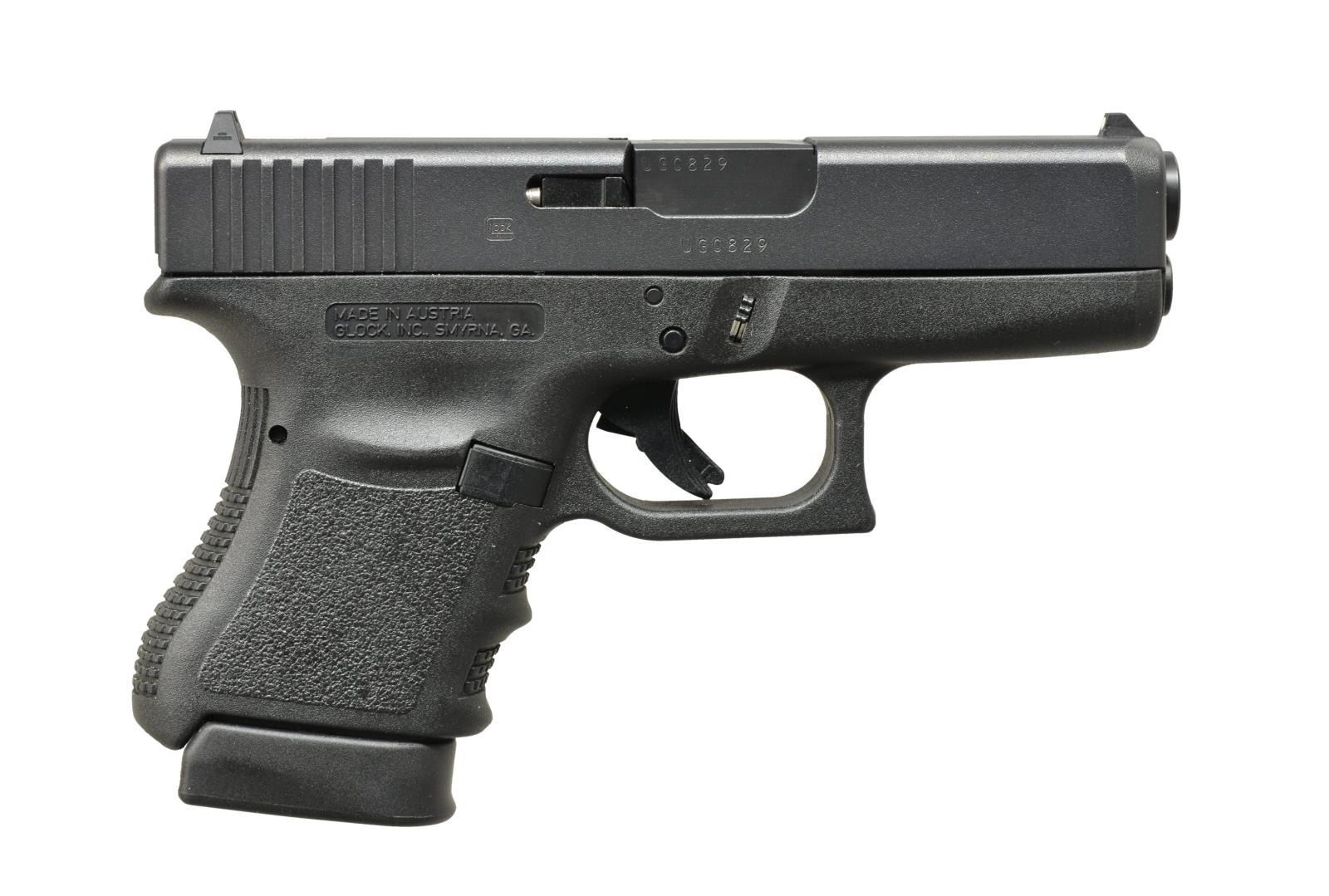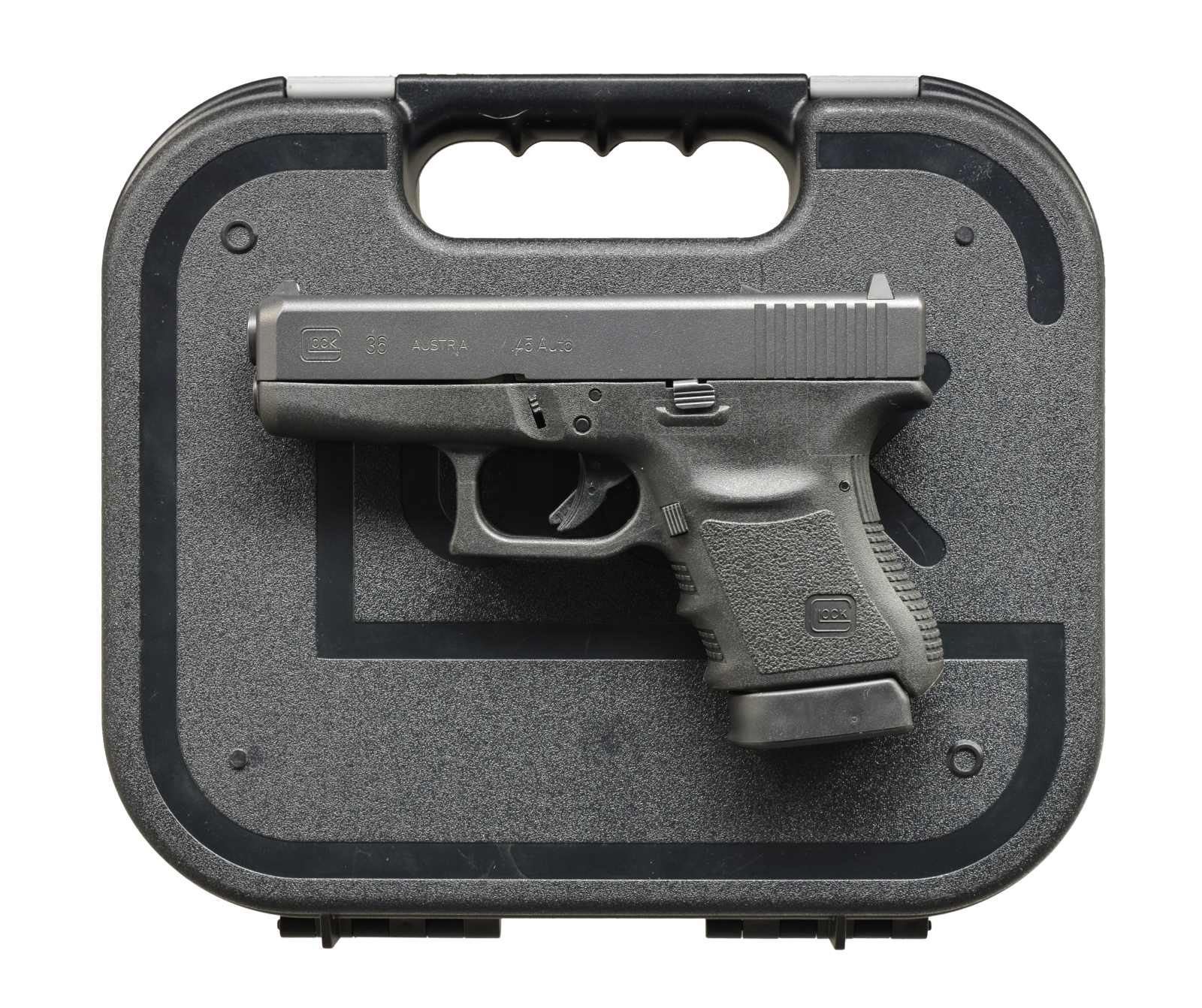 Cal. 45 ACP. S# UGC829. Bbl. 3 3/4". An unmolested Glock Model 36 subcompact. Correct Gen.3 frame w/ light stippling on grip sides & checkered front & rear. Rear slide serrations factory Glock white outline, drift adj. rear sight w/ fixed white dot front sight. MAGS: 2 factory 6 rd. UNATTACHED ACCESSORIES: black plastic foam lined factory case w/ cleaning kit, mag. loader & paperwork. CONDITION: all outward aspects appear this gun has been fired very little if any at all. Shiny bore w/ strong rifling & fire control mechanism appears to function correctly when cycled by hand. (21-921/JZ). MODERN. $400-600.