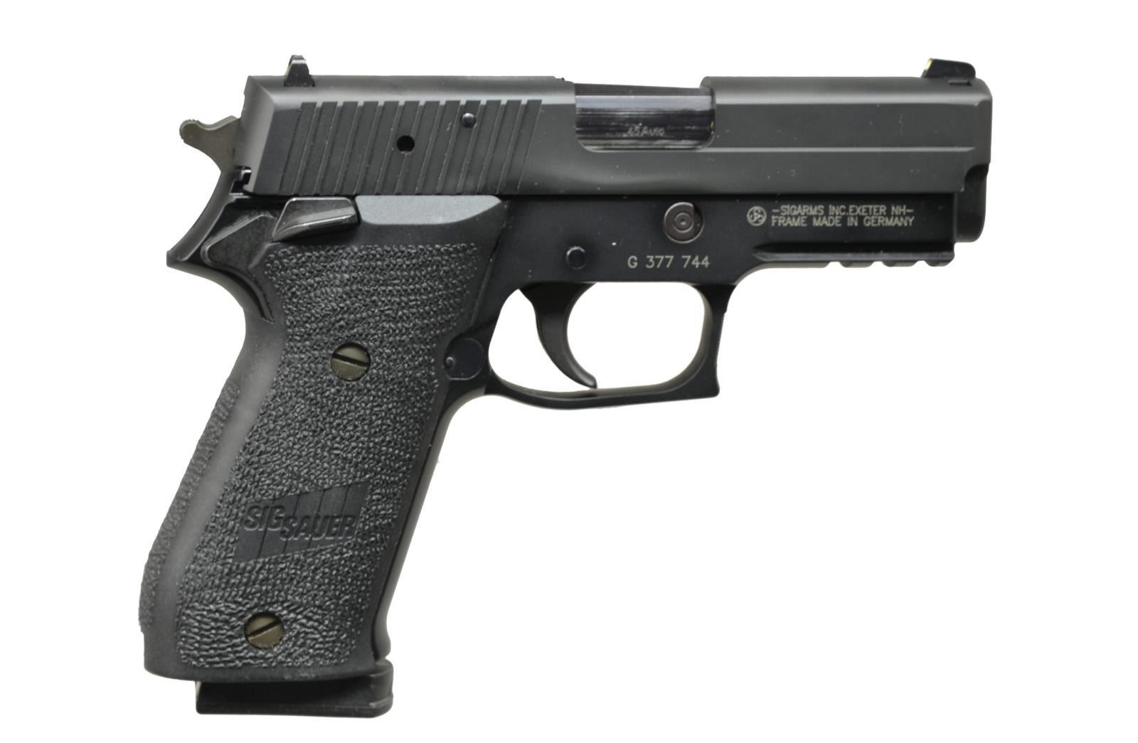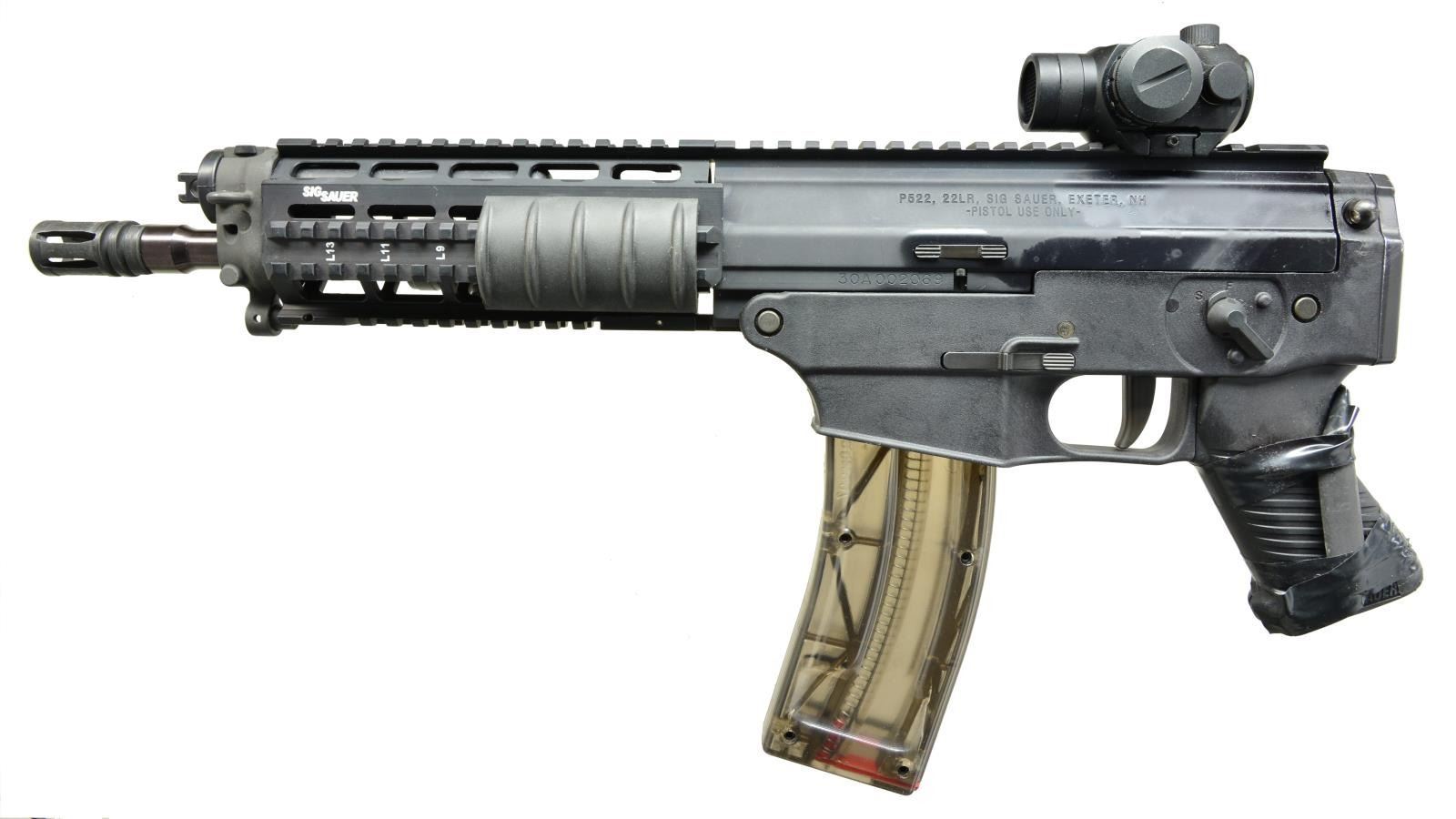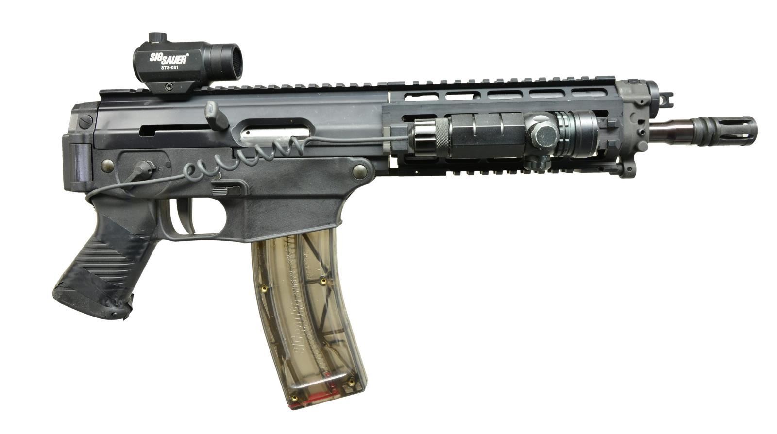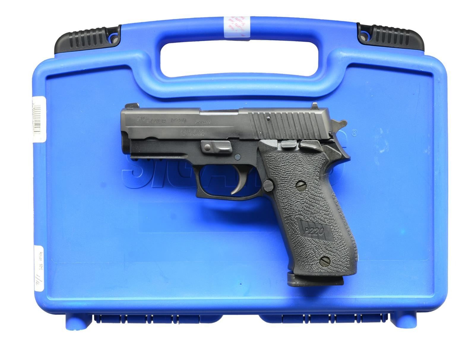 1) SIG SAUER P220 SAO PISTOL. Cal. 45 ACP. S# G377744. Bbl. 4". Sig P220 SA only. Rear serrated stainless slide w/ Sig black finish matching frame. Drift adj. front & rear sights. Ambidextrous safety. Sig 2 piece black plastic grips. Accessory rail below bbl. MAGS: 3-8 rd. UNATTACHED ACCESSORIES: blue plastic foam lined factory case w/ paperwork & fired casing. CONDITION: firearm still enjoys the vast majority of its factory finish w/ thinning on bbl. due to mechanical intervention. Shiny bore w/ strong rifling & fire control mechanism appears to function correctly when cycled by hand. (21-1473/JZ). 2) SIG SAUER P522 PISTOL. Cal. 22 LR. S# 30A002069. Bbl. 11 1/2". 22 LR variant of the Ruger 556. Quad rail forend w/ top regulated rail providing 15" of real estate for sight mounting. Matte black finish on all exterior surfaces. Bbl. terminated w/ threaded muzzle & A1 style flash hider. Ambidextrous safety/ selector. Sig red dot sight w/ lens covers. Green laser mounted at 3:00 on handguard. Front mounted storage compartment in place of traditional gas piston system. Ambidextrous mag. release & left side bolt release. Sling mounting provisions on left side. MAGS: 2 factory 30 rd. UNATTACHED ACCESSORIES: factory owners manual & black nylon sling. CONDITION: finish on exterior surfaces still enjoys complete coverage w/ areas of thinning coinciding w/ sling mounting hardware. Green laser sight appears to function correctly. Unable to verify function of red dot sight. Shiny bore w/ visible rifling. Fire control mechanism appears to function correctly when cycled by hand. (21-1474/JZ). BOTH MODERN. $800-1,200.