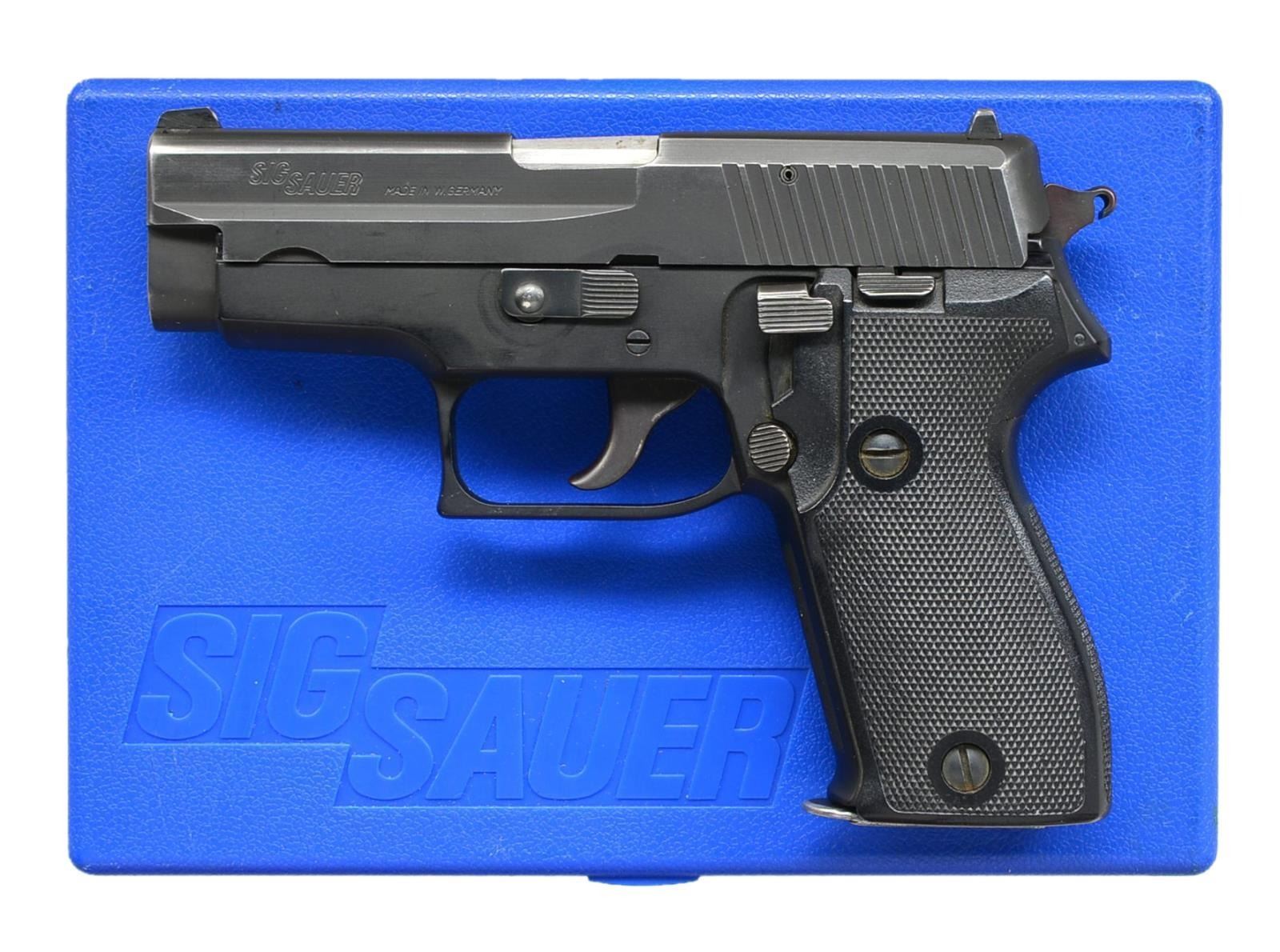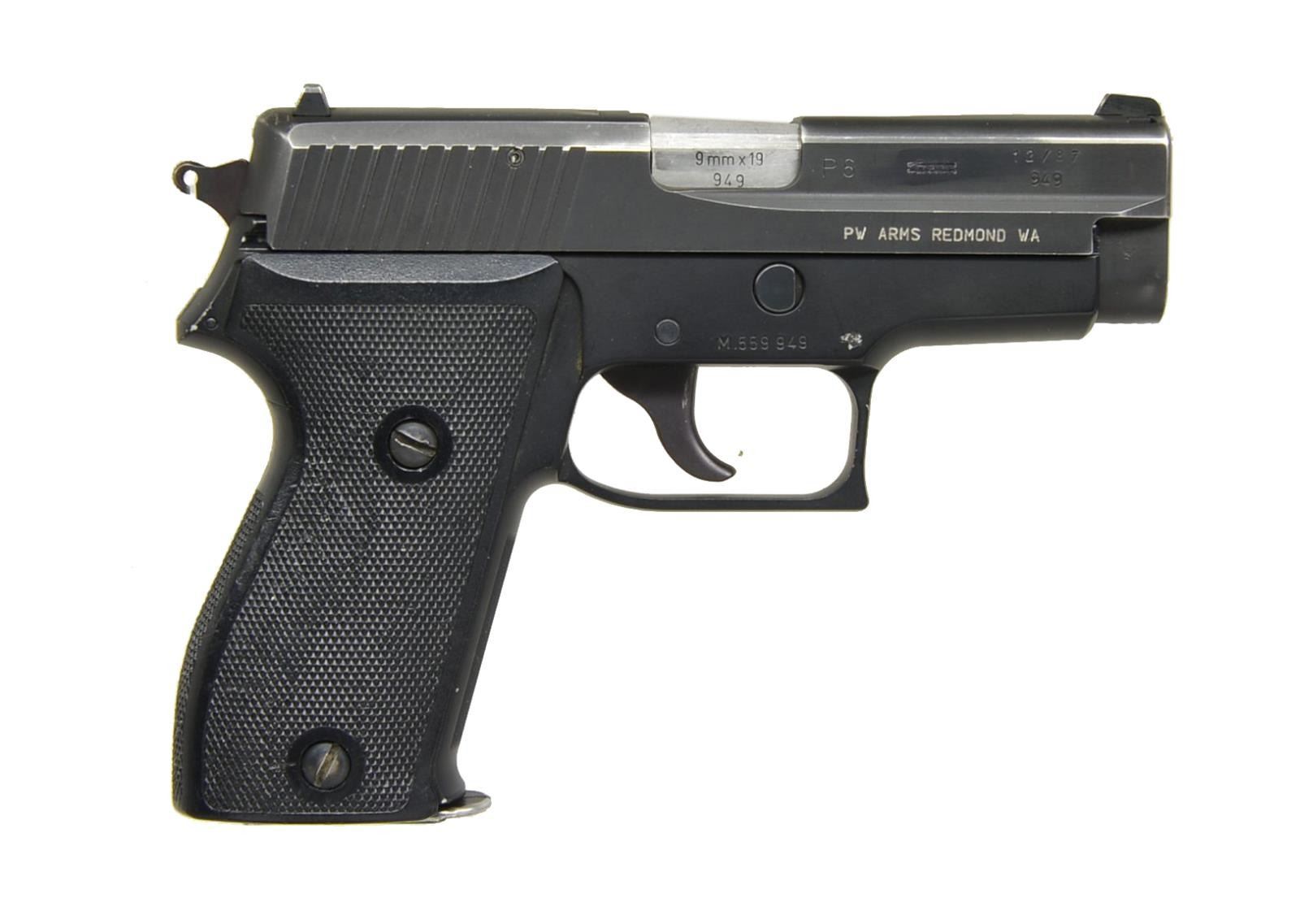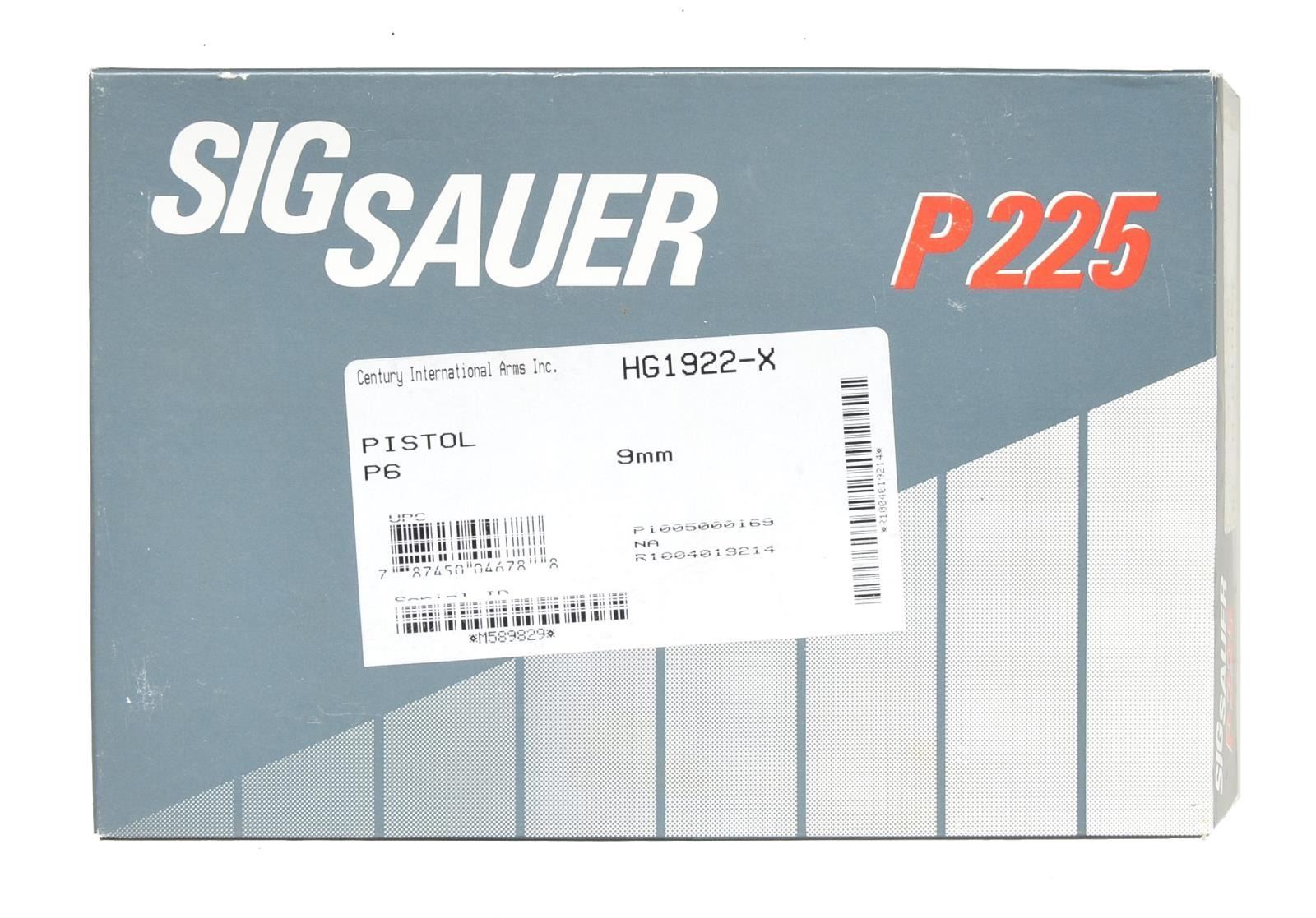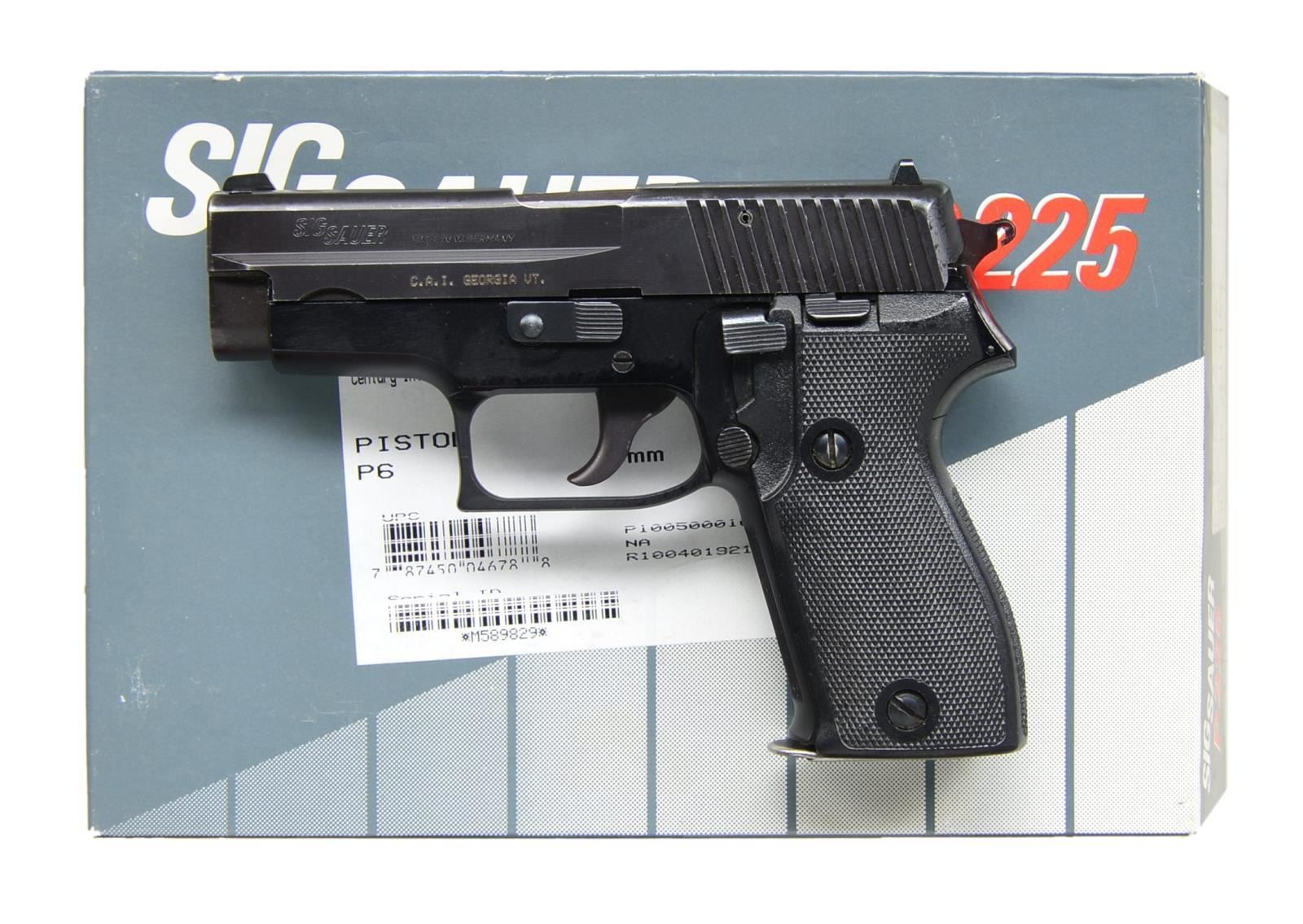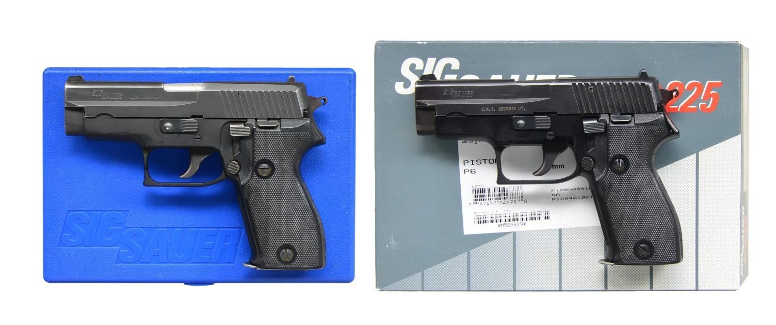 BOTH: cal. 9x19. Police version of the P225 mfg. to meet West German Police standards. Bbls. 3.85". Matte black finished stainless steel slides. Black anodized light weight alloy frames. White dot front sights w/ fixed square notch rear sights. Pistols features decockers & deformation spur hammers. 2 Piece checkered polymer grips. 1) S# M559949. Mfg. in West Germany 1987. Right side of slide has PW Arms import marking. MAGS: 4 detachable 8 rd. UNATTACHED ACCESSORIES: blue molded box w/out label containing owner's manual. CONDITION: 80% finish showing carry & edge wear. Grips show light wear & marks w/ some flattened diamonds. Bore retains strong rifling. (21-840/DS). 2) S# M589829. Mfg. in West Germany 1992. Left side of slide has C.A.I. import marking. MAGS: 2 detachable 8 rd. UNATTACHED ACCESSORIES: 2 piece foam lined box w/ mismatched label. CONDITION: 90% finish showing light carry wear. Bore retains strong rifling. (21-844/DS). BOTH MODERN. $700-1,000.