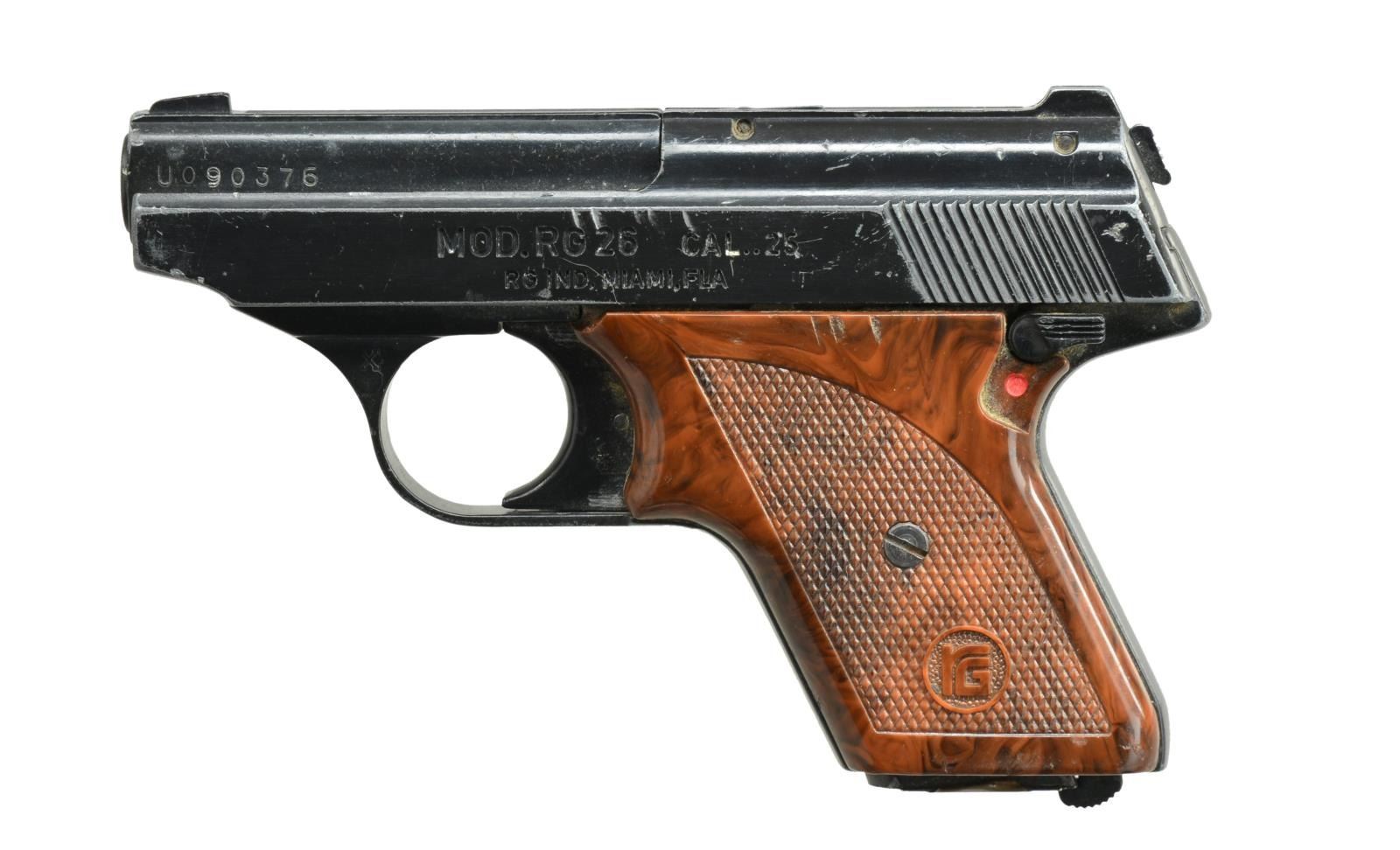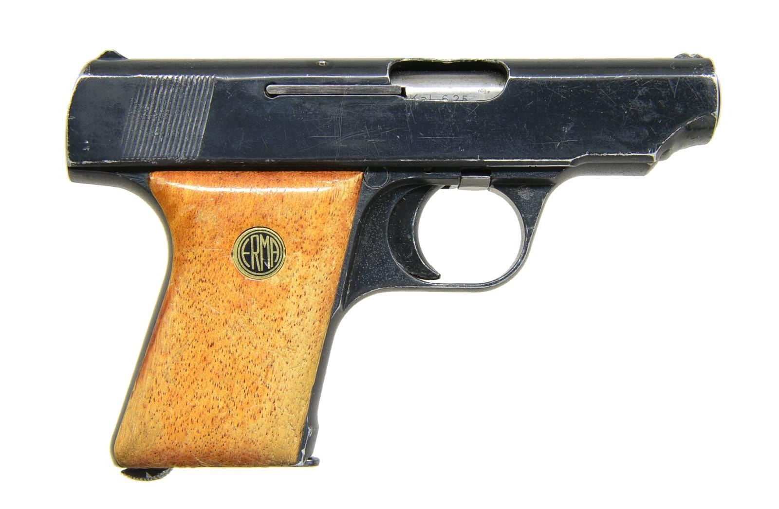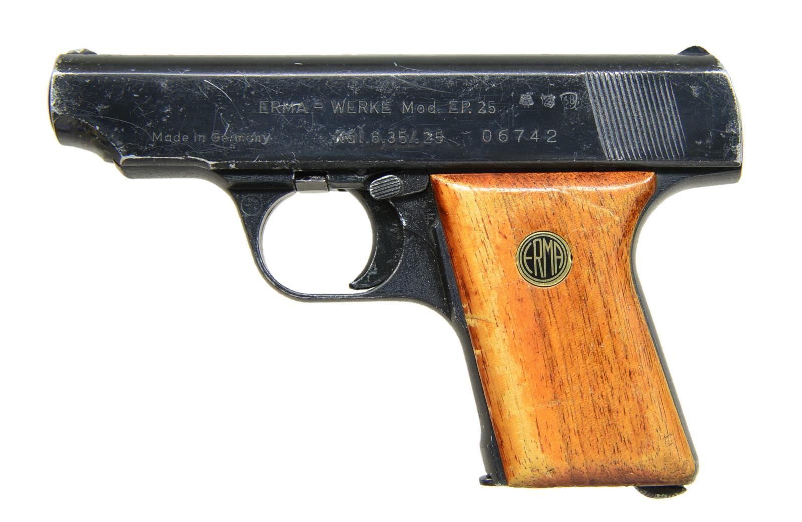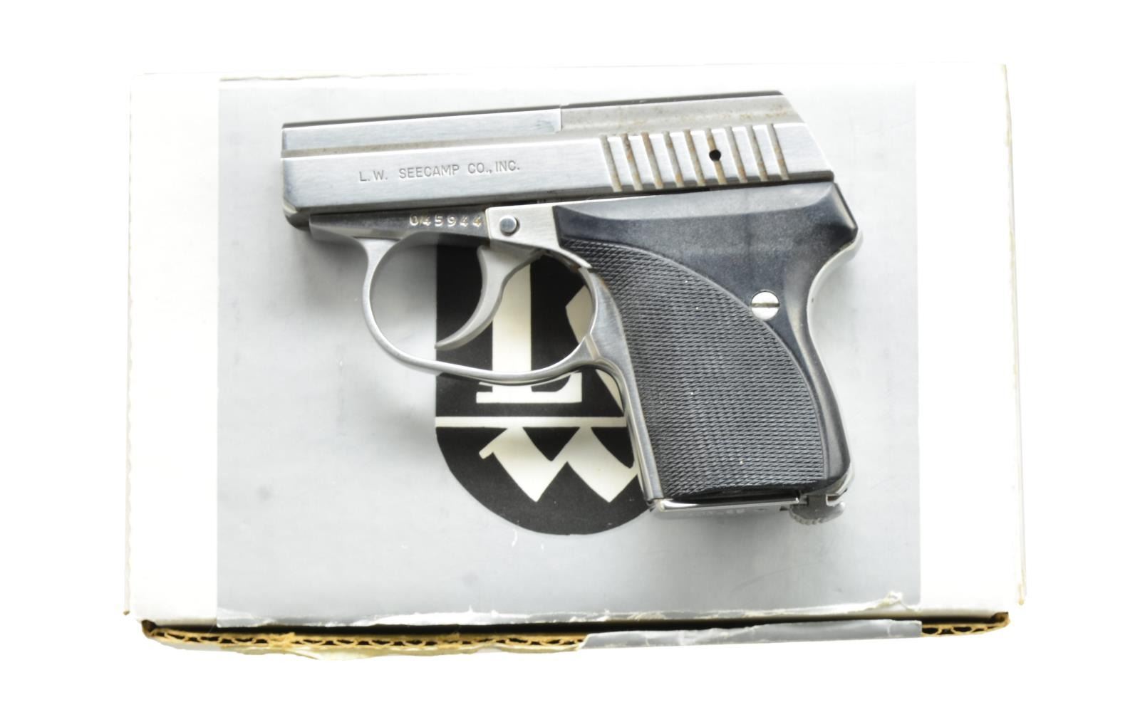 1) SEECAMP MODEL LWS 32. Cal. 32 ACP. S# 045944. Bbl. 2.06". Mfg. in Milford CT. (now relocated in Southwick MA.). Polished stainless w/ checkered black synthetic grips. Considered by most the ultimate in concealed pocket carry firearms. Designed for Winchester Silvertip ammo only. Mag. safety only plus DAO functioning. MAGS: 1 factory marked; polished stainless 6 rd. UNATTACHED ACCESSORIES: original box & packaging. CONDITION: overall near excellent appearance including grips. Bore has machine marks throughout in addition to rifling. (21-5/NW). MODERN. 2) RG MODEL 26. Cal. 25 ACP. S# U090376. Bbl. 2 5/8". Alloy construction w/ black finish. Mottled brown checkered plastic grips w/ RG logo. MAGS: 1 fair 6 rd. w/ mfg. copper base & prior owner scratch marks on left side of body. Protrudes slightly at butt likely due to missing proper base. CONDITION: generally good appearance w/ light scratches & high point wear. Fair to good bore w/ light cleaned pitting. (21-6/NW). MODERN. 3) ERMA-WERKE MOD EP 25. Cal. 6.35mm (25 ACP). S# 06742. Bbl. 2 3/4". Mfg. 1968 in Germany w/ cast alloy construction. Light hardwood grips w/ Erma medallions. Matching numbered slide. MAGS: 4 blued 6 rd. CONDITION: good general appearance w/ light handling marks throughout; near excellent bore. (21-230/NW). CURIO. $400-600.