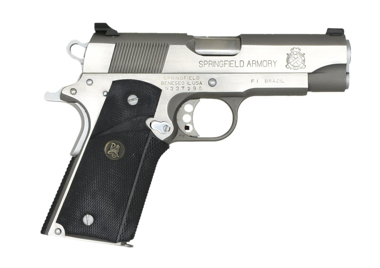Cal. 45 ACP. S# N337290. Bbl. 4". Stainless steel 1911 variant w/ Pachmayr rubber wrap around grips. Serrated slide w/ 3 dot drift adj. sights. Skeletonized hammer. Serrated extended safety & mag. release. Adj. trigger. Rubber checkered main spring housing. Gently beveled mag. well. MAGS. 1 stainless 7 rd. UNATTACHED ACCESSORIES hard plastic Springfield transport case, factory paperwork, & gun lock. CONDITION: All exposed metal surfaces consistent w/ light thinning of areas of mechanical intervention & some gentle holster wear. Clean bore w/ strong rifling & fire control mechanism appears to function correctly when cycled by hand. (21-1124/JZ). MODERN. $500-700.