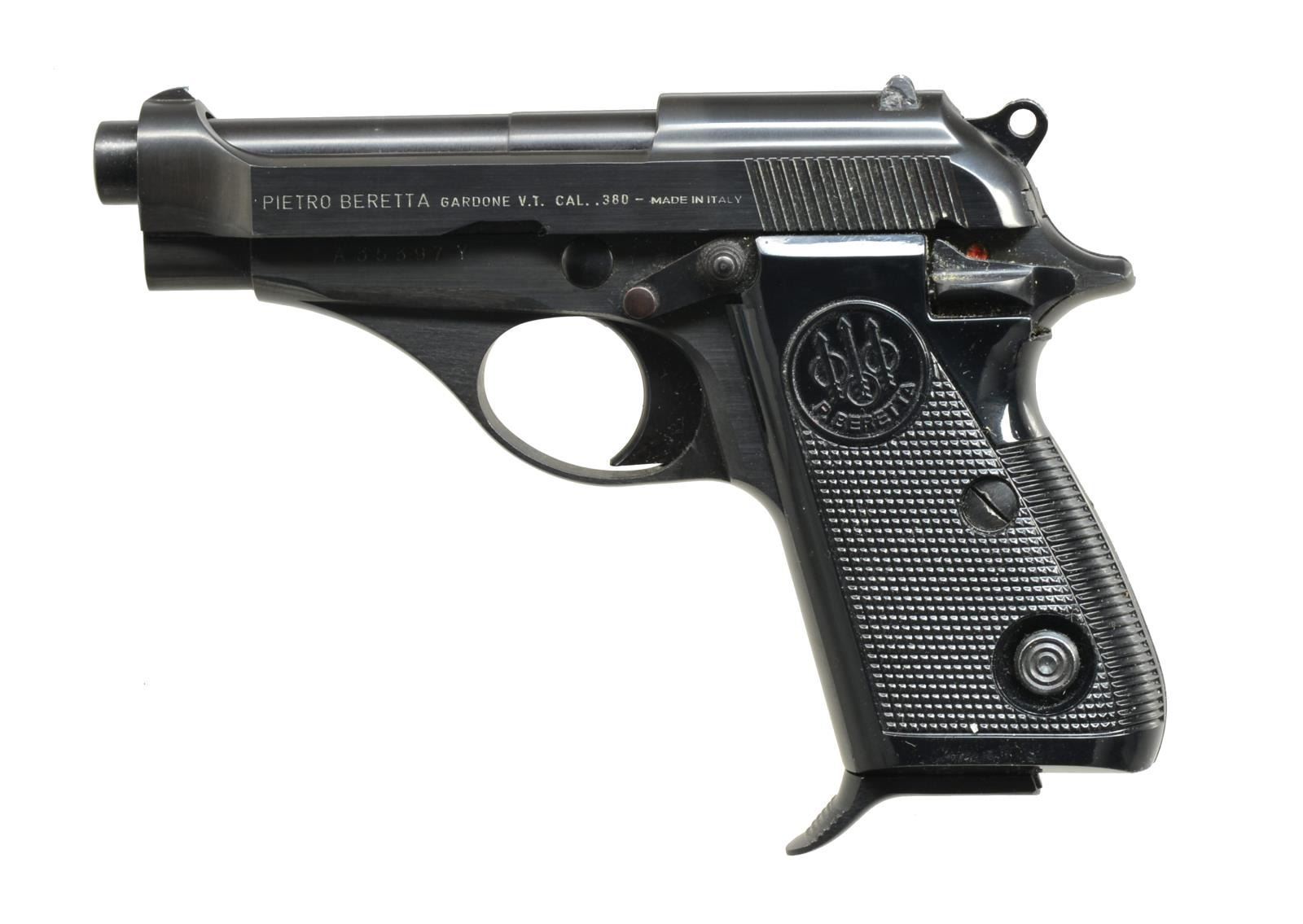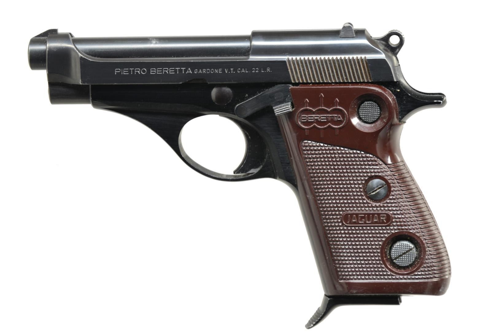 1) MODEL 70S. Cal. 380 ACP. S# A35397Y. Bbl. 3 1/2". Blade front sight & square notch rear sight. Blue steel frame & slide. 2 Piece checkered black plastic grips. MAGS: 1 detachable 9 rd. UNATTACHED ACCESSORIES: Beretta box w/ matching numbered label. Box contains paperwork & bore cleaning brush. CONDITION: 98% blue showing sm. marks on left side of rear sight & some distortion on grip screws. Grips show sm. spots of right panel. Bright near excellent bore. (21-1110/DS). 2) MODEL JAGUAR. Cal. 22 LR. S# F23712. Bbl. 3 1/2". Blade front sight w/ square notch rear sight. Blued steel slide w/ black finished alloy frame. 2 Piece brown checkered plastic grips. MAGS: 1 detachable 8 rd. CONDITION: 97% metal finish showing sm. marks & edge wear. Grips show sm. handling marks. Bright near excellent bore. (21-1117/DS). BOTH MODERN. $600-800.
