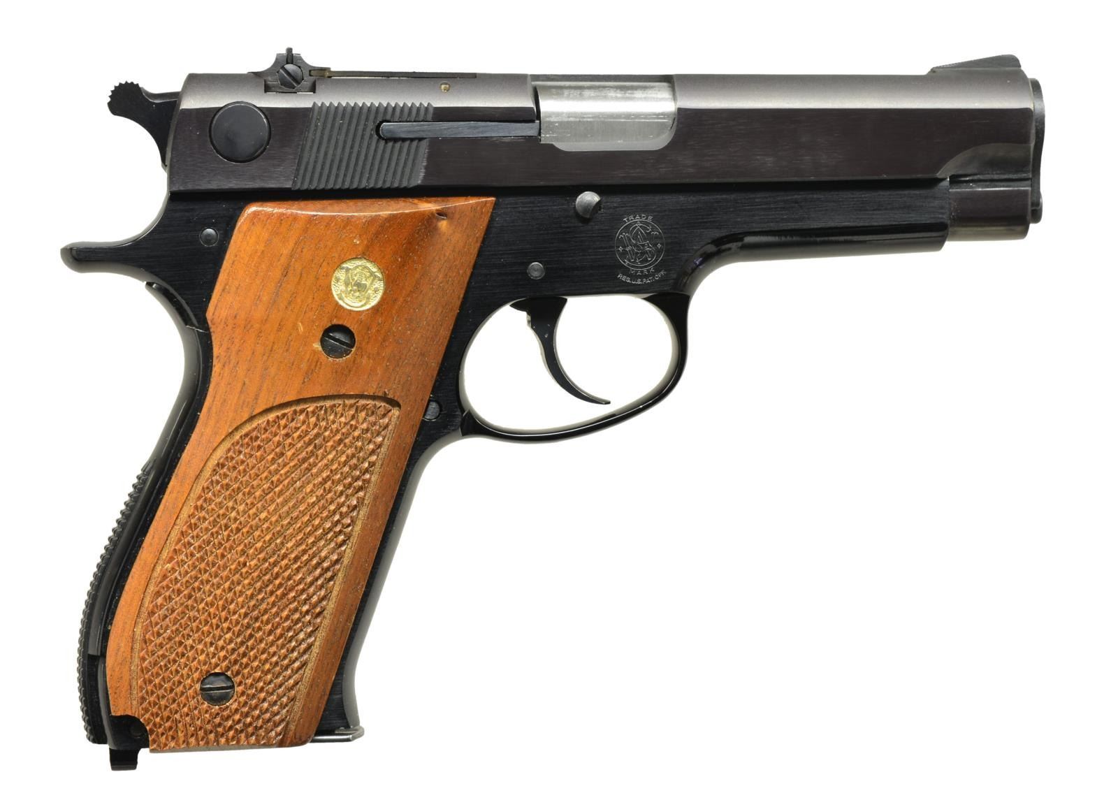 Cal. 9mm Luger. S# A655985. Bbl. 4". Blued steel slide w/ serrated ramp front sight & square notch adj. rear sight. Black finished alloy frame. 2 Piece checkered walnut grips w/ S&W medallions. MAGS: 2 detachable 8 rd. UNATTACHED ACCESSORIES: 2 piece blue box w/ matching numbered label. Box contains instructions, registration card, warranty & holster papers. CONDITION: near new retaining over 99% original finish. Bright bore shows some fouling. (21-1192/DS). MODERN. $400-600.