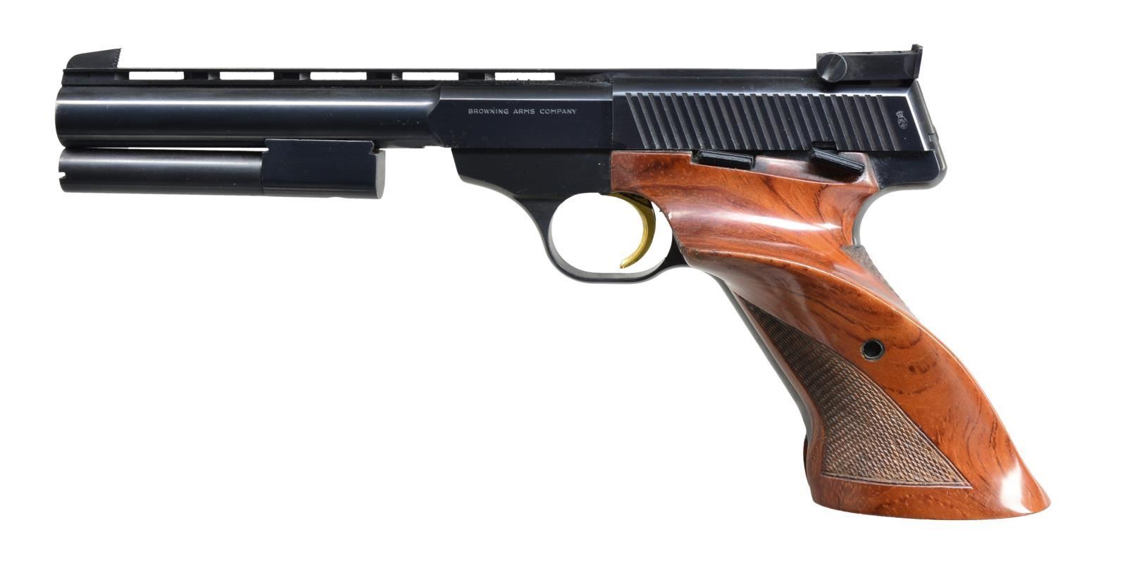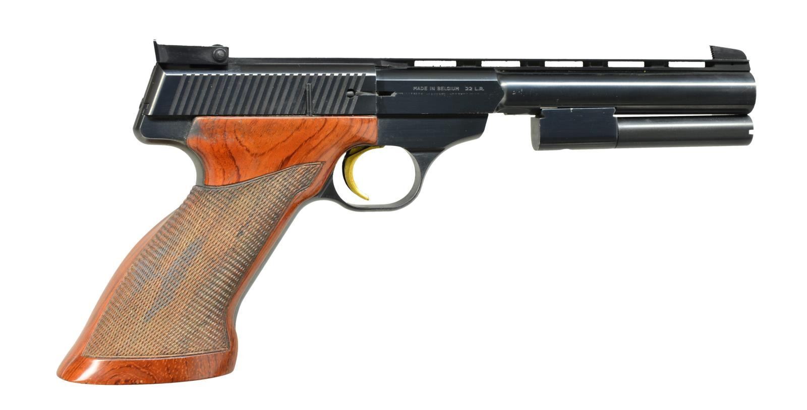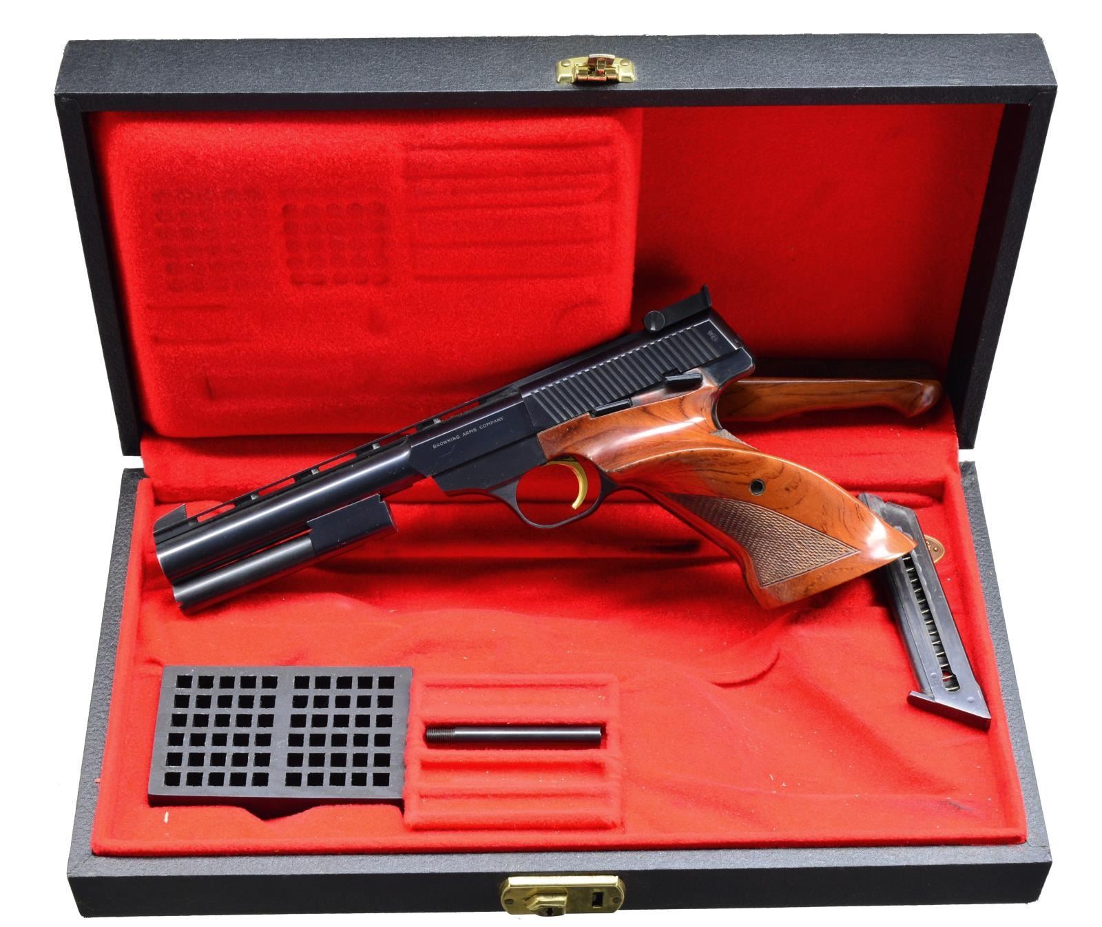 Cal. 22 LR. S# 22456T69. Bbl. 6 3/4" w/ ventilated rib, marked "Browning Arms Company" on left & "Made in Belgium" on right. Pistol fitted w/ adj. target rear sight, checkered rosewood grips w/ thumb rest, gold plated trigger & interchangeable bbl. weights. MAGS: 2-10 rd. UNATTACHED ACCESSORIES: factory black case w/ red interior which contains spare mag, 1 sm. bbl. weight, rosewood schnable forend & cartridge block. CONDITION: fine w/ evidence of considerable use. Metal parts retaining over 90% original blue showing high edge wear & scattered marks. Blue on front strap wearing thin. Fine bore, mechanically good. (21-1190/MGM). MODERN. $900-1,200.