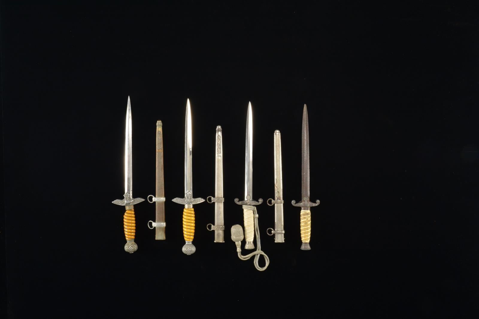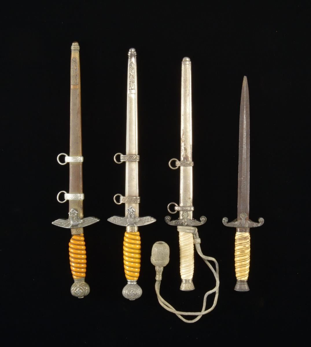 1) LUFTWAFFE. Overall length: 16 3/4". Unmarked blade. Aluminum crossguard & pommel. Wire wrapped yellow composite grip. Plated scabbard. CONDITION: blade shows some areas of factory polish. Mounts show expected wear. Grip has a crack & sm. loss near the ferrule. Wire is complete. Scabbard shows light wear. 2) LUFTWAFFE. Overall length: 17". Blade marked “RICH A. HERDER SOLINGEN”. Aluminum crossguard & pommel. Wire wrapped yellow composite grip. Plated scabbard. CONDITION: blade has spotty water damage & nicks to the edge. Mounts show moderate wear. Hilt is a bit loose. Grip has significant losses at the top & bottom. Scabbard body is very oxidized. 3) ARMY. Overall length: 15 1/2". Unmarked blade. Plated mounts. White grip likely of post war mfg. Plated scabbard. Complete w/ knot. CONDITION: blade shows very light wear. Mounts have tarnish & a bit of oxidation. Grip shows numerous sm. drying cracks. Scabbard has some loss of finish. Knot shows light wear. 4) ARMY. Overall length: 14 1/2". A relic dagger that may be excavated. No scabbard. CONDITION: blade has a dark patina w/ pitting. Mounts are oxidized & pitted. Grip has significant wear & staining. No scabbard. (02-14486/BF). $800-1,200.