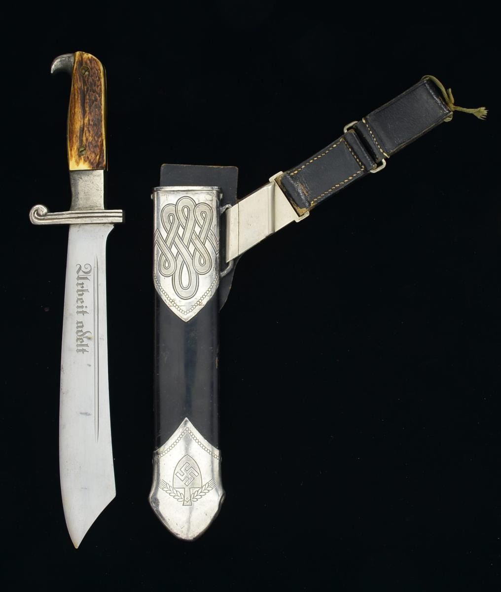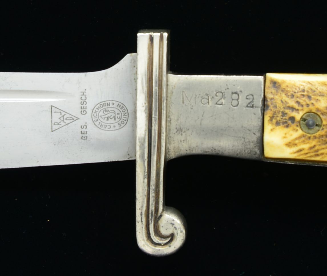 LEATHER HANGER. Overall length: 15 1/2". Blade marked, “RLAD” in a triangle & “GES. GESCH. CARL EICKHORN * SOLINGEN * CE”. Front of blade etched, “Arbeit adelt”. 2 Piece stag horn grips. “Ma282” stamped below the grip. Scabbard has a black enameled body w/ plated mounts. Hanger is black leather w/ correct plated clip. CONDITION: blade shows primarily scabbard wear. Grips are undamaged. Hilt shows light wear w/ some impact marks on the pommel. Scabbard tip has several minor shallow dents along w/ a significant dent at the left corner. Both screws are missing on the tip. Scabbard finish is about 95% but appears to have been retouched in spots. Hanger shows light expected wear & remains quite solid. (02-14790/BF). $700-1,100.