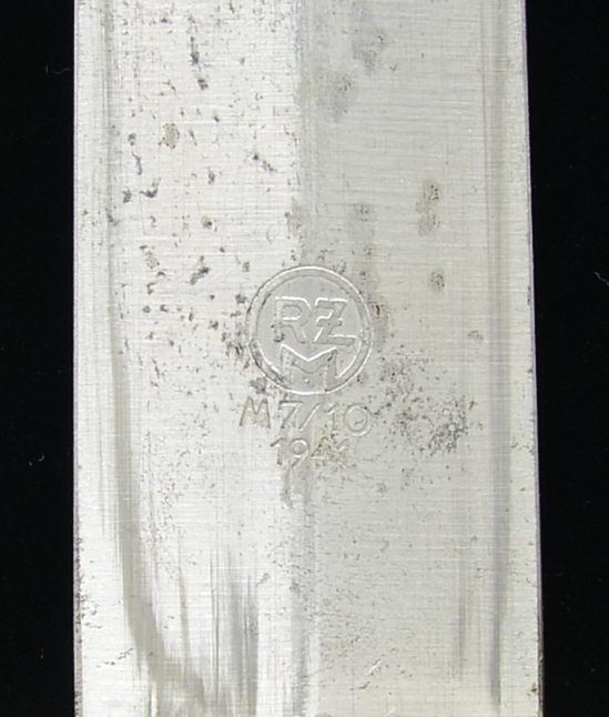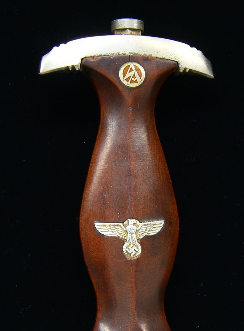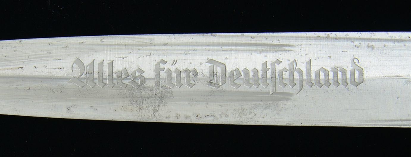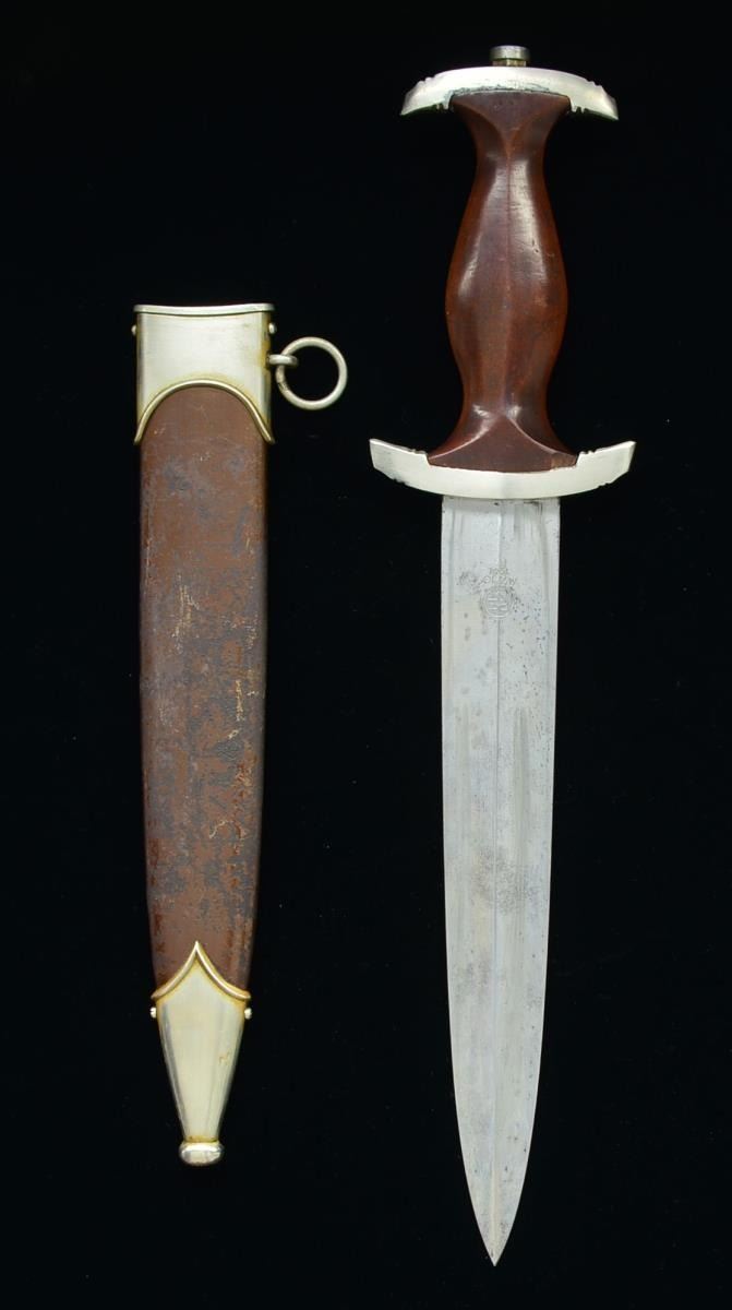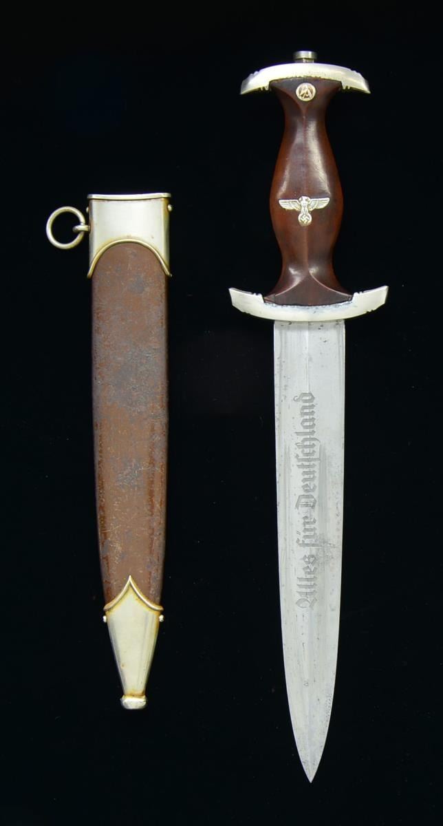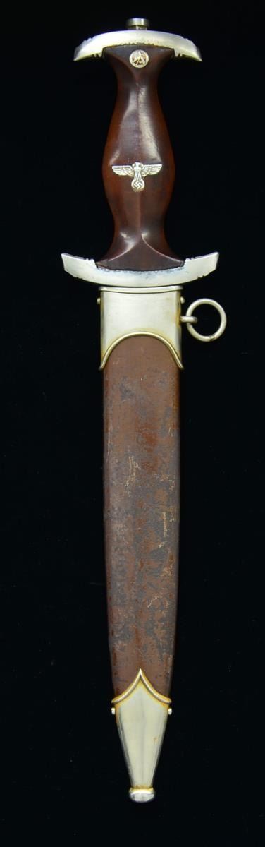 Overall length: 14 3/4". Blade is etched, “Alles fur Deutschland” & is marked, “RZM M7/10 1941”. Plated crossguard & pommel. Aluminum eagle. Brown enameled SA button. Wood grip. Brown anodized scabbard w/ plated mounts. CONDITION: blade shows primarily scabbard wear. Crossguard has oxidation at the grip joint. Grip has 2 sm. chips near the crossguard. Scabbard body retains about 70% finish. (02-15189/BF). $350-500.