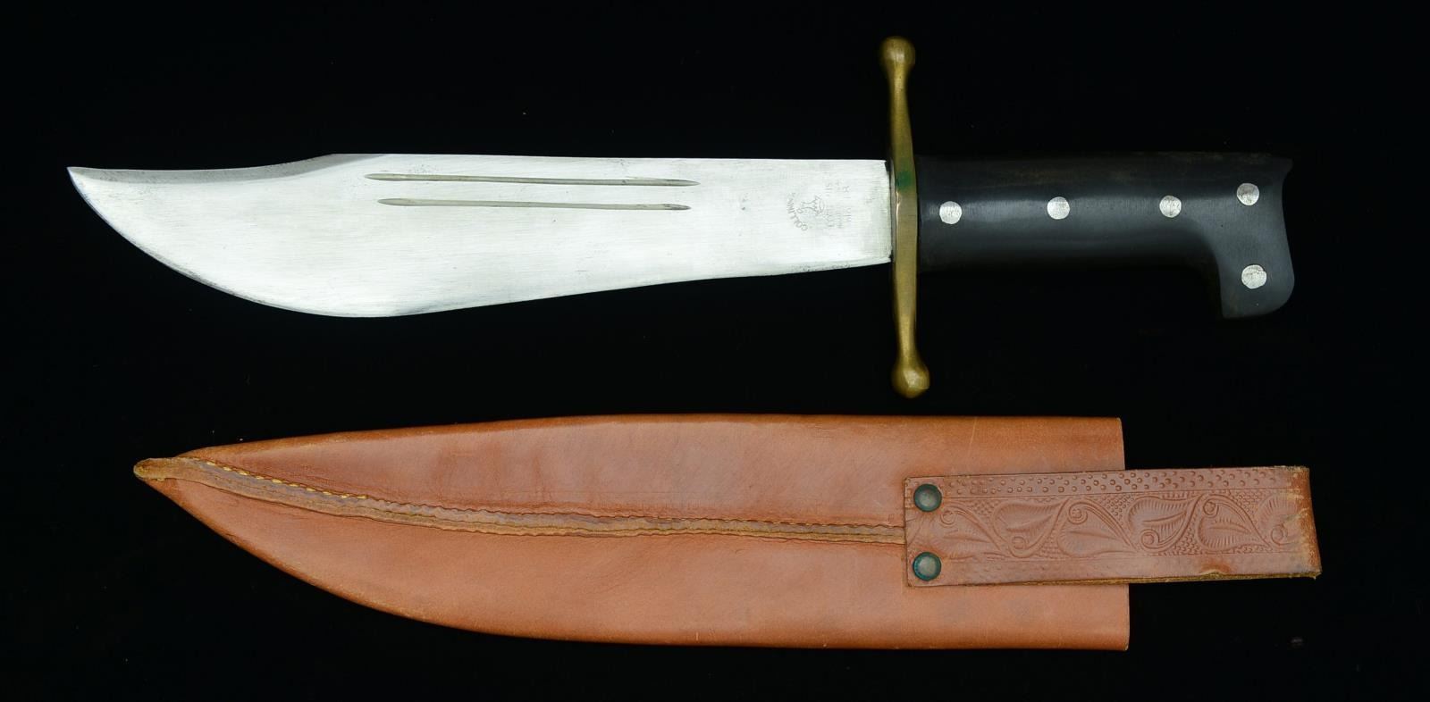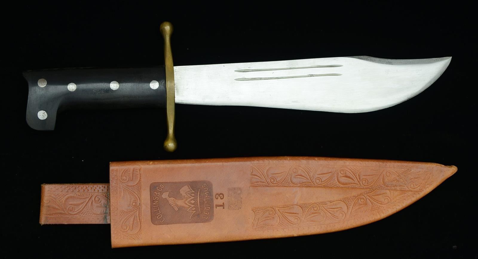Overall length of knife: 14 1/8". Overall length in scabbard: 16". Clipped point bowie style blade w/ 2 narrow short fullers on each side. Stamped near the crossguard, “COLLINS & CO (logo) LEGITIMUS MADE IN U.S.A. No 18”. Brass crossguard. 2 Piece black composition grip secured by 5 steel rivets. Tooled brown leather scabbard embossed, “COLLINS & CO (logo) LEGITIMUS” & stamped “13”. These early style V44 knives were first produced in 1934 for flying personal in Panama & Hawaii. They were carried in the jungle bailout kit that attached to the parachute harness. The V44 remained the standard survival knife until 1942. Unissued examples are nearly nonexistent today. CONDITION: knife & scabbard show only light handling wear. (02-15021/BF). $750-1,500.