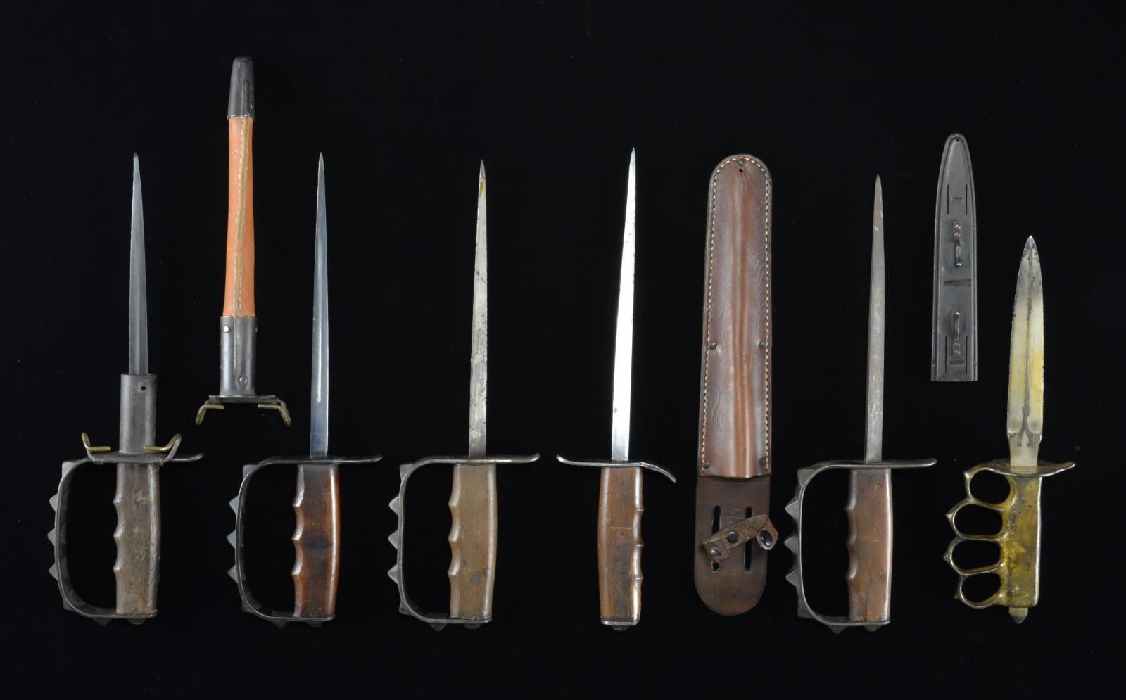 1) 1 M1917-18 US trench knife w/ triangular blade marked, “U.S. L.F. & C. 1917”. CONDITION: blade has a mottled gray patina. Grip has a noticeable drying crack. 2) 1 M1917-18 US trench knife w/ triangular blade marked, “U.S. L.F. & C. 1917”. CONDITION: blade is a bit shortened. Grip has a few short drying cracks. 3) 1 M1917-18 US trench knife w/ triangular blade marked, “U.S. L.F. & C. 1917”. CONDITION: blade has remains of original bluing. Scabbard may have replaced leather. 4) 1 M1917-18 US trench knife w/ triangular blade marked, “U.S. L.F. & C. 1917”. CONDITION: blade has remains of original bluing. There is a drying crack in the grip. Only the top mount of the scabbard remains. 5) 1 US MK 1 trench knife. Knife appears to be original, however the blade has been chrome plated & the hilt has been gold plated. Scabbard remains unaltered. CONDITION: chrome plating on blade is about 80%. Gold plating on hilt is about 70%. Scabbard is undamaged. 6) 1 M1917-18 US trench knife with triangular blade marked "U.S. L.F. & C. 1917" . No scabbard. CONDITION: knuckle bow has been removed. Remainder of knife shows light to moderate wear.(02-14397-1(6)/BF). $1,000-1,300.