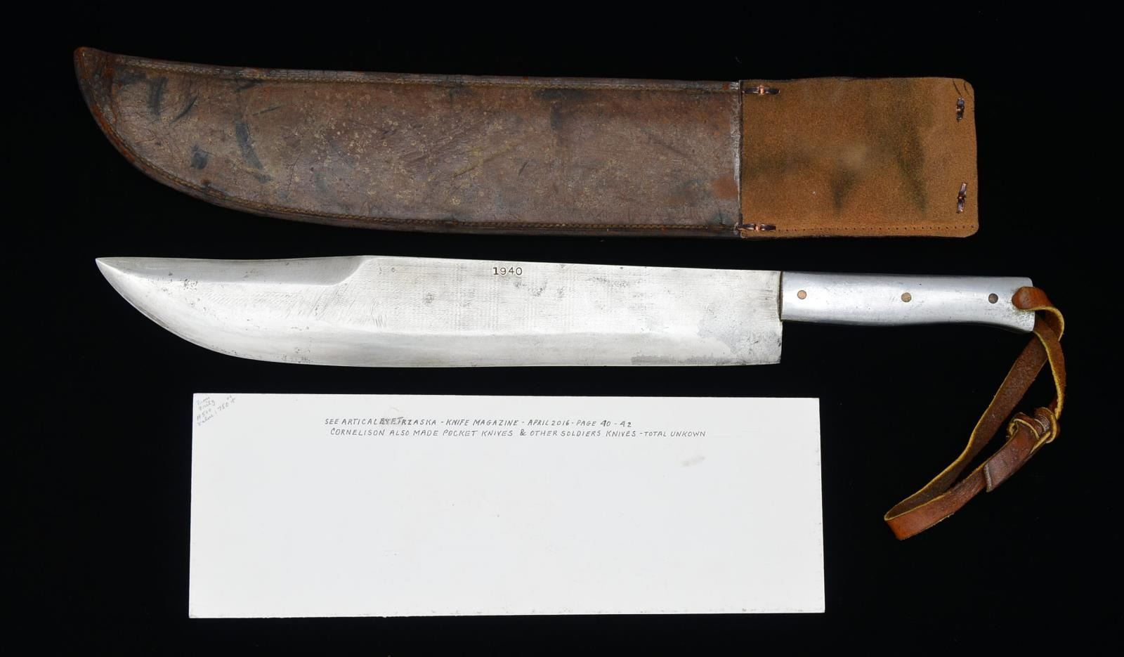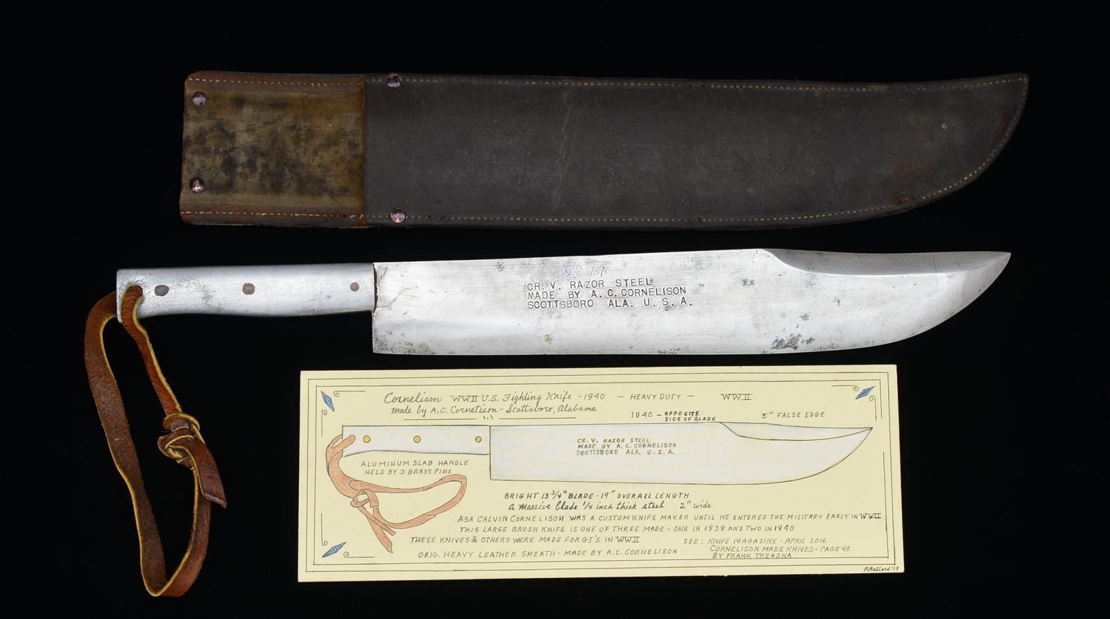 1940. Overall length: 19". Blade length: 13 7/8" w/ a 5" false edge. A bowie form blade stamped on one side “9277 CR. B. RAZOR STEEL MADE BY A. C. CORNELISON SCOTTSBORO ALA. U.S.A.”. The other side stamped “1940”. Asa Calvin Cornelison was a custom knife maker until he entered military service early in WWII. This exceptionally lg. bush/fighting knife is one of three made for WWII GIs. Knife has a 2 piece aluminum slab handle held on by 3 brass pins on each side. There is a leather thong at the pommel. The sheath is plain brown leather. CONDITION: knife shows light wear overall. PROVENANCE: Collection of Roger Ballard. (02-14865/BF). $600-900.