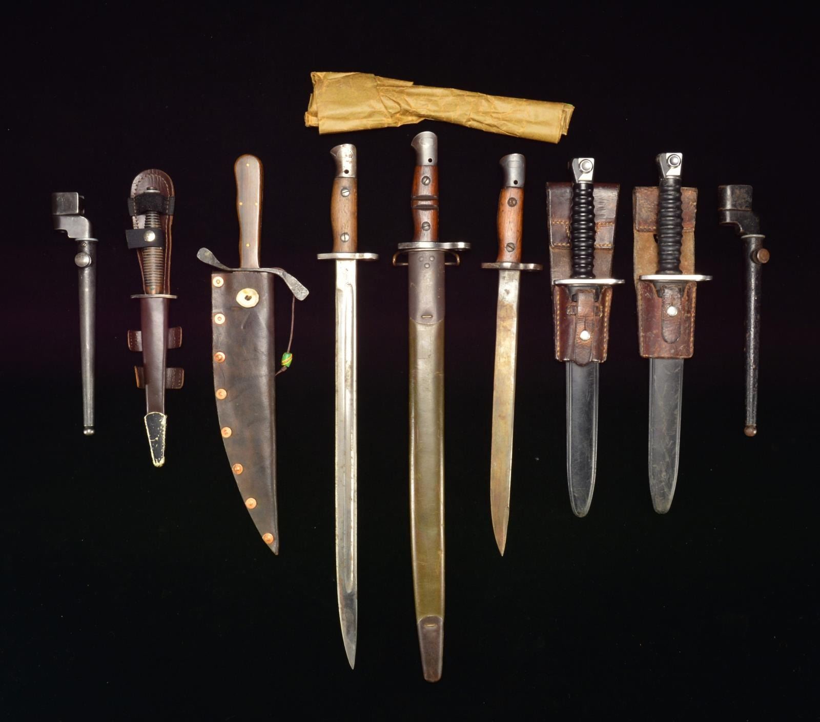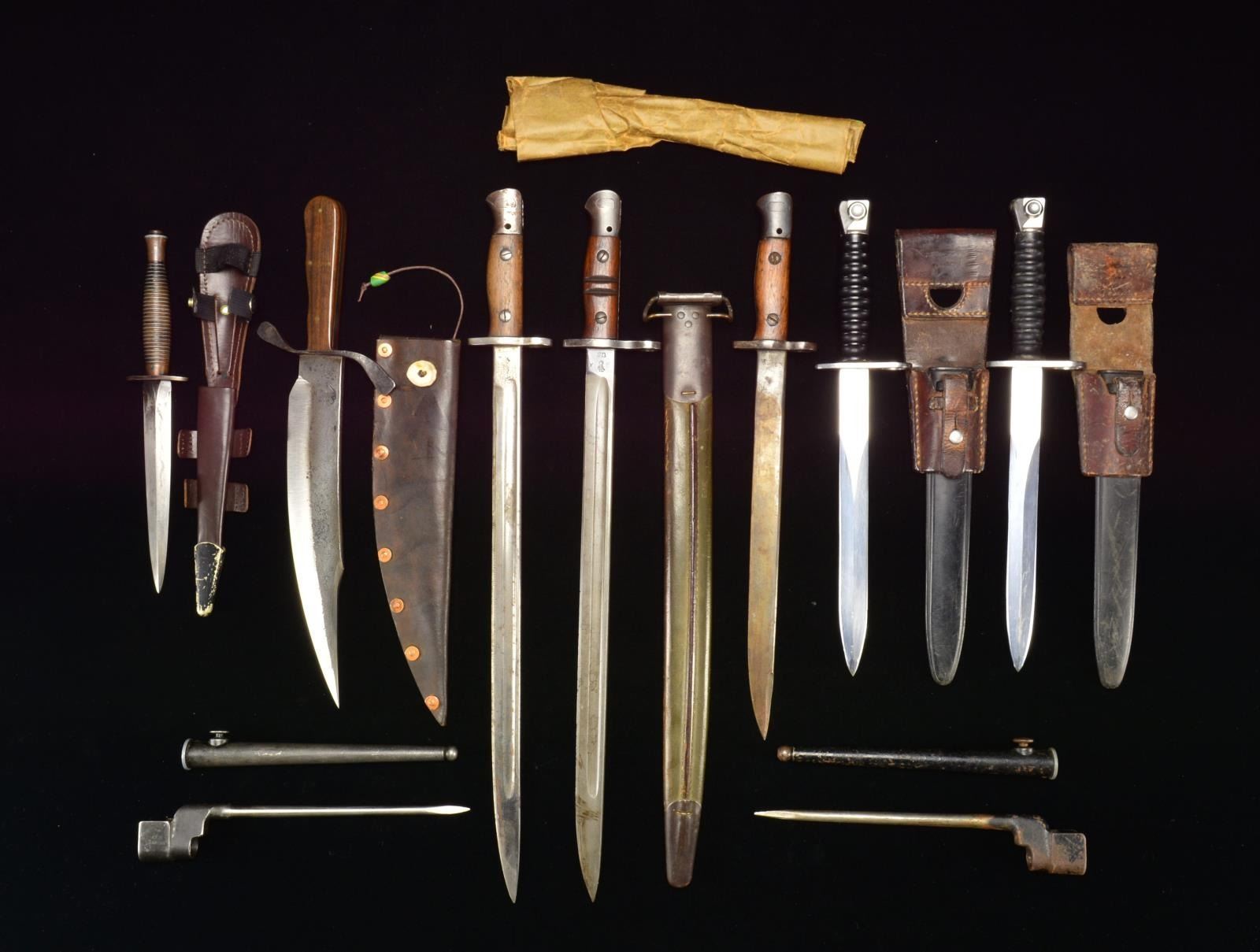 1) SWISS BAYONET. Overall length: 14 3/4". Blade length: 9 3/8". A Swiss M1957 Sig export bayonet. Plain blade marked at the ricasso, “W 194493” & “(logo)”. Steel guard & pommel. 2 Piece ribbed composite grip. Composite scabbard w/ leather frog. CONDITION: light wear overall. (02-15059/BF). 2) SWISS BAYONET. Overall length: 14 3/4". Blade length: 9 3/8". A Swiss M1957 Sig export bayonet. Plain blade marked at the ricasso, “W 237350” & “(logo)”. Steel guard & pommel. 2 Piece ribbed composite grip. Composite scabbard w/ leather frog. CONDITION: light wear overall. (02-15060/BF). 3) CONTEMPORARY BOWIE. Overall length: 16 3/4". Blade length: 11". A modern bowie w/ a slightly curved, crudely forged bowie blade. S shaped iron crossguard. 2 Piece wood grips secured by 4 brass pins on each side. Leather scabbard marked on the reverse, “CHEROKEE WORKS”. Scabbard is held together w/ copper rivets. CONDITION: handling wear only. (02-15064/BF). 4) BRITISH INDIA PATTERN NO. 1 MK II BAYONET. Overall length: 16 3/4". Blade length: 12". Plain blade marked at the ricasso, “(crown) G.R.I MK.II 2 43 R.F.I” on 1 side w/ various proofs on the other side. Darkened iron hilt. 2 Piece wood grips. No scabbard. CONDITION: light to moderate wear. (02-15067/BF). 5) BRITISH PATTERN 1907 BAYONET. Overall length: 21 7/8". Blade length: 17". Blade is marked at the ricasso, “1907 294 5 43” w/ various other proofs. Iron guard & pommel. 2 Piece wood grip. No scabbard. CONDITION: moderate wear. (02-15080/BF). 6) FAIRBAIRN-SYKES BRITISH COMMANDO KNIFE. Overall length: 12 1/2". Blade length: 6 5/8". Plain darkened blade. Iron crossguard stamped on the top, “(broad arrow)/21” & “ENGLAND”. Heavy plated gray metal grip. Brown leather scabbard that appears to be later than the knife. CONDITION: knife shows light to moderate overall wear. Scabbard shows little use. (02-15094/BF). 7) BRITISH NO. 9 MK I BAYONET. Overall length approx.: 10 1/4". Blade length: 7 3/4". Accurate measurements cannot be given because the bayonet is in its original treated paper wrap. CONDITION: unissued. (02-15095/BF). 8) BRITISH NO. 4 MK II SPIKE BAYONET. Overall length: 10 1/4". Blade length: 7 1/2". Spike has a bright finish. The remainder of the bayonet has a darkened finish. CONDITION: light wear overall. (02-15096/BF). 9) BRITISH NO. 4 MK II SPIKE BAYONET. Overall length: 10 1/4". Blade length: 7 1/2". Spike has a bright finish. The remainder of the bayonet has a darkened finish. CONDITION: blade has a bright finish w/ some oxidation. The remainder of the bayonet has a darkened finish w/ scattered oxidation. (02-15100 /BF). 10) WINCHESTER US MODEL 1913/17 BAYONET. Overall length: 22 1/2". Blade length: 17". Single fullered blade marked at the ricasso, “1917” w/ “W” in a circle & “(eagle head)/J10 (flaming bomb) X U.S”. Darkened iron hilt. 2 Piece wood grip w/ 2 central carved channels. Darkened metal mounted green leather scabbard. CONDITION: light wear overall. (02-15108/BF). $800-1,200.