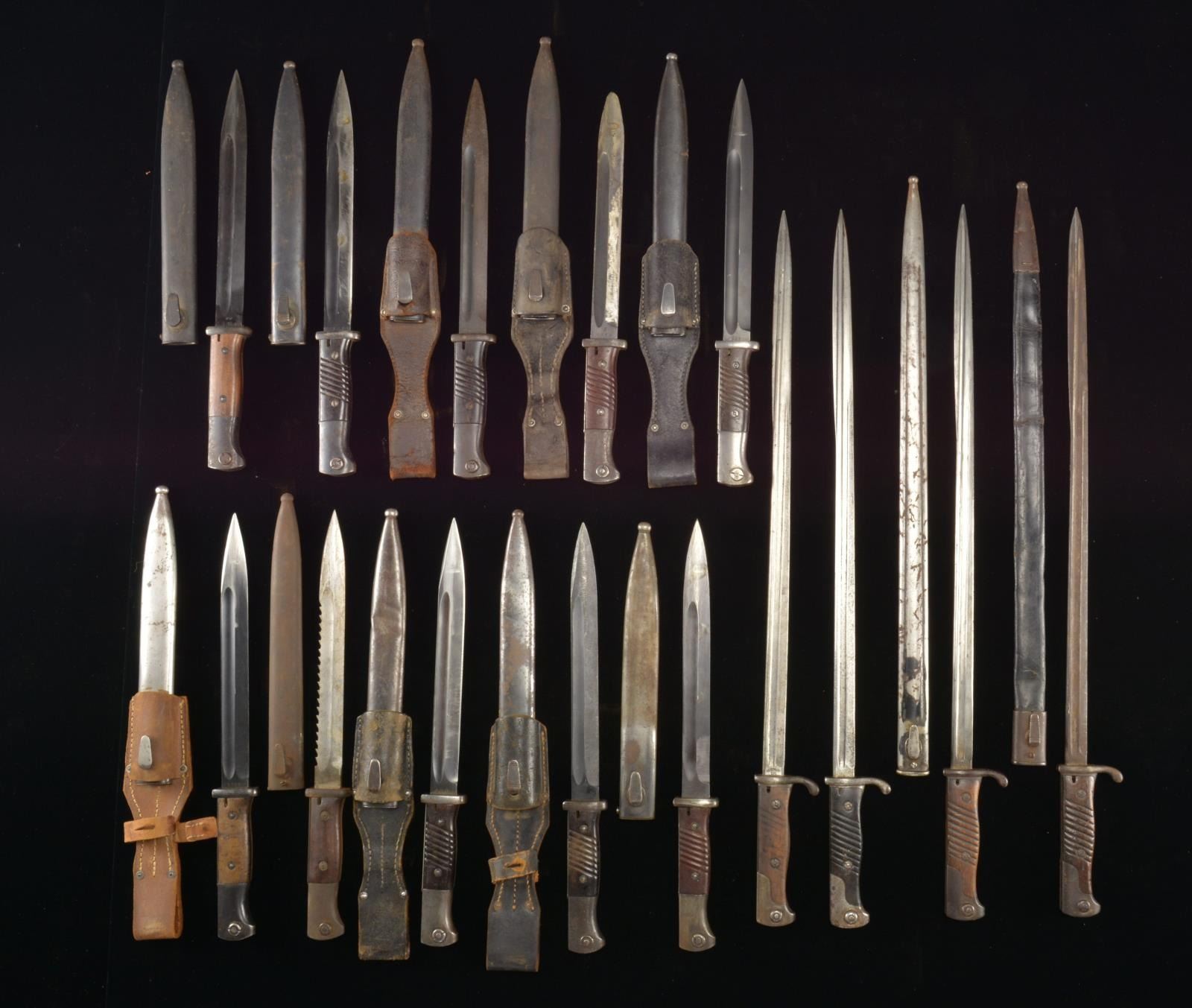 This group includes 5 Mauser K98 bayonets having composite grips, scabbards & frogs. / 1 Mauser K98 bayonet having wood grips, scabbard & frog. / 2 Mauser K98 bayonets having wood grips & scabbards. / 2 Mauser K98 bayonets having composite grips & scabbards. / 1 Mauser K98 bayonet shortened to a trench knife, no scabbard. / 2 M1898 German long blade bayonets, no scabbards. / 1 M1898 German long blade bayonet having scarce original leather scabbard. / 1 M1898 German long blade bayonet & metal scabbard. CONDITION: all bayonets show light to moderate wear except as noted. (02-14267-1(15)/BF). $700-1,000.