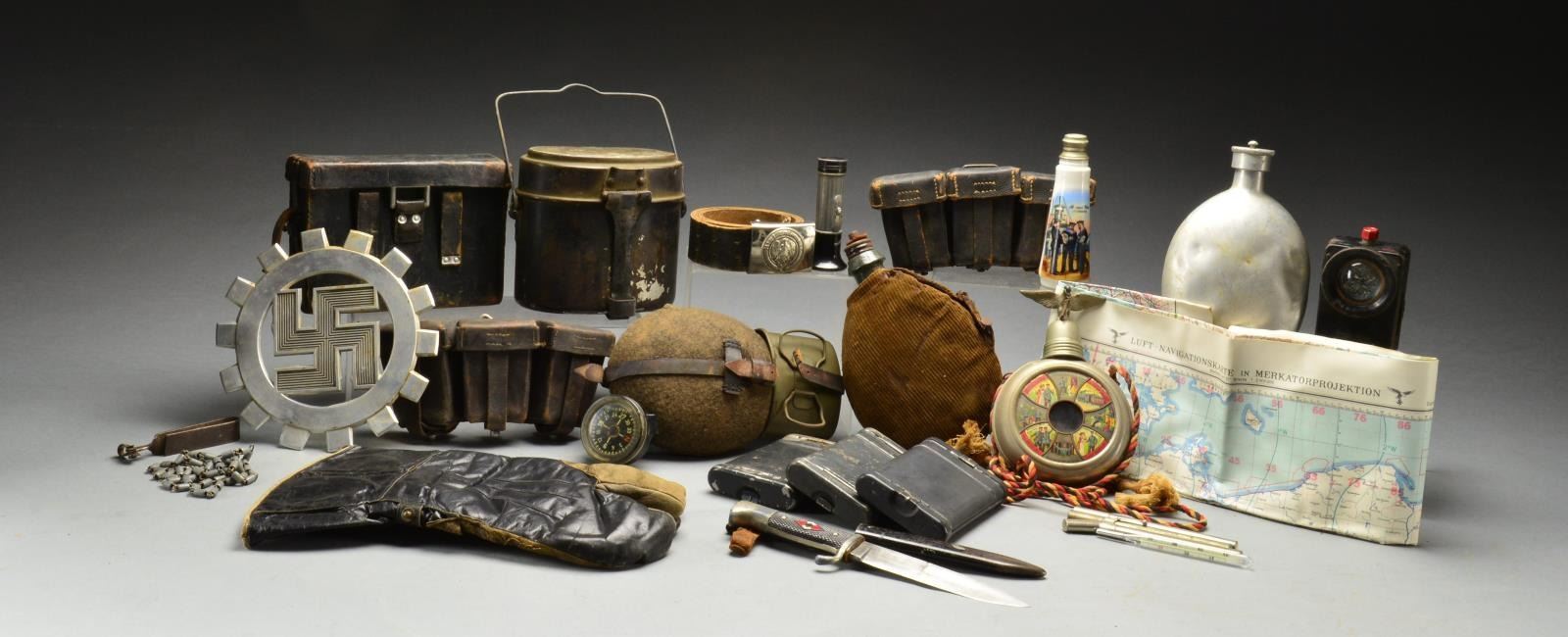 This varied lot includes 1 German canteen & cup. Leather securing strap broken. / 1 German canteen & cup. Leather securing strap intact. / 1 German prewar canteen having a corduroy cover that is torn at the snaps. / 1 German canteen of composite material, no cover & cotton web securing sling. / 1 German canteen. No cup. Securing strap is broken. / 1 German canteen, aluminum body only. / 2 Mauser K98 3 part cartridge pouches. / 1 Holster for a Radom pistol. / 1 Leather equipment pouch dated 1940. / 1 Y strap shoulder sling. / 1 Mess tin. / 1 Ditty bag. / 2 Cotton canvas equipment bags. / 1 Luftwaffe navigational map. / 3 Mauser K98 cleaning kits. / 1 Pertrix flashlight. / 1 Frog for a Mauser K98 bayonet in canvas & leather. / 1 German dog tag. / 1 Hitler Youth knife marked, “RZM M 7/5”. Knife shows light to moderate wear. Diamond is undamaged. / 1 Pair of cold weather leather mittens in rough condition. / 1 Shooter’s lanyard. Lanyard emblem is crossed swords superimposed over a shield. / 13 Aluminum Luftwaffe spoons. / 1 Hitler Youth belt & buckle. / 2 Blue & white army sports shirt eagles. / 1 Soldbuch. / 1 Sm. book titled, “KRIEGSFLUGZEUGE” published in 1943. / 1 Police sword knot showing moderate wear. / 1 Piece of zeppelin w/ an inscription dated 20 October 1917. / 1 Hitler Youth ID book w/ several personal pictures. / 1 WWI veteran’s souvenir canteen. / 1 Aluminum DAF cogwheel measuring 8" in diameter. / 2 Official ink stamps of unknown age for stamping official documents. / 1 Sm. hand flashlight. / Pictures of a Luftwaffe officer. / 1 Wrist compass & partial strap. / 1 Sm. field green pouch holding 1940 dated gauze. / 1 Police sword knot in relic condition. / 9 Aluminum name plates taken from a German airfield hanger. / 3 Thermometers. / 3 Pieces of metal equipment. / 1 Pack of cigarettes. / 3 Plastic navigation aids. / 1 Lusitania medal dated 1915 of unknown age. / 1 WWI era naval veteran’s souvenir porcelain bottle. / 1 Repro SS buckle. / 2 Sm. boxes of German & Swiss buttons. / 2 Hitler Youth sports shirts. / 1 Army sports shirt. CONDITION: most items show light to moderate wear except as noted. Sports shirts have staining. (02-14331/BF). $800-1,200.