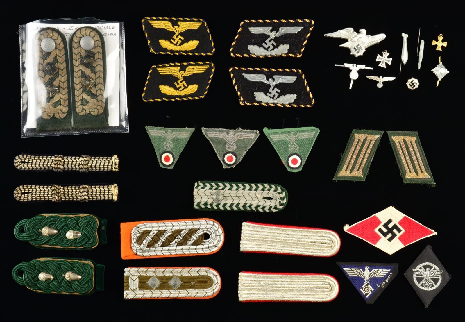 This group includes 1 pair of police officials shoulders straps. / 3 Single police shoulder straps. / 1 Pair of forestry official shoulder straps. / 1 Pair of artillery 2nd Lieutenant shoulder straps. / 1 Pair of silver & black shoulder straps possibly for SS. / 2 Pairs of Reichbahn collar tabs. / 1 Pair of Army collar tabs. / 3 Army M43 cloth cap eagle/cockade combinations. / 1 Teno cap eagle. / 1 Hitler Youth diamond patch. / 2 Miniature medals. / 2 WHW pins. / 3 Aluminum cap eagles. / 1 Sm. RLB pin. CONDITION: all items show light to moderate wear. (02-15133/BF). $600-800.
