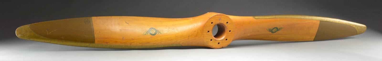 1) PROPELLER. Propeller measures 42 1/4" long. It has red painted tips. 1 Tip is stamped w/ an anchor & “US”. Decals on each side read, “Globe Corporation AIRCRAFT DESIGN JOLIET ILLNOIS”. The hub is marked, “GLOBE PART NO 33P85 MODEL 5 SENSENICH SERIAL NUMBER S4969”. Propeller has a sm. clock mounted in the center of the hub, not damaging the propeller. CONDITION: storage wear only. 2) PROPELLER. Propeller measures 48" long. A wooden propeller that appears to be handmade. It is dark stained wood. CONDITION: there appears to be a sm. glob of black paint on 1 side of the propeller, otherwise it shows light to moderate wear. (02-14423(2)/BF). 3) LARGE PROPELLER. Propeller measures 85" long. It is brass edged on the tips & lead edge. 15" Of the tip are painted a dark green brown. Decals on the right & left are a green circle flanked by gold wings. The circle reads, “SENSENICH BROS. LITITZ, PA. SB”. There is a stamp near the right tip that reads, “SENSENICH BROTHERS INSPECTED AND APPROVED NO. 3”. CONDITION: propeller shows storage wear only. (02-14425/BF). $500-800.