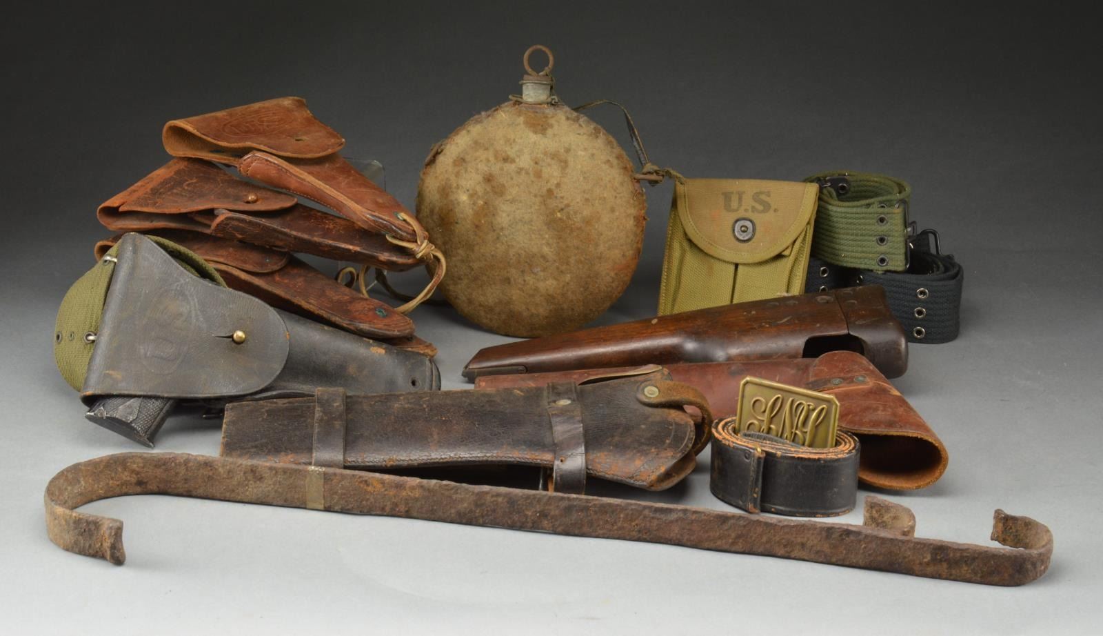 WWI/WWII HOLSTERS & MORE. This group includes 18 Indian War period enlisted military leather belts, none have buckles. / 1 Pistol cartridge belt circa 1900. / 3 Masonic style leather belts. / 1 Buff white leather belt, no buckle. / 1 Artillery cinch belt. / 1 Gentleman’s waist belt. / 1 Bag of leather parts & buckles. / 1 Sling for a Civil War musket. / 1 Iron food kettle. / 1 Iron water boiling kettle. / 1 Forged iron trammel. / 1 Stereoviewer. / 1 Painting of a British officer. / 1 Oval frame. / 1 Navy knife. / 1 Fountain pen. / 1 Excavated Gardner bullet. / 2 Tin candlesticks. / 4 Cotton web pistol belts. / 1 Cotton web pistol belt having a .45 holster attached holding a dummy .45 Auto. / 1 Civil War canteen, cover & stopper. / 4 Brown leather .45 Auto holsters. / 1 Indian War carbine boot. / 1 State of NY circa 1900 belt & buckle. / 1 20th Century holster for a Colt Army. / 1 OD clip pouch. / 1 Canadian Ingliss High Power pistol stock. CONDITION: most items show light to moderate wear. Belts are quite stiff. Iron is quite oxidized. (02-14376-1/BF). $700-1,000.