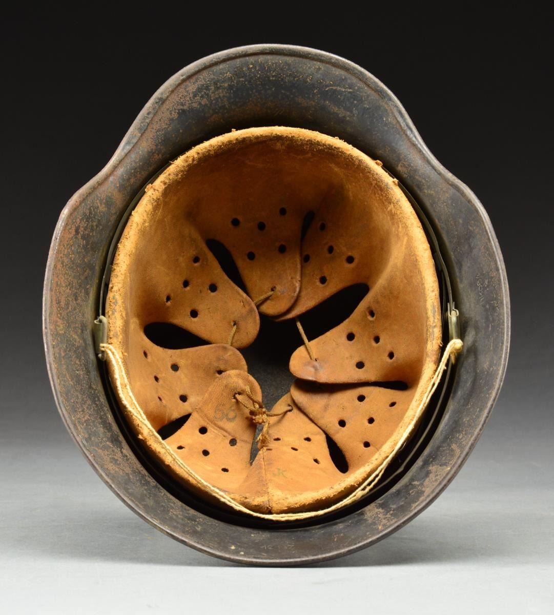 This helmet is a single decal type w/ original dark blue/gray finish. Embossed vent w/ rolled rim. Inside rear of helmet is stamped, “12 167”. Inside left is stamped, “hko64”. Tan leather 8 finger liner w/ the initial “K” penned in the back & size stamped “56”. No chinstrap. CONDITION: decal is about 85%. Helmet finish is about 70%. Liner shows wear but is complete. (02-15180/BF). $500-700.