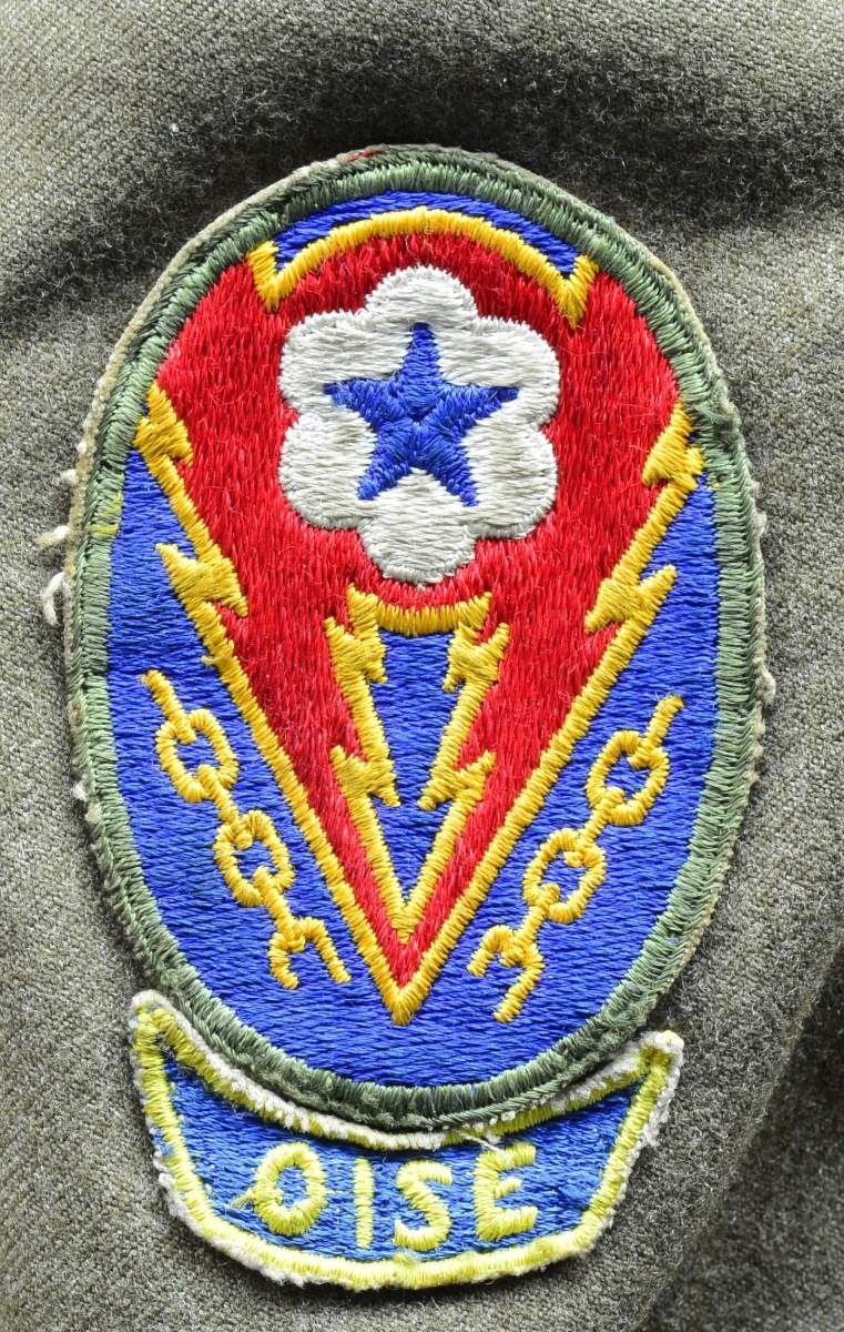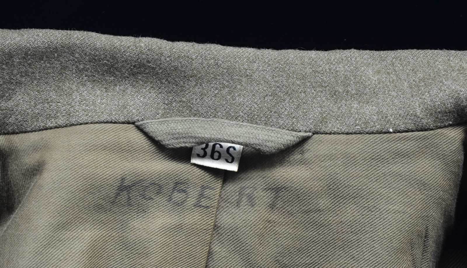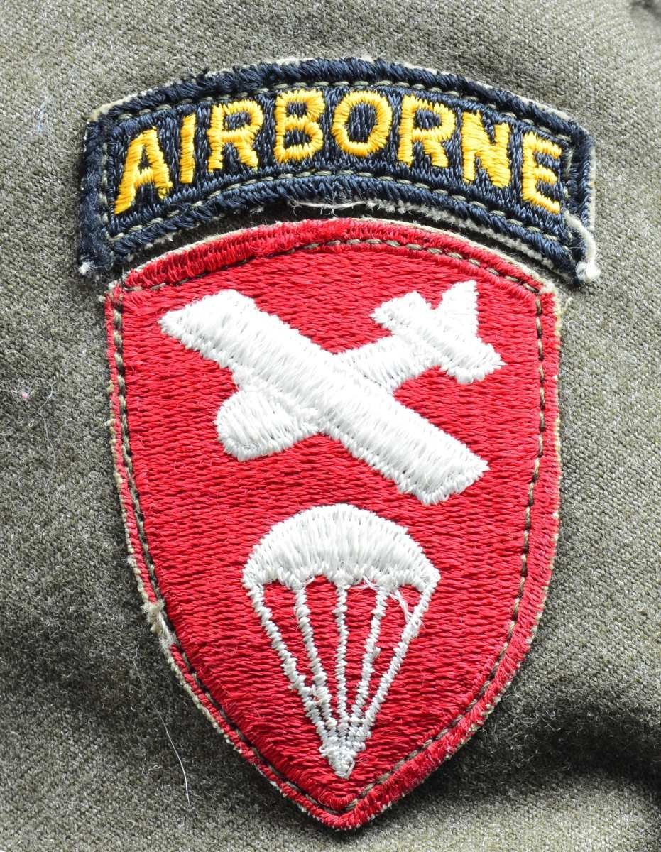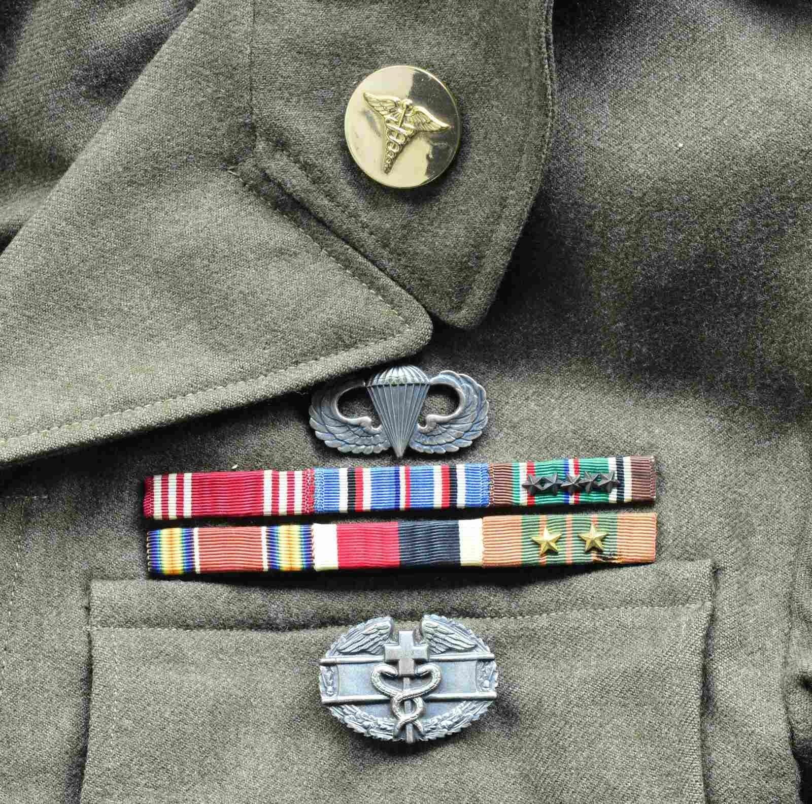 M1 Helmet w/ red crosses on white background. "Ike" jacket w/ insignias, ribbons, jump wings & combat medical badges. Khaki shirt w/ "ruptured duck" service insignia & wool OD green trousers. Khaki tie. Helmet liner has airborne chin strap & leather liner chin strap. Helmet has 4 red crosses on approx. 3 3/4" white circular background. "Ike" jacket has US & medical collar brass. Right shoulder has airborne tab over Airborne Command division patch showing glider over parachute. Left shoulder patches are Post WWII European Theater Operations w/ "OISE" patch underneath. Left breast has Combat Medic badge on pocket tab, 2 row campaign ribbons includes American Campaign, European-African-Mid Eastern Campaign, WWII Victory, & Navy Occupation Service. Coat is sized 36S & name inked inside "KOBERT". Pants are 34 waist & 35 leg. CONDITION: helmet has light wear & staining commensurate w/ some careful use, but generally good appearance. Jacket in very good condition w/ very light wear & sm. staining issues. Pants, tie & shirt all are in good condition showing light wear. (02-14983/RW). $800-1,200.