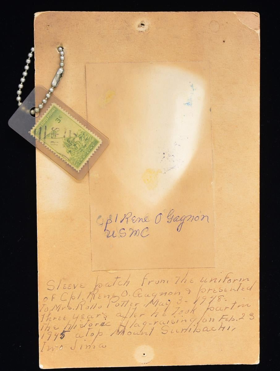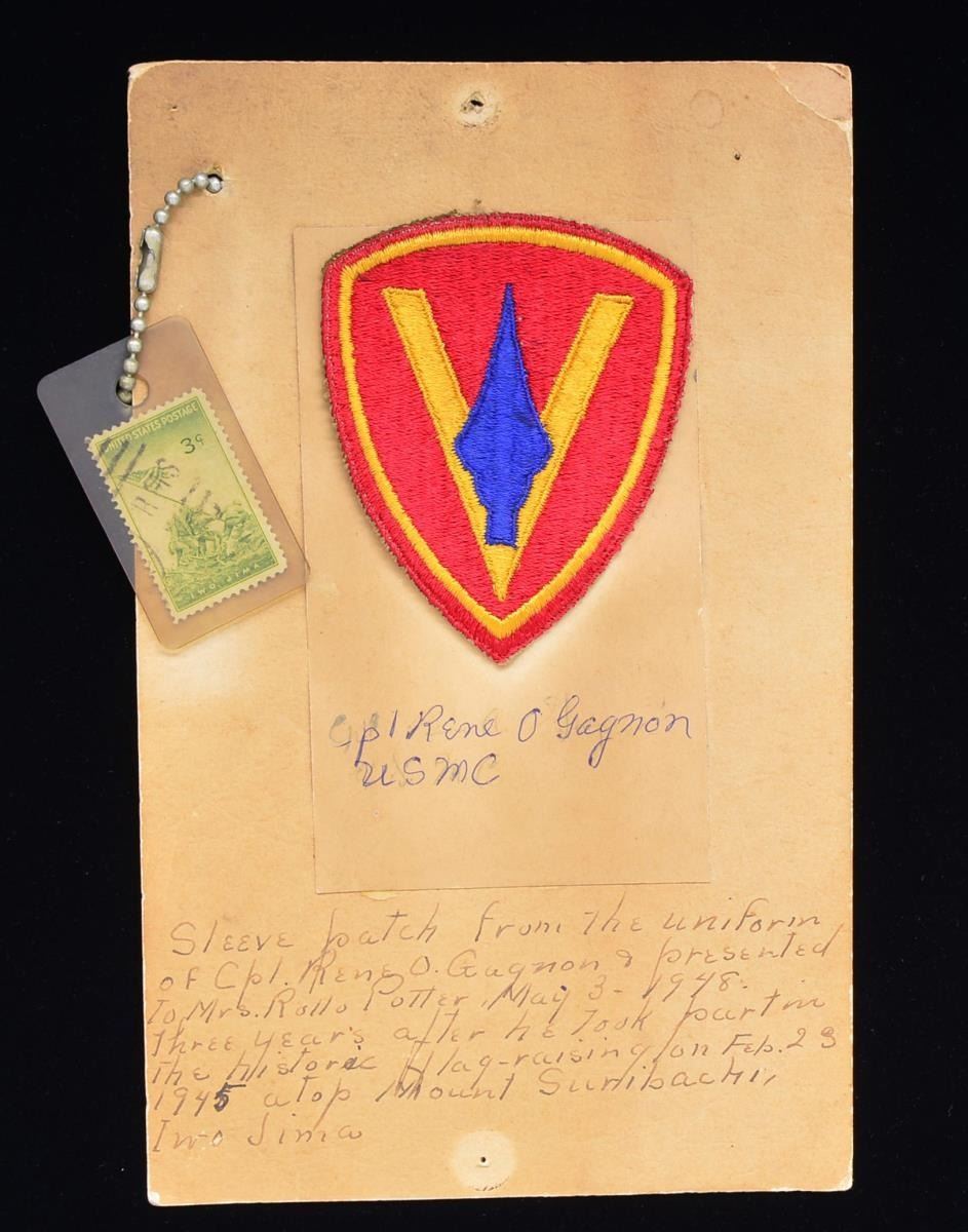 A. GAGNON WHO WAS INVOLVED IN THE FLAG RAISING ON IWO JIMA. A spectacularly historic patch belonging to one of the principles of the flag raising on Mt. Suribachi during the Battle of Iwo Jima. Corporal Gagnon’s involvement in the flag raising has been up for debate for many years. What seems to be certain is that Cpl. Gagnon lowered the first flag raised on Mt. Suribachi & returned it to Marine headquarters. He then carried a larger flag, along w/ a radio, back up Mt. Surbachi to be raised in place of the smaller flag. Though Cpl. Gagnon, who died in 1979 maintained that he helped raise the second flag, Research has determined that he was not one of the Marines in the famous photo of the flag raising. Whether he had hands on the flag pole or not, Cpl. Gagnon was instrumental in the flag raising, creating one of America’s most iconic images. The patch is signed on the reverse, “Rene A. Gagnon”. The patch once belonged to Mrs. Rollo B. Potter of Acworth, NH who operated a private museum w/ a collection of military & political curiosities. Her mounting card is attached that reads, “Cpl. Rene A Gagnon USMC” & “Sleeve patch from the uniform of Corporal Rene A Gagnon & presented to Mrs. Rollo Potter May 3-1948. Three years after he took part in the historic flag-raising on Feb. 23, 1945 atop Mt. Suribachi, Iwo Jima”. Attached to the card is a 3 cent Iwo Jima stamp housed in plastic. It is hard to imagine a more historic Marine Corps patch worthy of any museum or the most advanced collection. CONDITION: patch shows overall light wear. Card mounting is a bit discolored w/ less discoloration under the patch. Writing remains clear & legible. (02-15010/BF). $800-1,200.