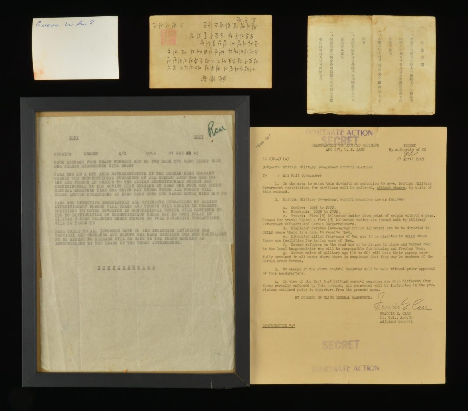 A grouping of documents & Identifications from a US Army soldier who was a radio & teletype operator in the signal corps at the end of WWII. These were discovered in a shoe box by his son. John P. Reed stayed in the service & became an officer with the rank of Captain & also served in the Korean War. Research discovers a roster listing Captain John P. Reed as a member of the 814th Tank Destroyer Battalion This grouping contains: 1) An interesting document stamped SECRET in two places released by the headquarters of the 7th armored division regarding British military control measures & covering multiple topics such as curfews, liberated Allied POWs, Displaced People, German refugees, German detainees etc. This is dated the 27th of April, 1945 & is a signal that WWII in Europe was coming to an end. CONDITION: this is in sound condition darkening commensurate w/ aging & very light staining. Notable approx. 2" tears on top & right side of document, but reads clear & legible. 2) A rice paper copy of the surrender of the Germans dated 07 May 1945 w/ instructions for Allied forces to remain in place and cease all offensive actions. This is marked CONFIDENTIAL. CONDITION: document was originally folded & stored under glass. It has very fine fold lines w/ flexing & sm. edge tears w/ very light staining. Document is legible. 3) Captain Reed’s Korean War Internal Security Clearance Card signed by both a General Lee Bum Suk (Korean Liberation Army) & US Brigadier General W L Roberts, Advisor to Director. CONDITION: card has been folded & has lightly stained aged appearance, but photo graph, signatures & print legible. Korean characters on reverse are all legible. 4) A similar document w/ Japanese kanji used for his clandestine, intelligence related activities. Also included is photograph of John Reed & unknown female. CONDITION: card is in legible condition w/ clear photograph, however it does have carrying wear, flexing & light staining. Black & white photograph has good clear appearance. (02-14960/BS). $1,000-1,300.