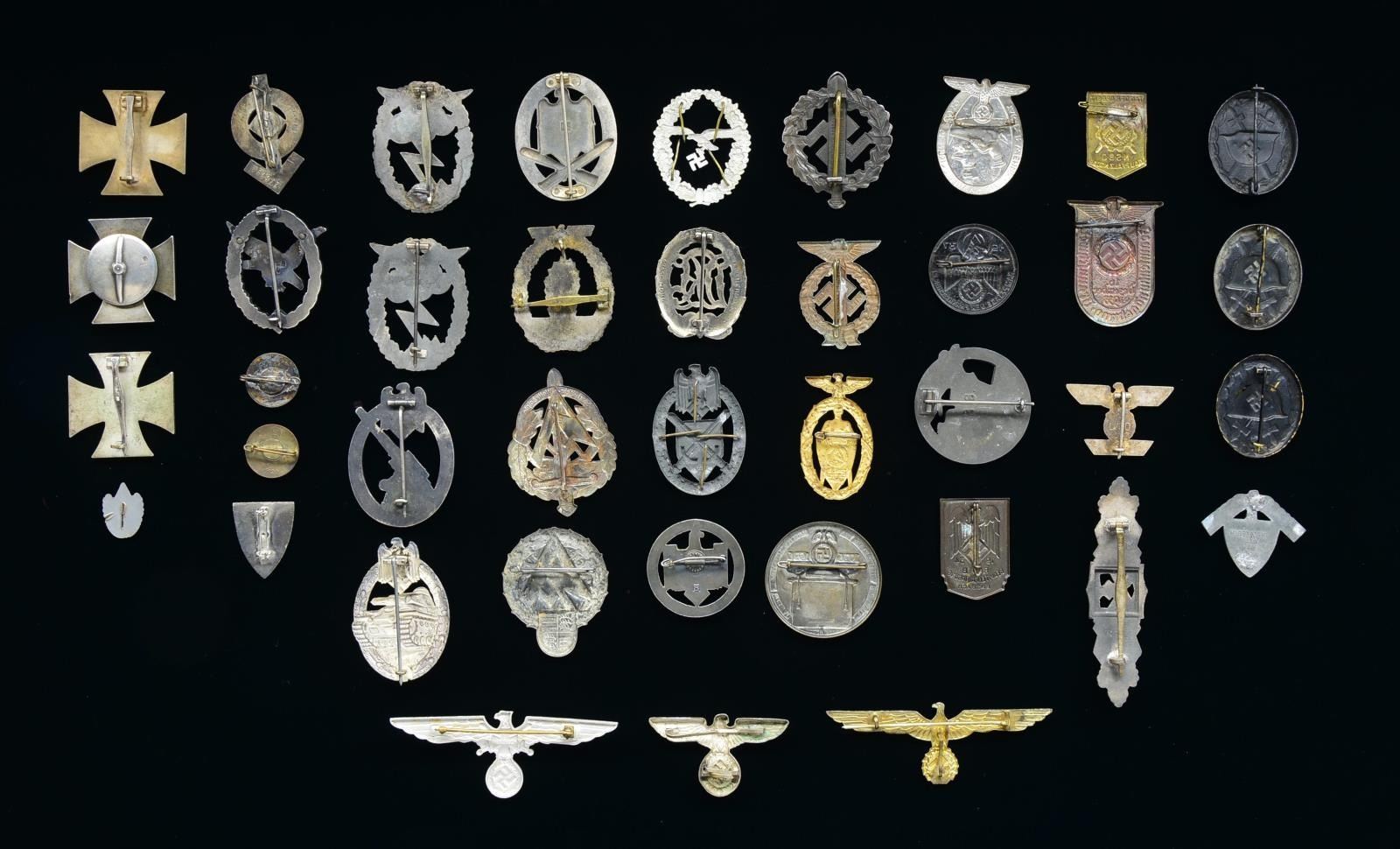 This varied group includes 3 Black Wound badges. / 1 Army Silver Close Combat badge showing oxidation. / 1 Police cap eagle. / 1 Army General Assault badge. / 1 Party pin w/ damaged enamel. / 1 Post war Veteran’s pin. / 1 Screw back 1st Class Iron Cross having a nonmagnetic center. / 2 Pinback 1st Class Iron Crosses. / 1 Aluminum cap eagle for the Kyffhauserbund. / 1 Navy breast or cap eagle. / 1 Navy Mine Sweeper badge. / 1 Luftwaffe Air Gunner’s badge, no lightning bolts. / 1 Hitler Youth Proficiency badge. / 1 Army Flak badge. / 1 Army Tank Assault badge. / 1 Spange. / 2 Luftwaffe Ground Assault badges. / 1 DRL Sports badge. / 1 Bronze SA Sports badge. / 1 RAD cap badge, missing pin. / 1 Party pin. / 1 Plastic Hitler Youth 1942, pin missing pin. / 1 Luftwaffe badge for a shooting lanyard. / 1 Army badge for a shooting lanyard. / 1 Blockage Runner badge. / 11 Tinnies, most of which are high quality seldom seen examples. CONDITION: most items show light wear, except as noted. PROVENANCE: Roger Ballard collection. (02-15153-2/BF). $1,300-1,600.
