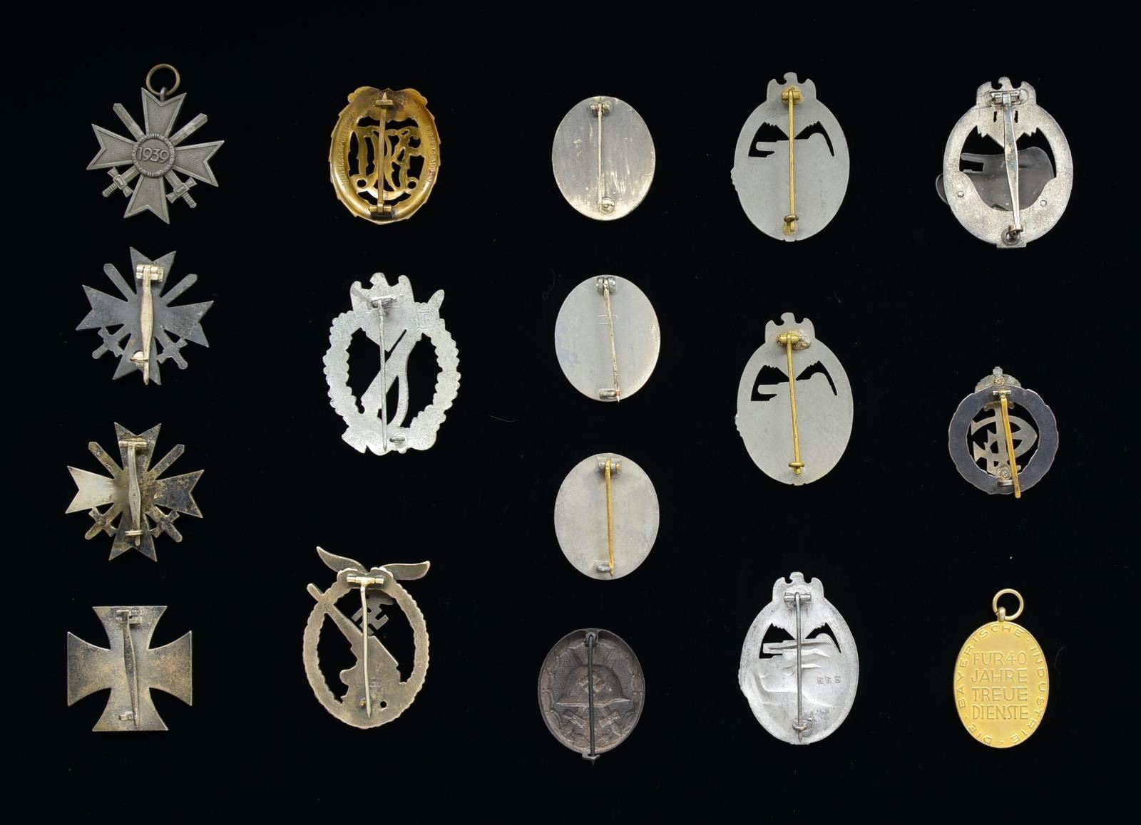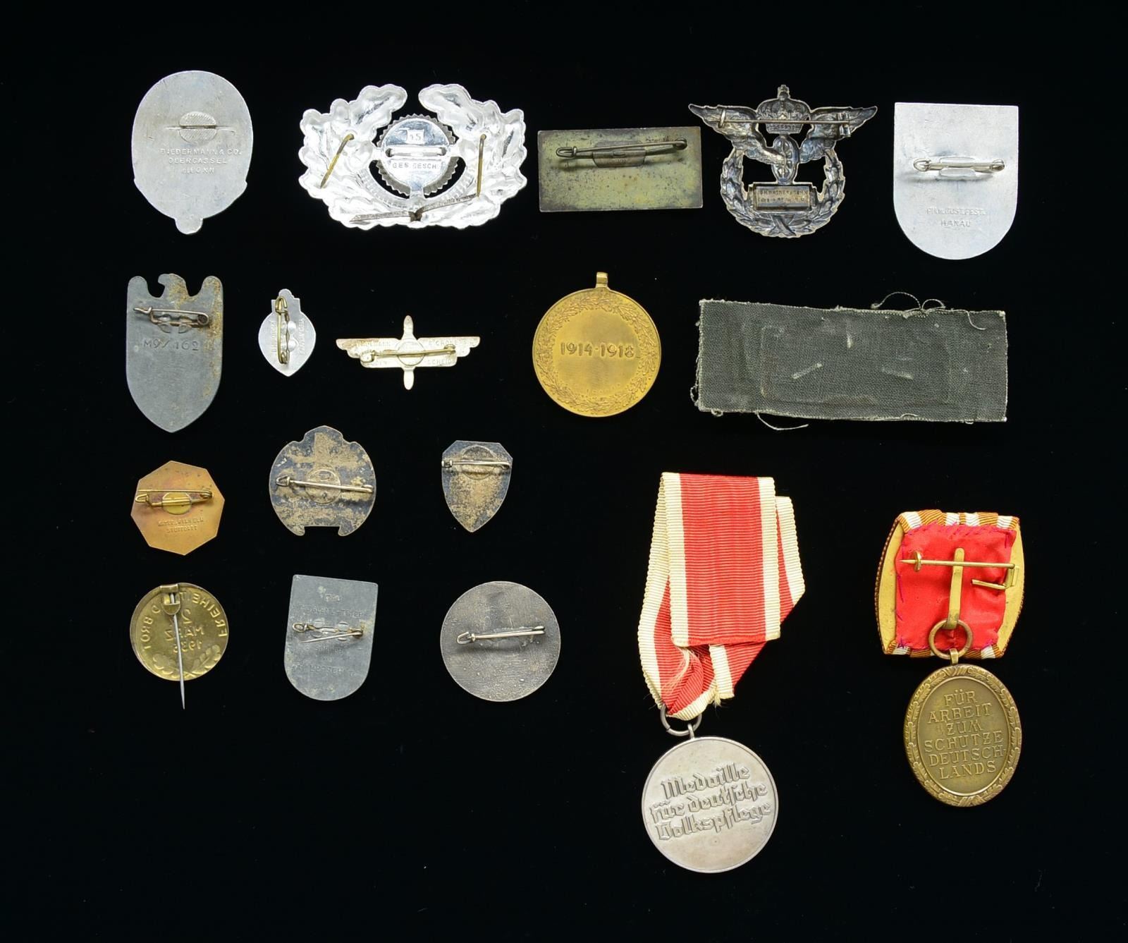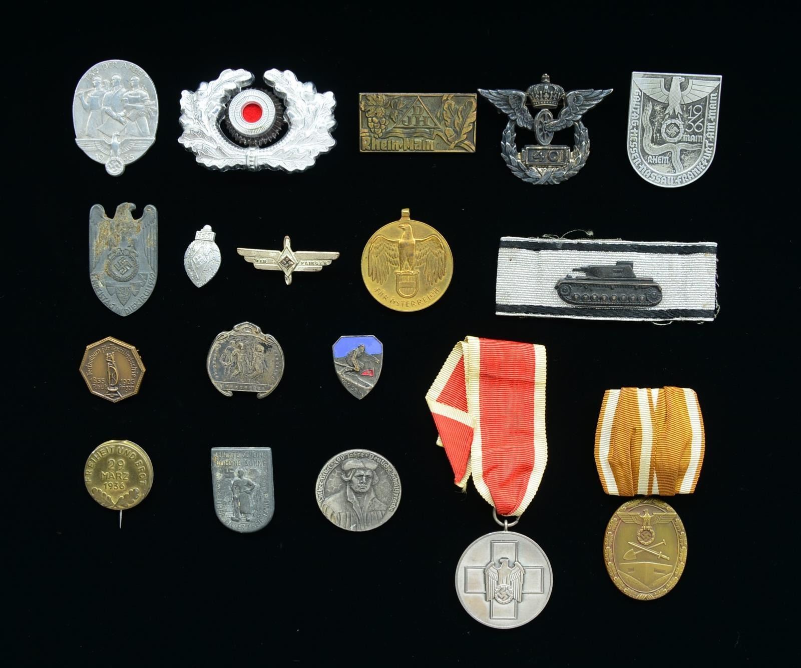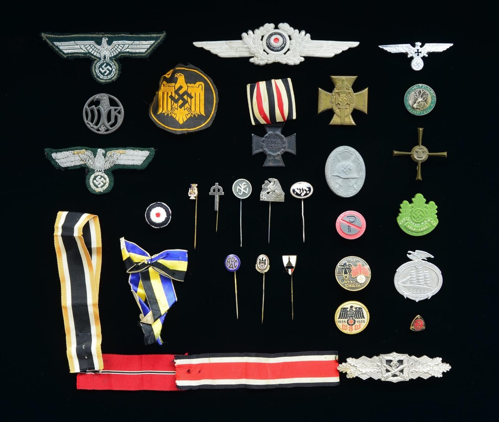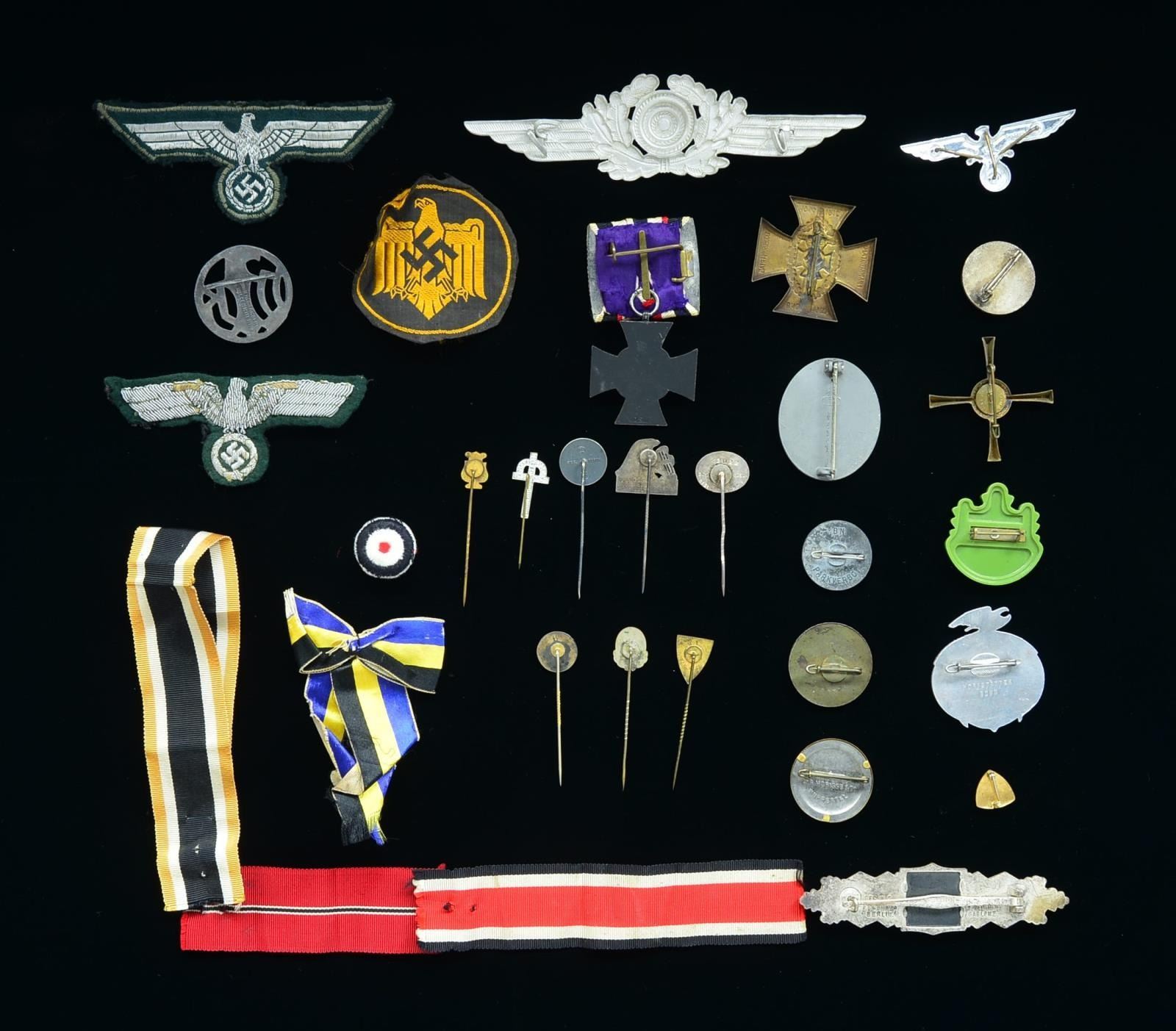 PINS & MORE. This varied lot includes 3 WWI 1914-1918 crosses w/ swords & ribbons. / 1 Next of kin WWI 1914 cross, w/out swords on ribbon bar. / 1 Russian Front medal. / 1 War Merit Cross w/ swords & ribbon. / 1 War Merit Cross w/out swords, no ribbon. / 1 WWI Iron Cross Second Class w/ ribbon. / 1 Red Cross Social Welfare medal w/ ribbon. / 2 WWI medals w/out ribbons. / 2 War Merit Crosses w/ swords, no ribbons. / 2 First Class War Merit Crosses w/ swords. / 1 First Class Iron Cross. / 9 Pieces of ribbon for medals. / 1 DRL Sports badge. / 1 Silver Close Combat badge of questionable age. / 1 25 Panzer Assault badge of questionable age. / 3 Panzer Assault badges. / 1 Luftwaffe Flak badge. / 1 Infantry Assault badge. / 4 Silver Wound badges. / 1 Black Wound badge. / 2 Police sleeve patches. / 2 Army breast eagles. / 1 Tank Destroyer sleeve badge of questionable age. / 8 Stick pins w/ 1 SS example being of questionable age. / 22 Tinnies & various commemorative, WHW & celebratory pins. / 1 Driver’s badge. / 1 Imperial Railroad 40 Year Service pin. / 1 Army cap wreath. / 1 Luftwaffe cap wreath. / 3 50 Pfennig coins. / 1 Westwall medal on ribbon bar. / 1 WWI 25 Year Fire Service medal. / 1 Veteran’s cap eagle. / 8 Pieces of German insignia or commemorative medals. CONDITION: all items show light to moderate wear & are in serviceable condition. A few pins may be missing. This group does contain some post WWII mfg. items. Please examine the lot carefully. (02-14351/BF). $800-1,400.