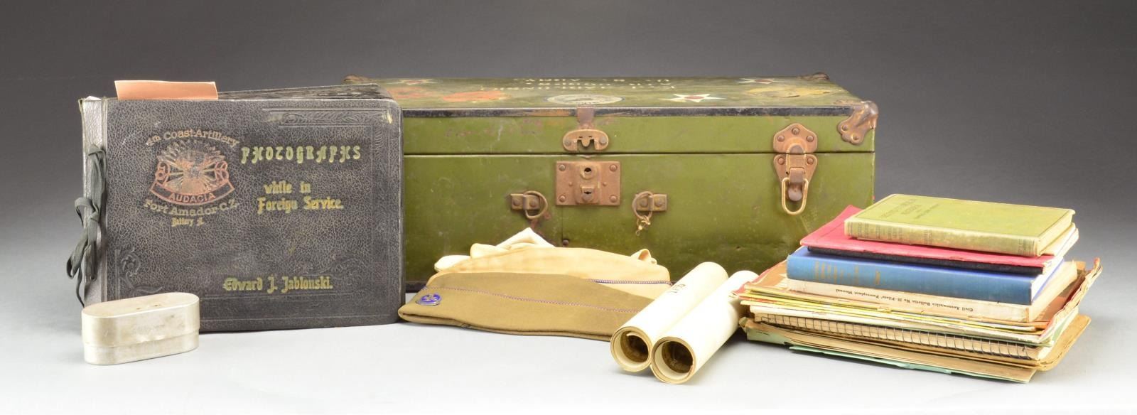A classic WWII foot locker measuring 26" x 13" x 8 1/2". Trunk is painted green w/ black edges & stenciled on the top, “E.J. JABLONSKI AIR CORPS, U.S. ARMY.” w/ 3 Air Corps insignia & trunk stickers from Pan Am, Tampa FL & Army & Navy YMCA. Trunk contains a lg. photo album of hundreds of pictures of Army life including training pictures in CA & FL, artillery pieces & firing, early tanks & ships. There are photos from China showing many dead bodies. Photographs from Panama. Photos from Franklin Roosevelt & other officials. Many photos of airplanes, both civilian & military. Most of the photos appear to be pre WWII. / Trunk also includes 2 overseas caps. / White gloves. / Letters. / Panoramic photographs. / Souvenir pennants. / Several publications relating to the Air Corps, plane maintenance, engines, & many more subjects. / Sm. aluminum bank containing various military insignia. A treasure trove of research material & interesting photographs. CONDITION: most items show light wear. Photos are clear & well mounted. Foot locker is missing its lock. (02-14480/BF). $500-700.