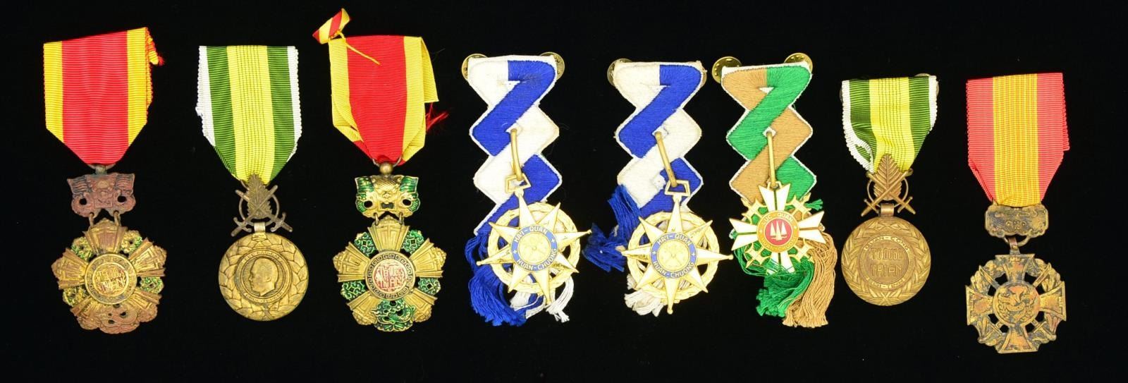 A fine group of 6 Vietnam War period South Vietnamese military medals many of which were awarded to US military serving in Vietnam. Group includes 2 Navy Distinguished Service medals, 1 Cross of Gallantry, 1 Army Distinguished Service Medal, 1 Order of Vietnam 5th class, 1 Order of Vietnam 4th class, 1 Military Merit medal type 1, and 1 Military Merit medal type 3. CONDITION: all medal are complete w/ correct ribbon & show very light wear. (02-15326/BF). $250-400.