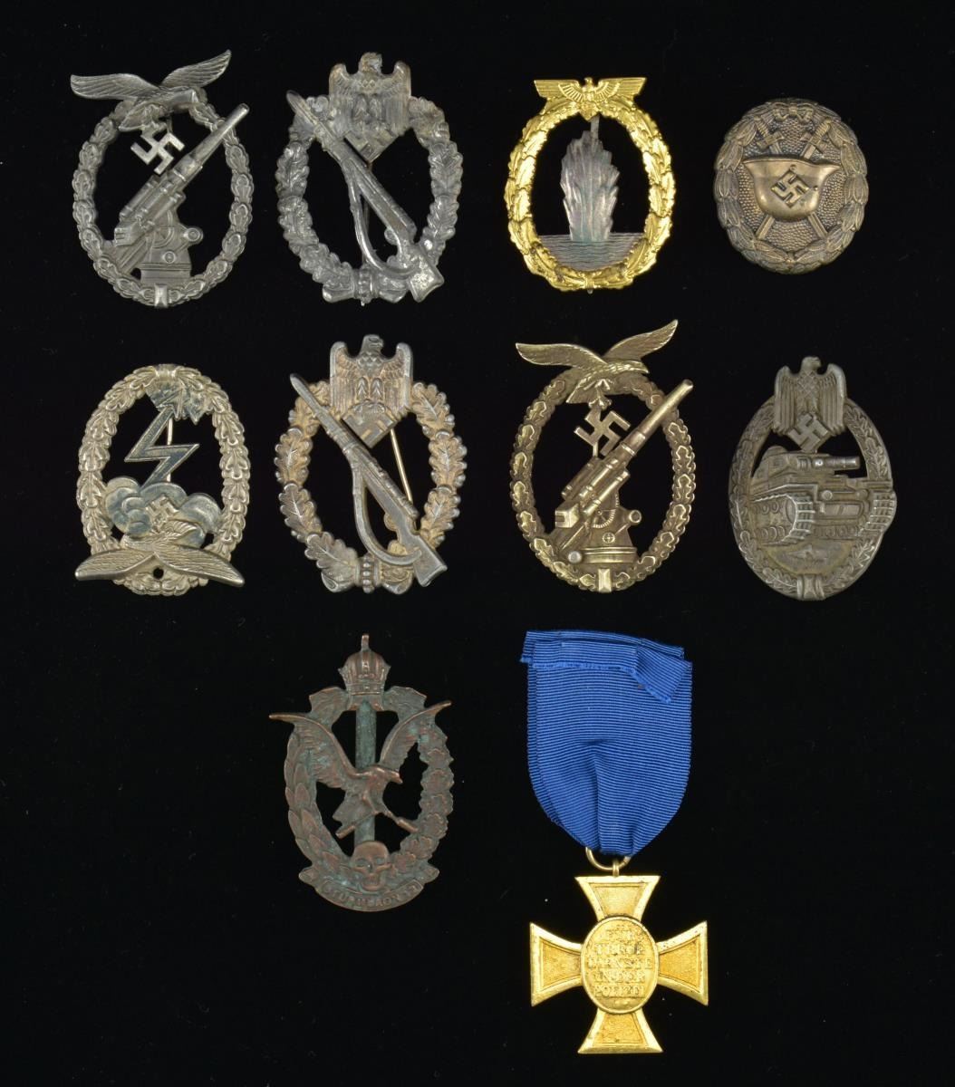 This group of awards includes 1 WWI Austrian “STURMBAON 13” badge. / 1 WWII Infantry Assault badge. / 1 WWII Luftwaffe Ground Assault badge. / 1 WWII Tank Assault badge. / 1 WWII Luftwaffe Flak badge in silver metal. / 1 WWII Infantry Assault badge missing its pin catch. / 1 WWII Luftwaffe Flak badge in gray metal. / 1 Early WWII Black Wound badge. / 1 Navy Minesweepers badge. / 1 Police 25 Year Faithful Service medal w/ cornflower blue ribbon. CONDITION: all items show light wear except as noted. (02-14907/BF). $1,200-1,500.