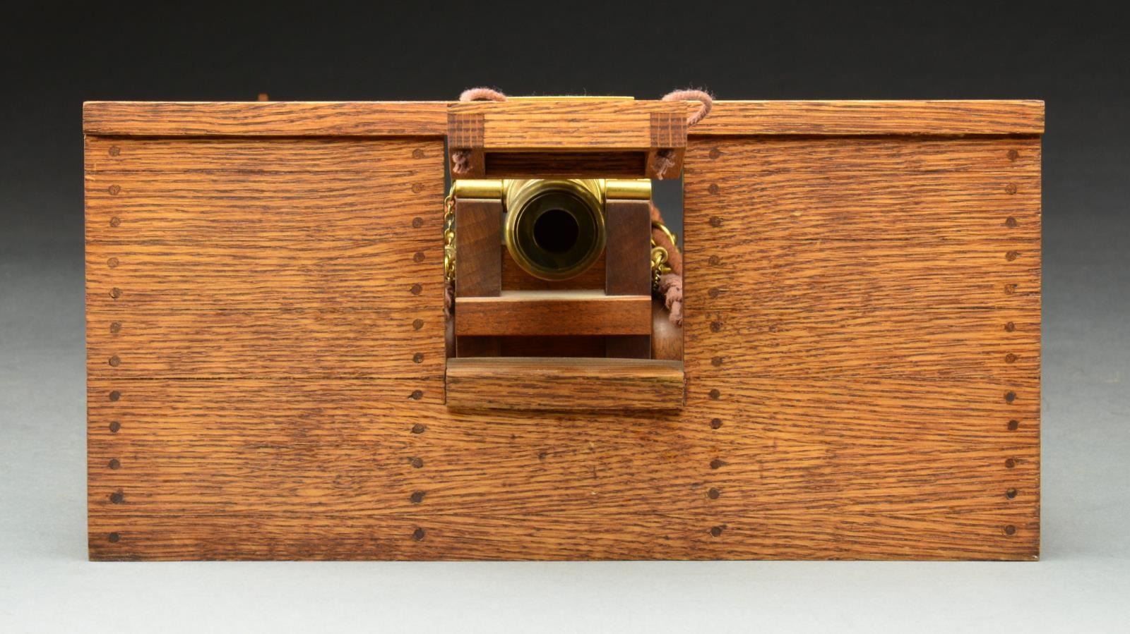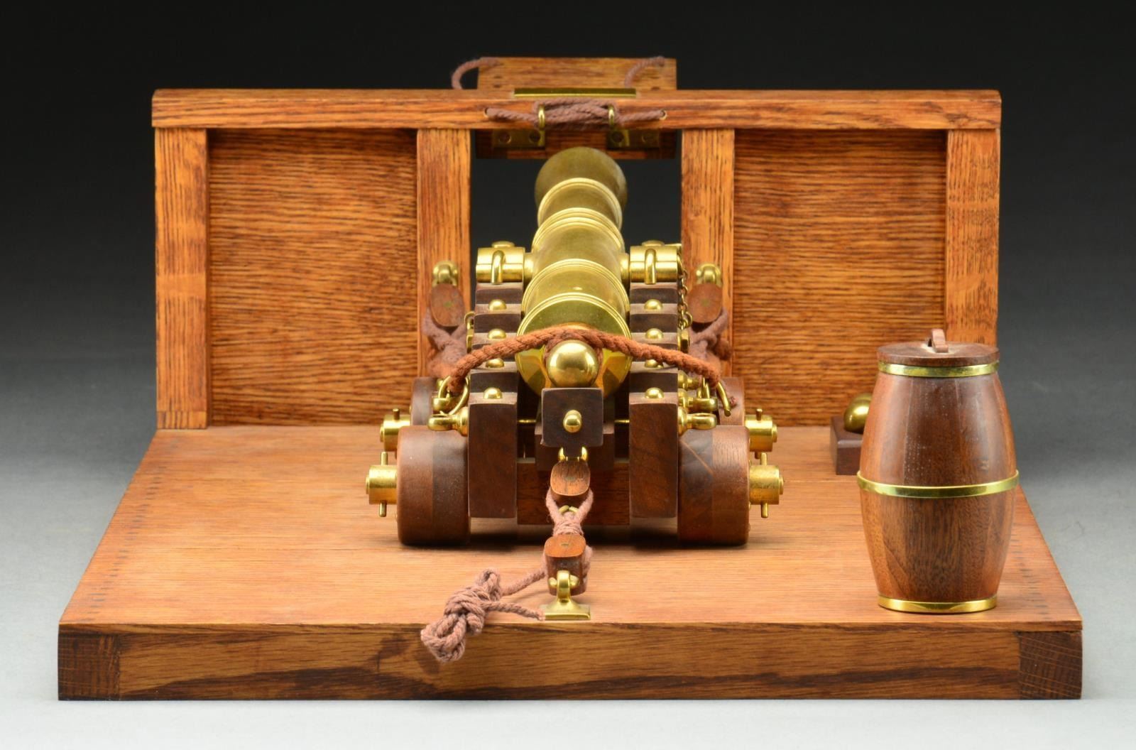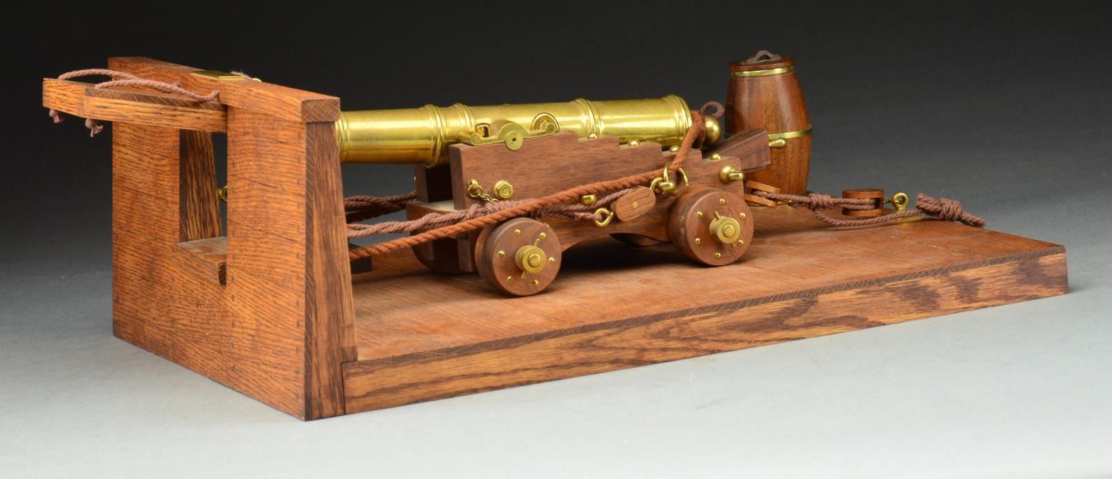 CANNON FROM HMS VICTORY WITH MOCK UP OF GUNDECK RIGGING AND CORRECT STYLE ACCESSORIES. Carl Furr of Orem, Utah is known for his meticulously detailed, firing scale models of varying ordnance. This model of a bronze cannon from the HMS Victory has 10” bbl. including cascabel. Bbl. is nicely turned & polished steel, rests in well detailed naval carriage. Model is mounted on platform representing oak gundeck of the Victory w/ associated pulleys, lines, etc. for operation. Deck & representative side of ship are made of oak & held together by wooden pins (trunnels). Other accessories include water barrel & bucket which are brass bound & made w/ individual staves, a square wooden platform w/ 16 brass cannon balls, as well as associated rammers, mops & levers. CONDITION: very fine, brass parts starting to tone. (02-14741/MGM). $1,500-1,700.