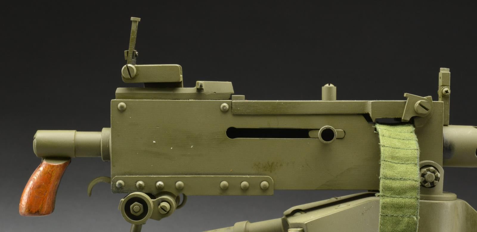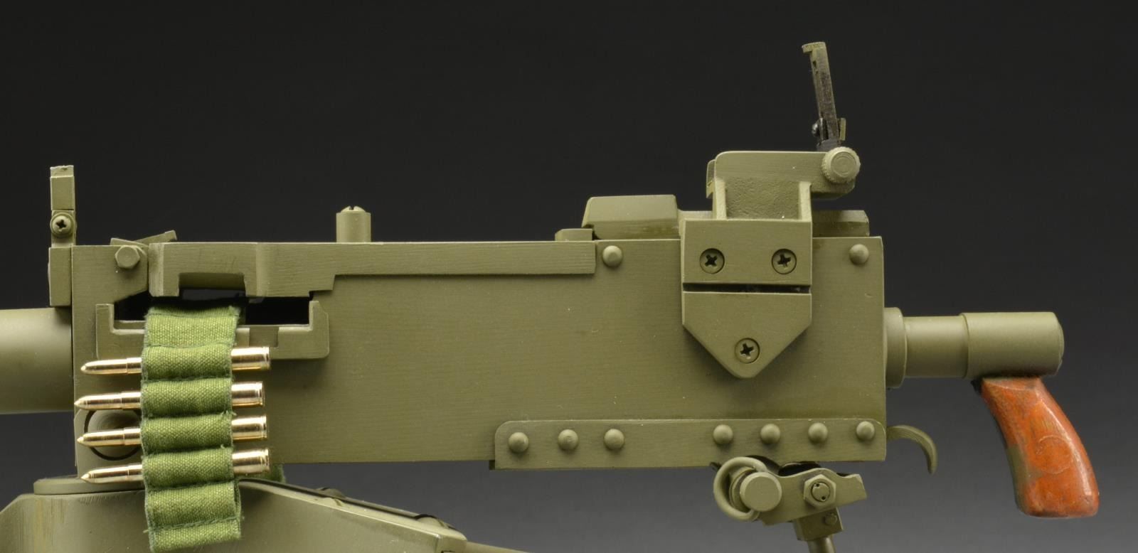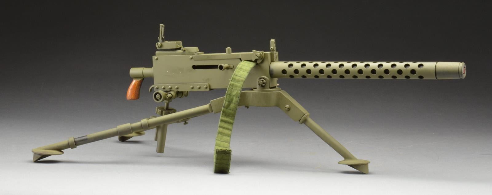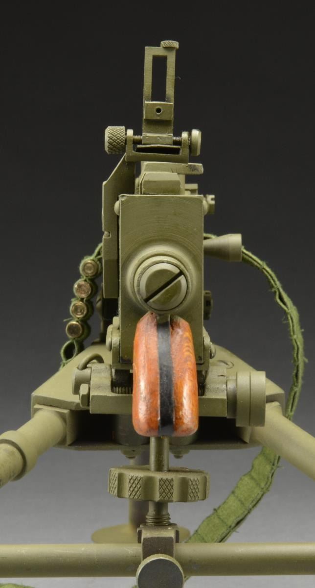 Model measures 24 1/2" x 12 1/2" x 7 1/2" when fully set up w/ the functional tripod legs extended. Very attractive model w/ professional workmanship throughout. Removable solid bbl. Rear sight folds & bolt handle reciprocates. UNATTACHED ACCESSORIES: gun equipped w/ 14" cloth belt & 4 lathe turned steel dummy cartridges. CONDITION: very nice overall condition w/ light high point wear of OD green painted finish. Wooden grip have very nice appearance. (02-14752/RW). $500-1,000.