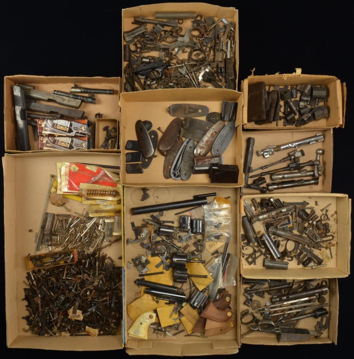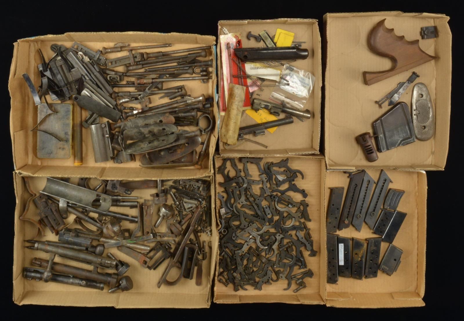 SPORTING. Notable items include: REM. LEE: 45-70 mag. / THOMPSON SUB MACHINE GUN: vertical foregrip & compensator. LUGER PARTS include: 8 mags. 3 -4 inch bbls. / COLT REVOLVER PARTS include: 4 inch Colt New Frontier SAA 4.5 bbl.. / Colt Scout Mother of Pearl Grips. / 3 Sets of Colt Walnut Replacement SAA Grips, / 3 New Service Size 45 cal. Cylinders. 1911 COLT: 4 bbls. 2 W/ factory boxes & Collet type Bushings. 3 Slides- 1 marked Colt's MKII series 70 Gold Cup National Match 45 Automatic / 1 Marked Remington Rand Inc. / 1 Marked Model of 1911 U.S. Army. WALTHER P-38: 2 Bbl.'s w/ Waffenamt WAA 359. / Numerous springs & small parts. WALTHER PP: Slide marked on right side "GEST" "PAUL" "SOO?Polizei." SPRINGFIELD MODEL 1903 Lg. Grouping of Parts includes 4 Bolts. / Striker Assembly for M2 22. / Striker Assembly for 30 caliber Rifles. / 25+ Triggers & Sears / Complete 1903 Rear sight assembly. / 7 Buttplates- Sight parts & covers / Milled & stamped floorplates.12+ Striker Rods. MAUSER RIFLE PARTS include: Bolt & Extractor for "Gew98a" / 4 Firing pins / - Assorted striker springs & small parts. / 10+ Assorted buttplates - military & commercial, ARISAKA PARTS include: 2 Bolts. / 6 Type 38 & Type 99 safety knobs. / 6 Firing pins. / Type 99 trigger guard assembly. Numerous sights, triggers & tangs. MAGS: include 3 Browning 32 ACP Pocket pistol, 2 Browning semi auto 22 pistol. / Mossberg 22 Rifle Mag marked S-L-L-R. Steel ammo. boxes include 7- 50 cal. size & 2- 30 cal. size. CONDITION: parts range from poor, broken, incomplete, to good w/ wear, oxidation, pitting & tool marks. (02-14500/RW). $300-500.