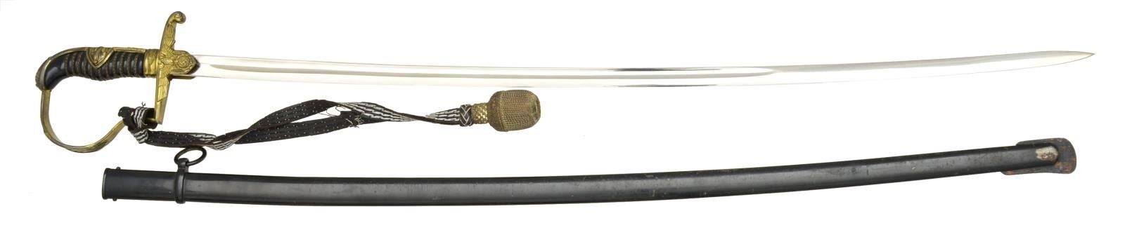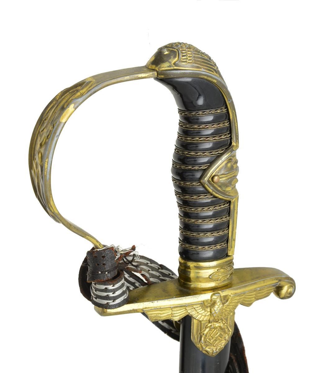 SWORD. Overall length: 36 3/4". Blade length: 31". Single fullered blade stamped at the ricasso, “ORIGINAL (squirrel) EICKHORN SOLINGEN”. Gilded brass hilt w/ lg. spread winged German eagle & Party symbol on the crossguard & languet. There is an oak leaf motif on the knuckle bow & back strap w/ another lg. German eagle & Party symbol at the pommel. Composite grip w/ combination wire wrap. There is a black & silver sword knot attached at the hilt. Black enameled metal scabbard. CONDITION: blade shows substantial original factory polish. Hilt has about 50% original gilding. Grip shows light wear. Sword knot has a repaired break & shows moderate wear. Scabbard has minor loss of finish, particularly near the drag. (02-15002/BF). $700-1,000.