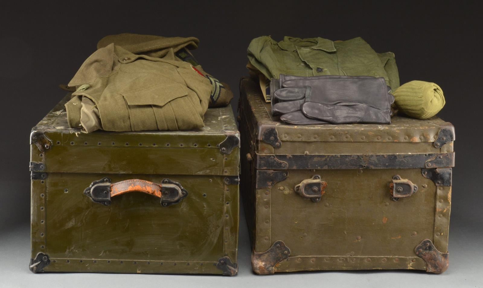 This group consists of 2 foot lockers filled w/ uniforms belonging to a member of the 31st US Infantry Regiment which include 1 Wool overcoat. / 2 Wool undershirts. / 2 Wool long johns. / 1 Wool shirt. / 2 Wool sweaters. / 8 Pair of wool trousers. / 2 Wool visor cap covers. / 1 Wool overseas cap. / 1 Field coat, unissued. / 2 Field coats for a Sergeant 1st Class in the 7th Division. / 1 Field coat w/ a 1st Army patch. / 6 Pair of summer weight socks. / 2 Green fatigue shirts. / 2 Green fatigue pants. / 3 Pairs of leather gloves. / 1 Pair of wool gloves. / 4 Tan visor cap covers. / 2 Pairs of shorts. / 2 Tan overseas caps. / 1 Tie. / 2 Belts. / 1 Pair of Sergeant stripes. / 11 Summer weight khaki dress shirts. / A framed poster measuring 19" x 23" depicting 5 members of the 31st US Infantry together w/ a polar bear. All items reportedly belonging to R.L. Bates, a member of the 31st Infantry Regiment also known as the Polar Bears primarily because of their Russian service in 1918 in the bitter cold of Siberia. CONDITION: many of the items are in unissued condition. The items that were issued remain lightly worn. (02-14890/BF). $300-600.