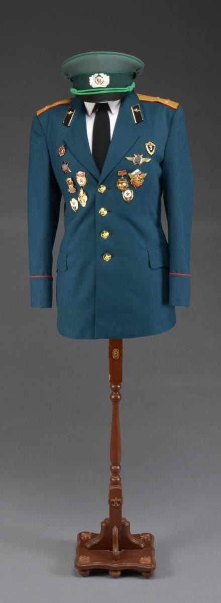 A Russian officer’s military uniform w/ collar tabs & shoulder boards. There are 11 Soviet pins, awards & medals on the front of the uniform. Buttons have the hammer & sickle motif. Uniform comes w/ a shirt & tie for display. The hat is an East German enlisted man’s hat w/ green piping & chinstrap. The stand consists of a mannequin body on a tall plant stand. CONDITION: uniform & hat show very little wear. Stand shows light wear. (02-14083/BF). $100-200.