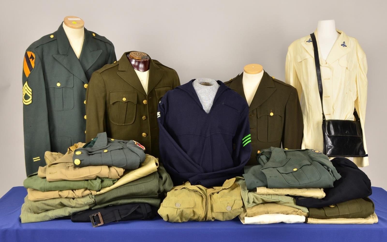 1) This group includes a WWII Army officer’s uniform & 2 overseas caps. / Army fatigue shirt. / 2 Pairs of khaki pants. / WWII Army officer’s uniform in khaki w/ pants. / Enlisted Specialist 1st Class tunic. / 1st Sergeant’s uniform for the 1st Cavalry. / Specialist 1st Class fatigue shirt. / Private 1st Class fatigue shirt. / Khaki dress shirt. / Pair of green military overalls. / Green overalls for the 1st Army. / WWII fatigue pants. / Dark green uniform & trousers for a Navy Lieutenant JG. / Pair of green dress uniform pants. / Blue Navy jumper. / Woman’s Naval Ensign’s white uniform, purse, buttons, gloves, skirt & several hats. / WWII Army fatigue shirt. / Khaki Naval officer’s uniform. / Dress white Naval officer’s uniform, badly stained. / New York militia foul weather coat. / Naval officer’s uniform, pants, tie & overcoat. / 3 US Army officer’s tunics. / 1 Army Air Corps fatigue shirt. CONDITION: uniforms & associated items show light to moderate wear except as noted. (02-14477/BF). 2) This group includes a post WWII Army officer’s tunic & shirt. / WWII officer’s uniform & belt. / WWII New Jersey officer’s uniform & pants. / WWII officer’s uniform coat. / Post WWII specialist uniform. / WWII winter flight shirt. / WWII reproduction tunic. / US Navy enlisted jumper & pants in blue. / US Navy enlisted jumper & pants in white. / Army fatigue shirt & pants. / 2 WWII Army fatigue shirts. / 7 Army Air Corps shirts. / 2 Pairs of WWII coveralls. / M43 field jacket. / 4 Undershirts. / WWI shirt. / US Army fatigue shirt. / 7 Army fatigue & dress shirts. / WWII khaki officer’s uniform w/ shirt. / US green Naval Chief’s tunic. / Khaki shirt, badly stained. / US khaki Naval Chief’s uniform. CONDITION: uniforms & associated items show light to moderate wear except as noted. (02-14485/BF). $600-900.
