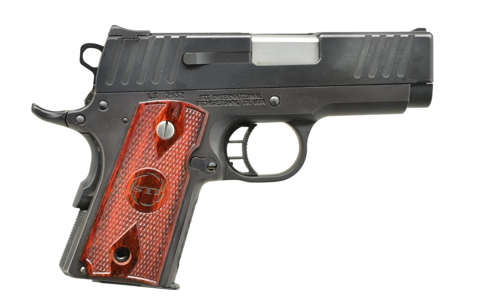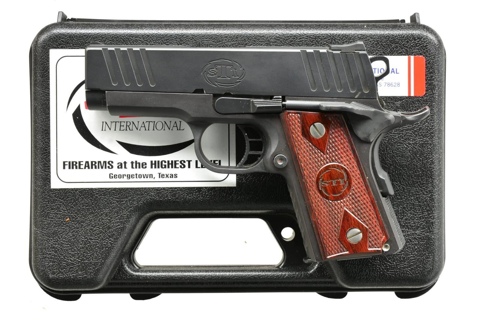 Cal. 9x19. S# LS2652. Bbl. 3.4". Blade front sight w/ Heine square notch rear sight. Matte black finished frame & slide. Features include skeletonized trigger, Combat hammer, beavertail grip safety, left side thumb safety, checkered mainspring housing & deeply stippled front grip strap. 2 Piece checkered wood grips w/ STI medallions. MAGS: 3 detachable 7 rd. UNATTACHED ACCESSORIES: black molded box w/ matching number. CONDITION: over 98% finish. Bright near excellent bore w/ strong rifling. (21-334/DS). MODERN. $600-800.
