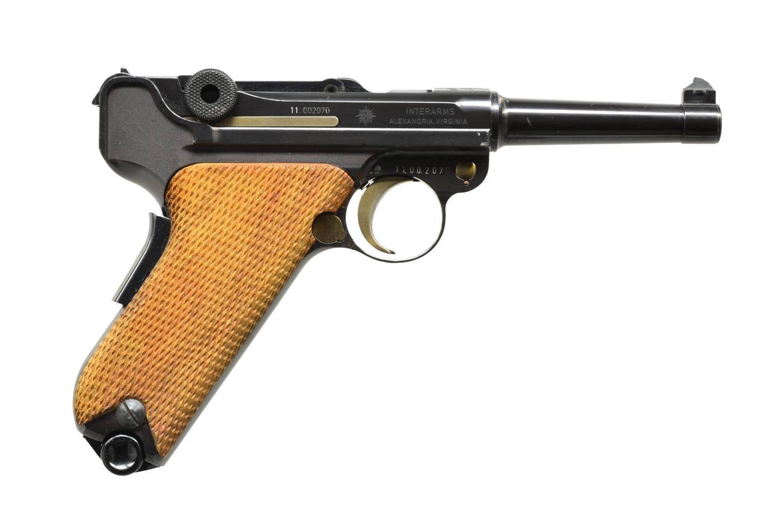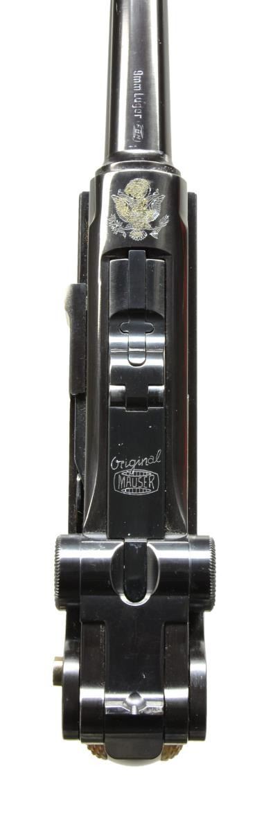 AUTO PISTOL. Cal. 9mm Luger. S# 11.00.2070. Bbl. 4" w/ saw tooth blade front sight. Mfg. in Germany by Mauser & imported by Interarms; marked on right side of receiver also having matching S#. Mfg. 1970 to mid 1970's. Mauser banner on left front frame rail & on front toggle along w/ word "Original". Swiss style frame w/ straight front strap having Mauser mfg. marks. American eagle over chamber. Top of bbl. marked "9mm Luger"; left frame flat w/ "MAUSER PARABELLUM" over '9mm Luger". Rear of frame w/ Swiss style grip safety plus marked "Made in Germany". Strawed sm. parts, same as original Lugers; safety bar w/ arched top. MAGS: 2 near excellent 8 rd. TOTAL; blued w/ plastic base original to pistol plus stainless appearing aftermarket w/ wood base. UNATTACHED ACCESSORIES: very attractive walnut glass topped case w/ shadow line cutout for pistol & spare mag. having sprayed on red velvet like material; brass hardware plus key. CONDITION: all aspects near excellent; appears new. (21-1496/NW). MODERN. $800-1,200.